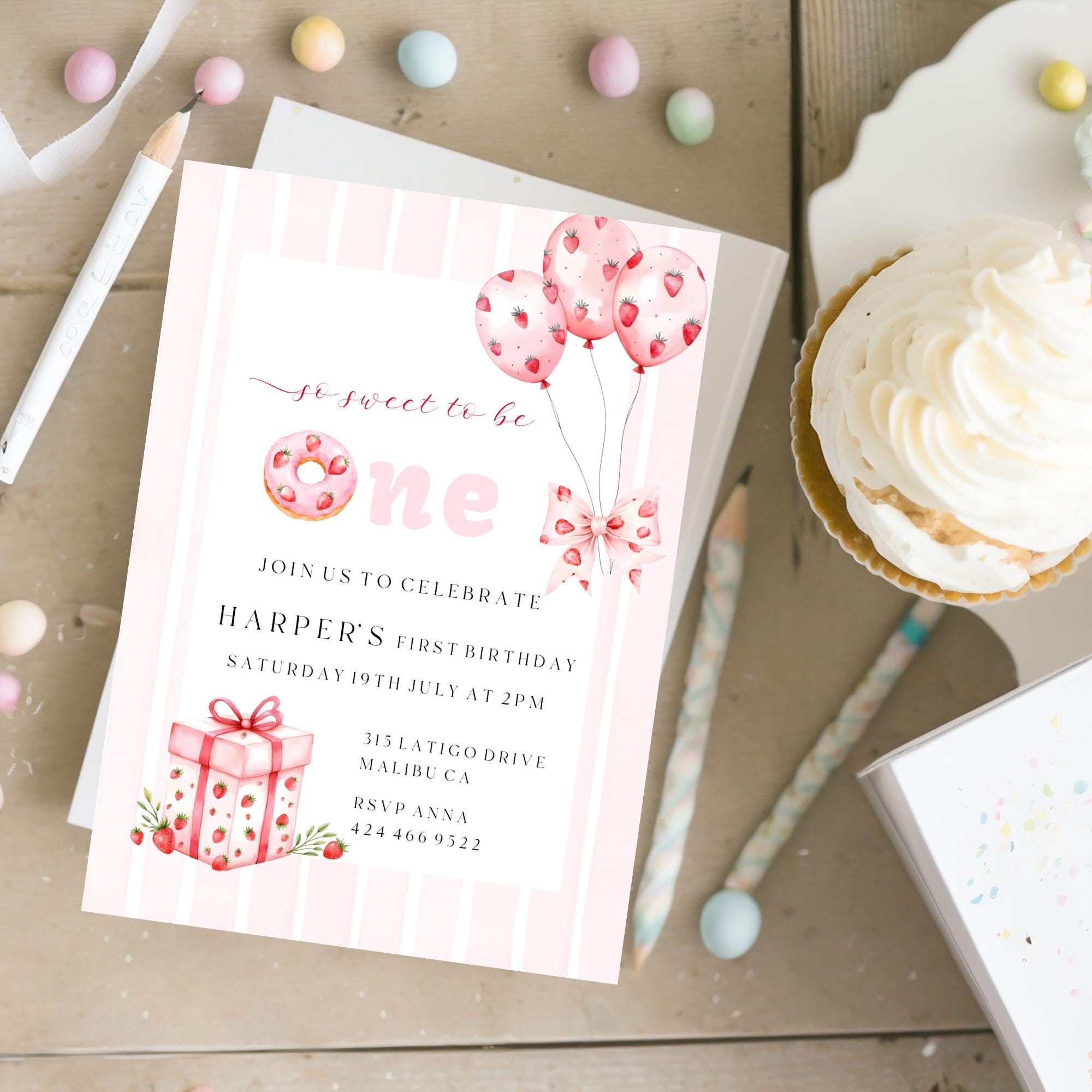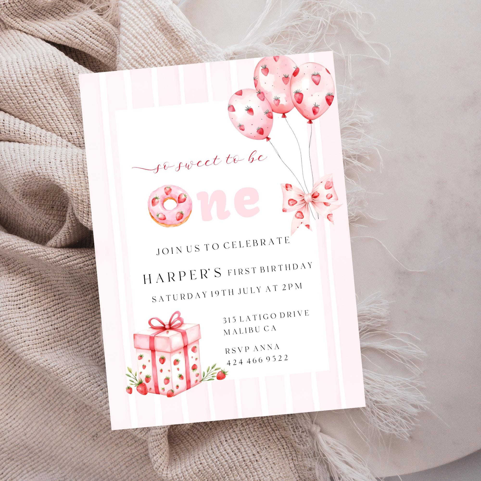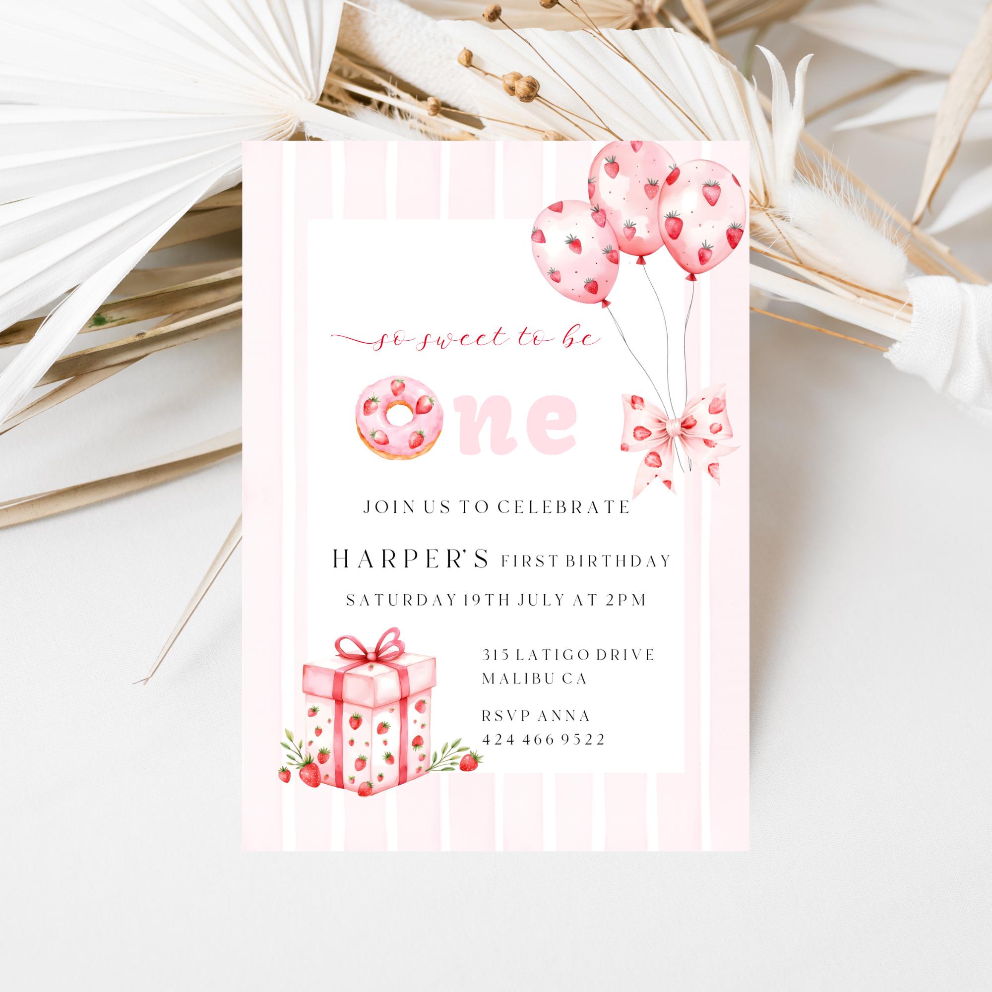 Strawberry First Birthday Invitation Template. An Instant download digital file for you to edit in your web browser with Templett straight after your purchase. Once personalized you are ready to print.