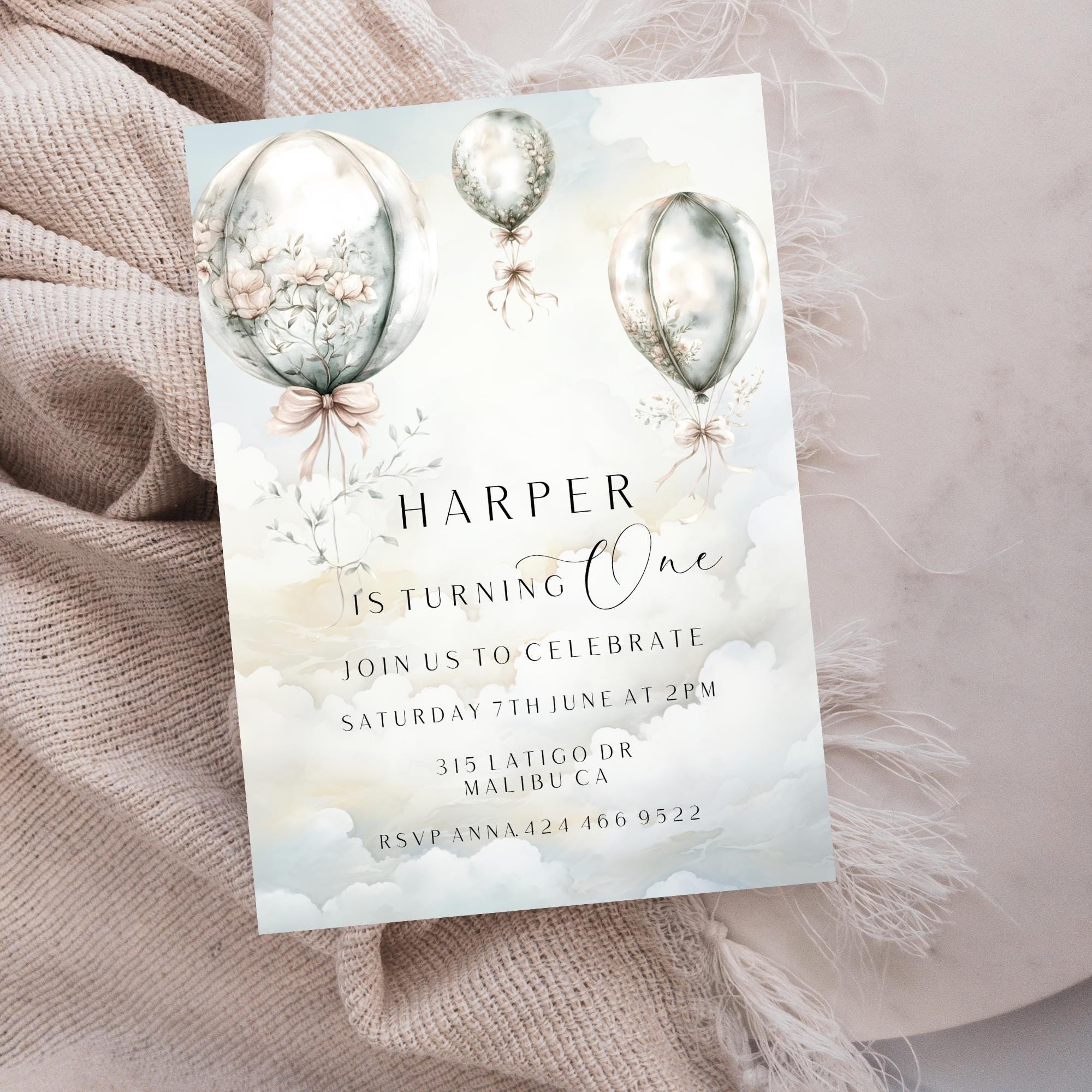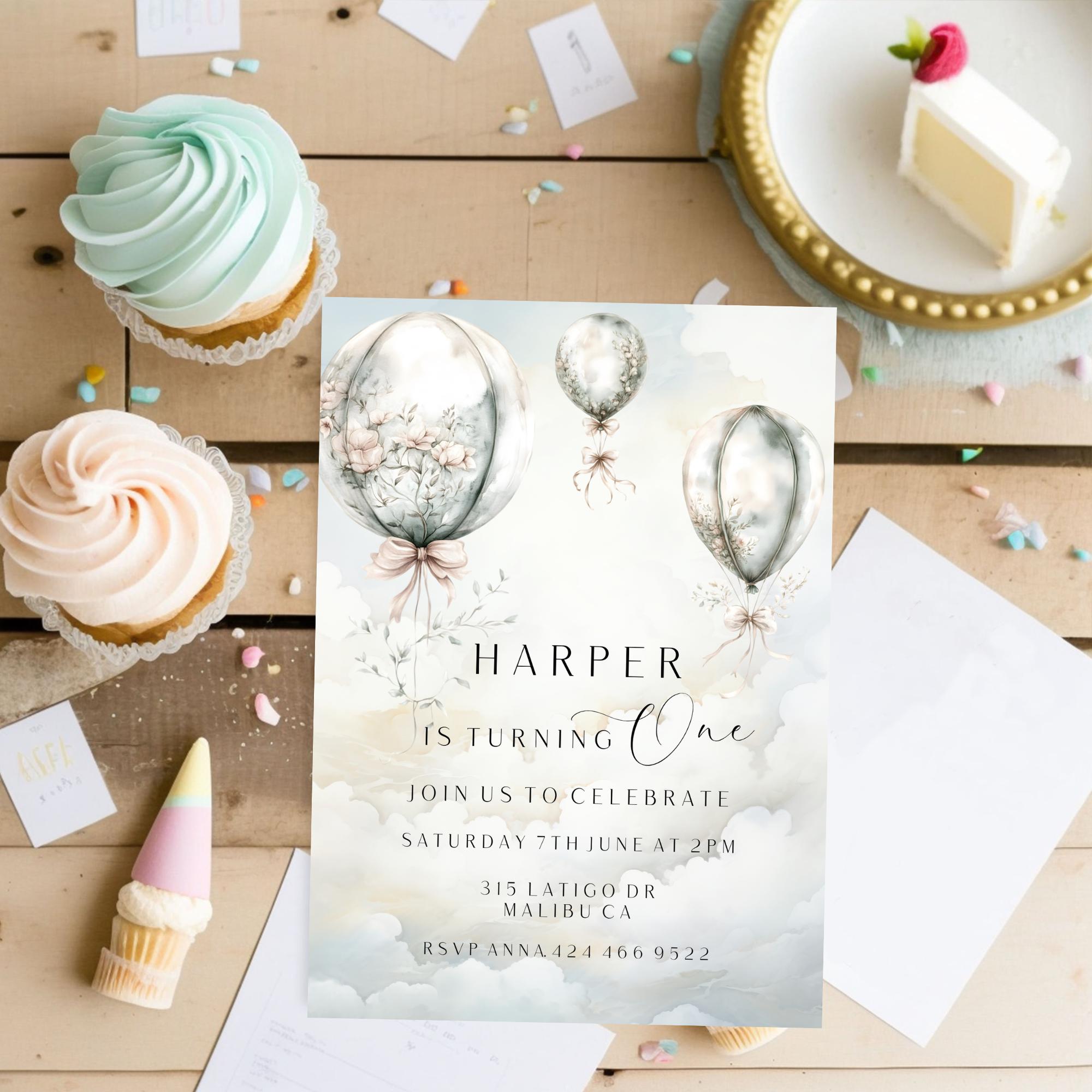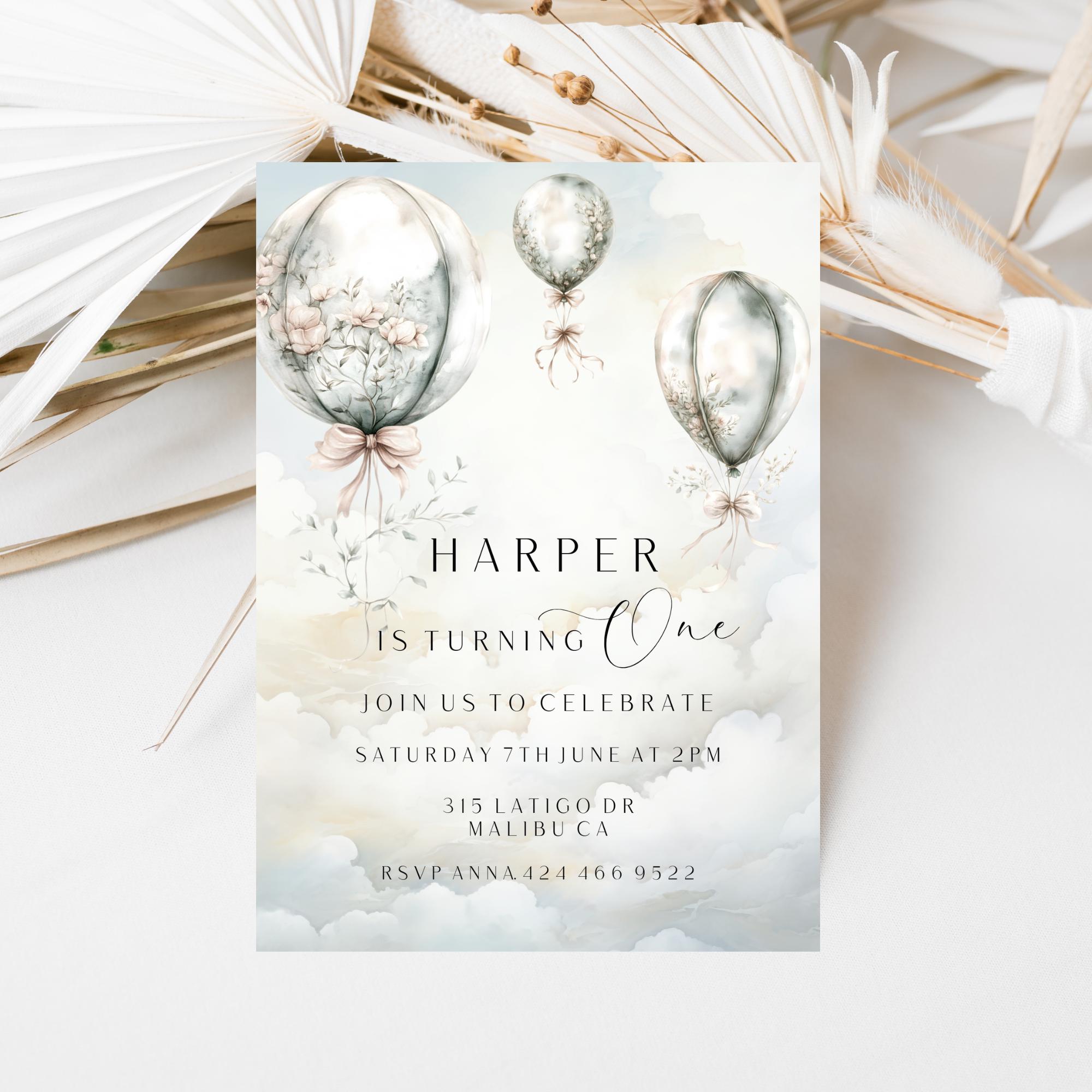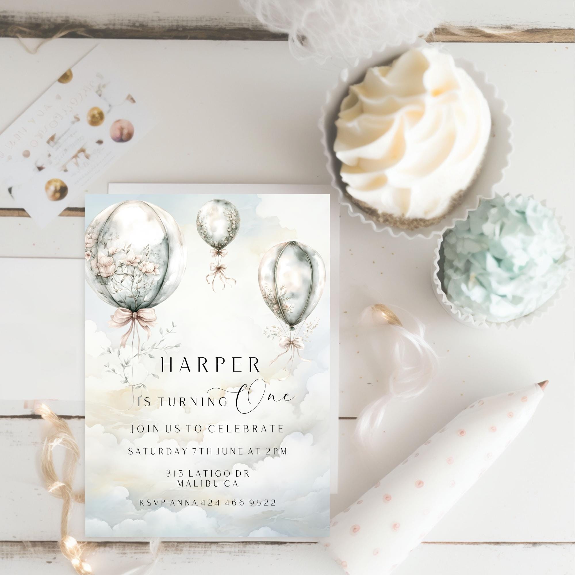 Vintage Balloons First Birthday Invitation Template. An Instant download digital file for you to edit in your web browser with Templett straight after your purchase. Once personalized you are ready to print.