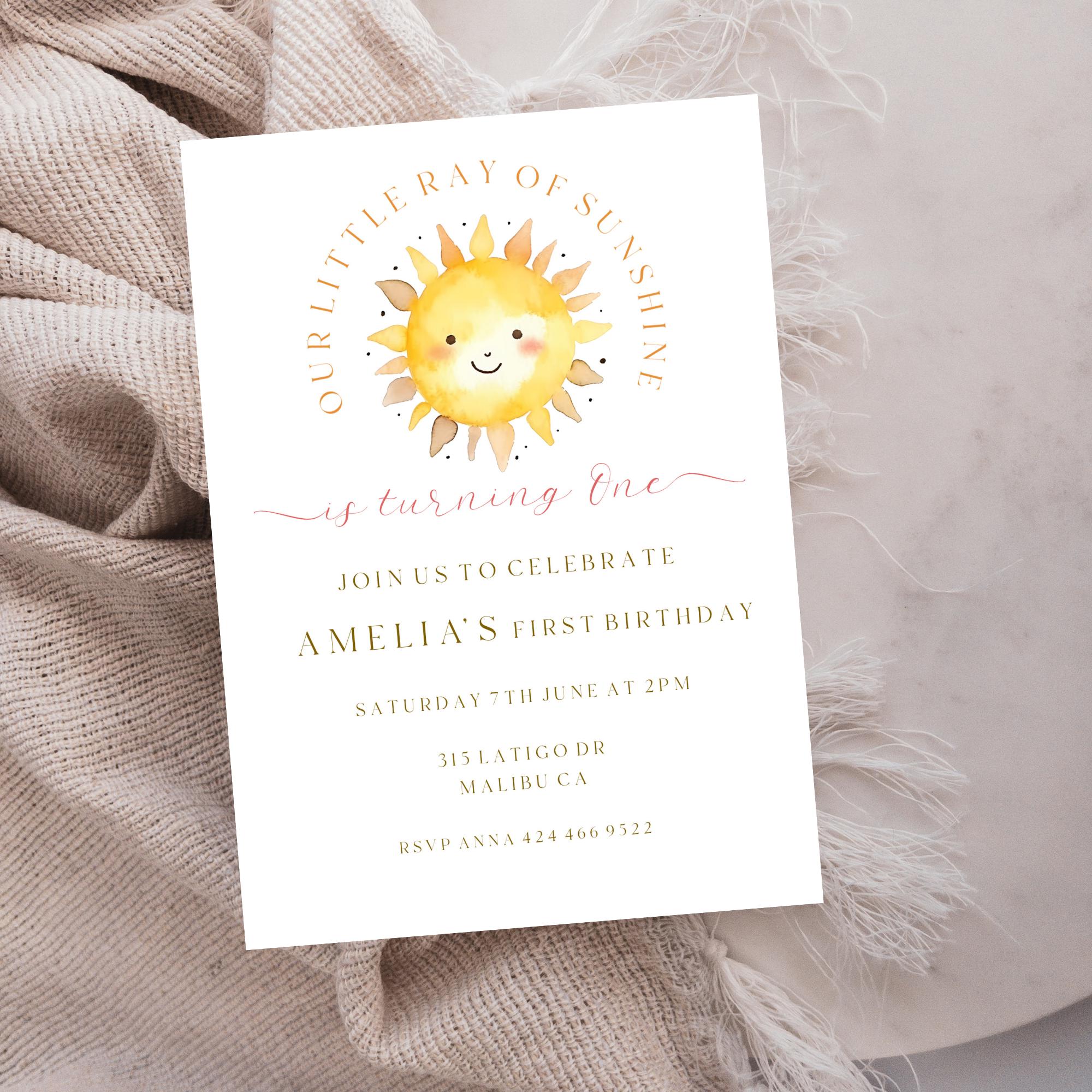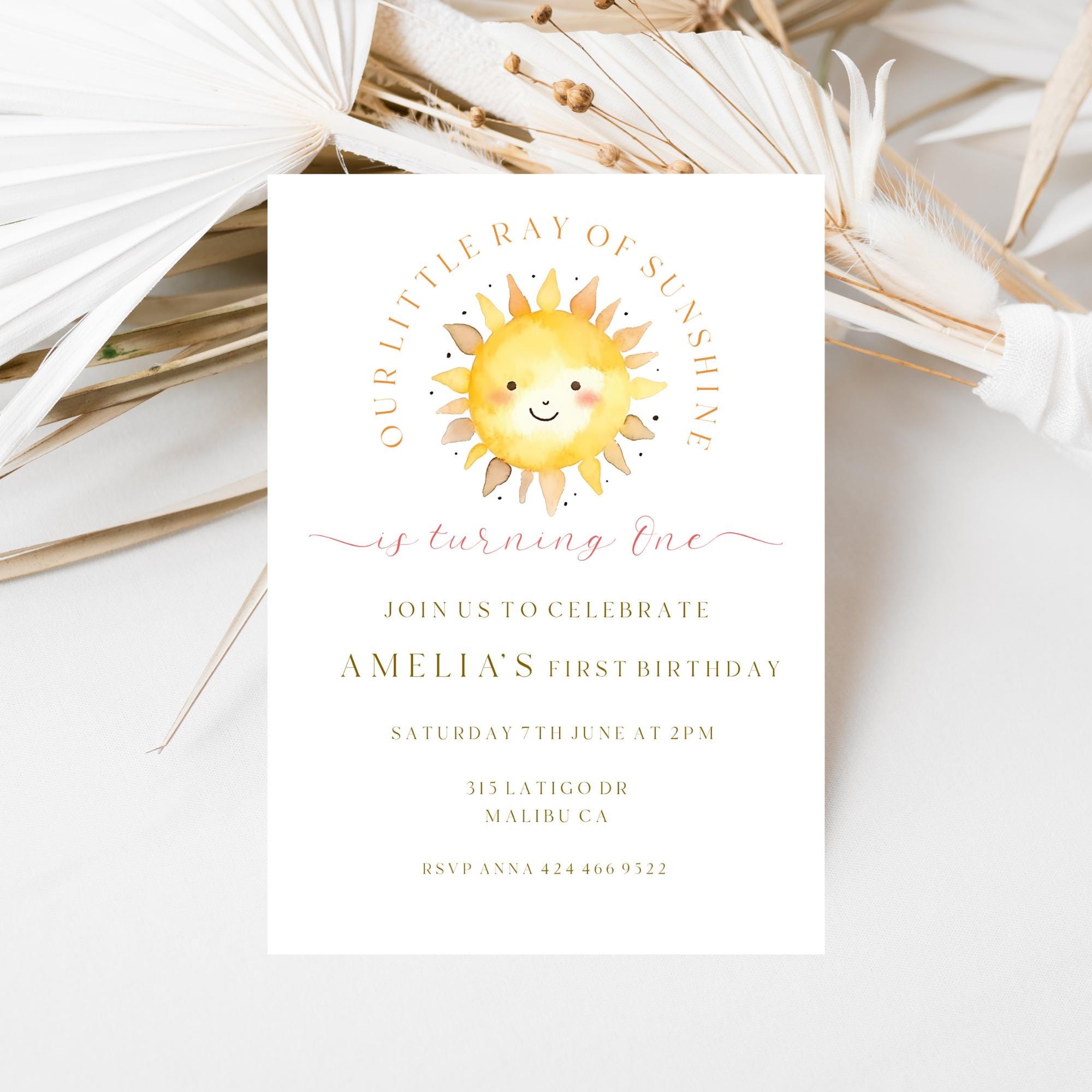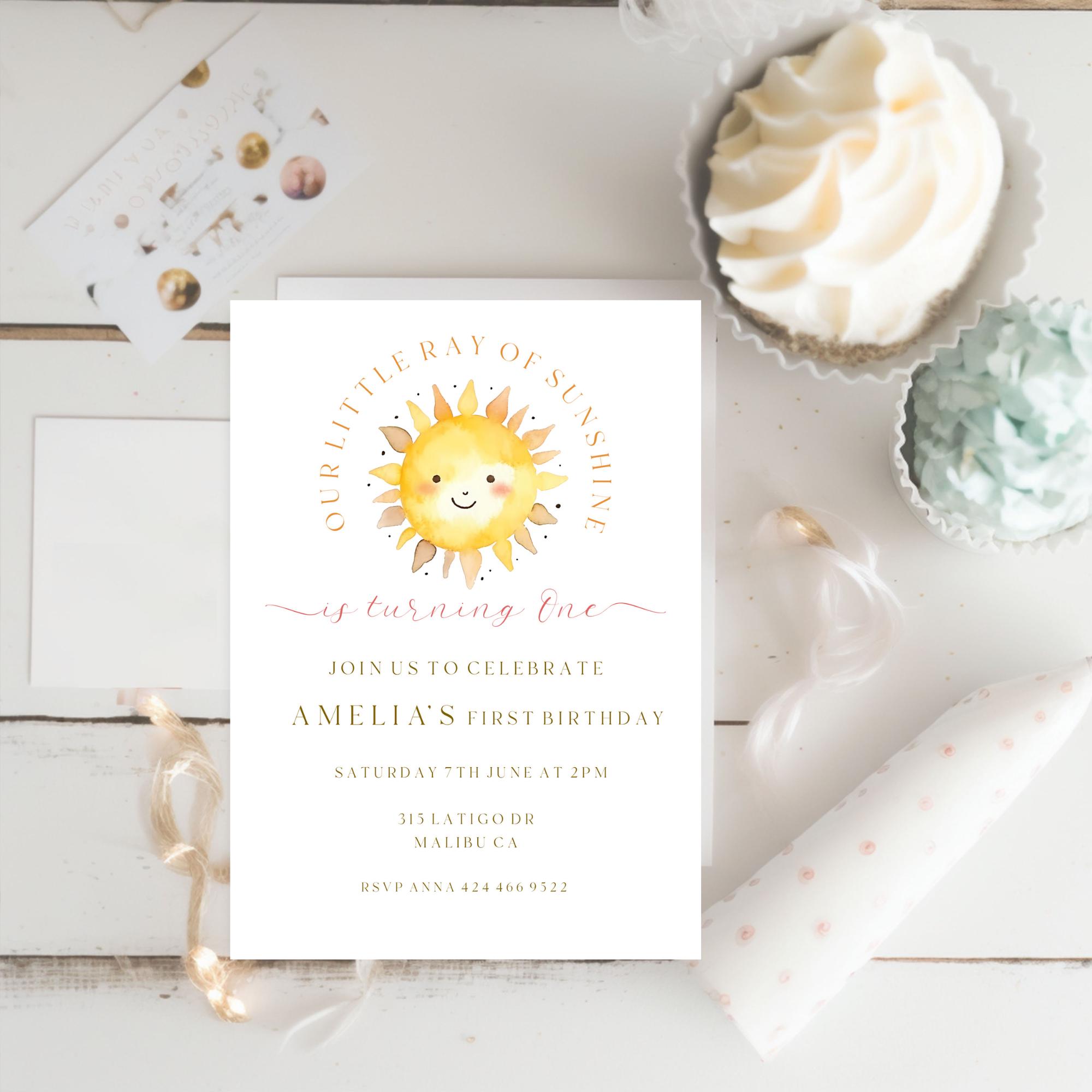 Sunshine Birthday Party Invitation Template. An Instant download digital file for you to edit in your web browser with Templett straight after your purchase. Once personalized you are ready to print.
