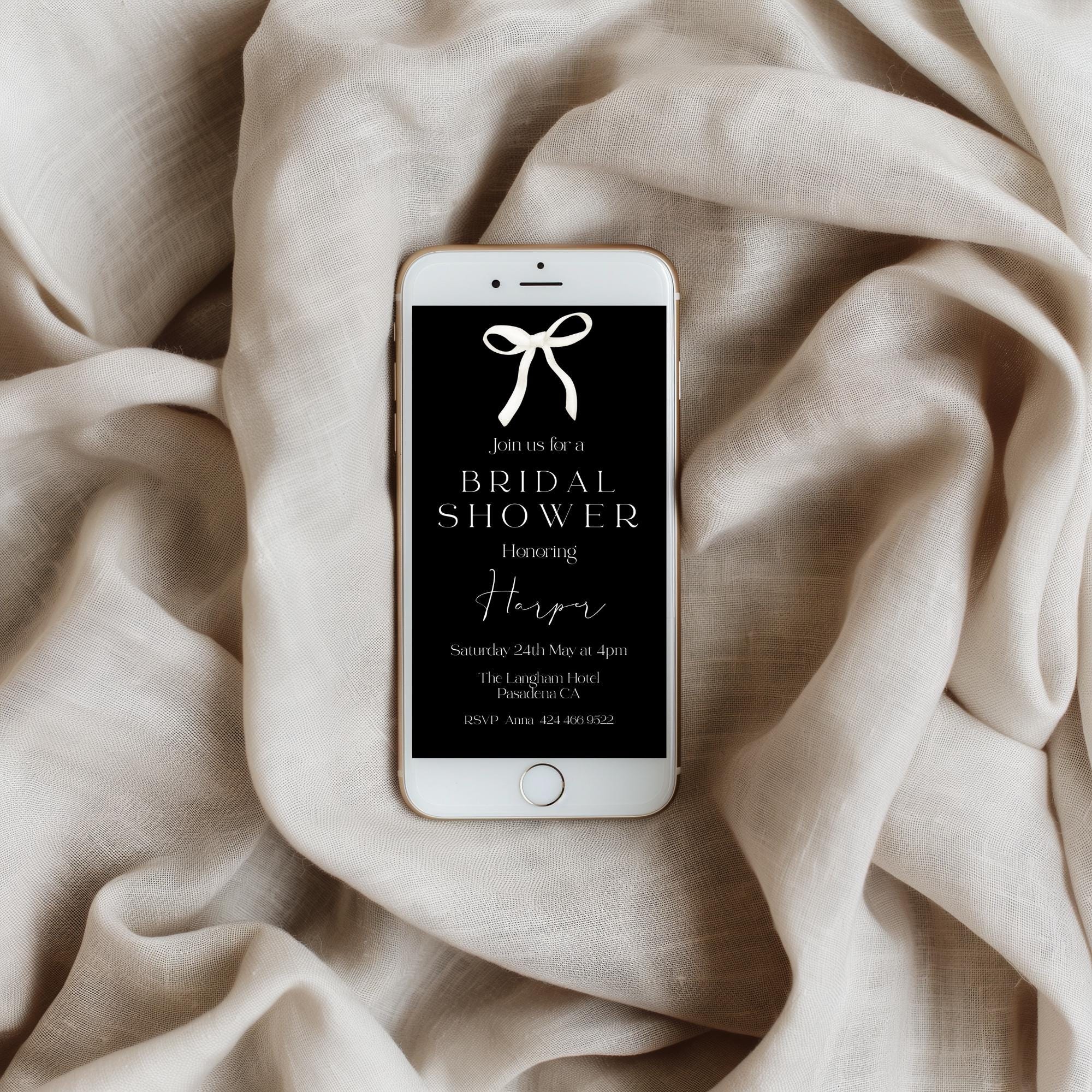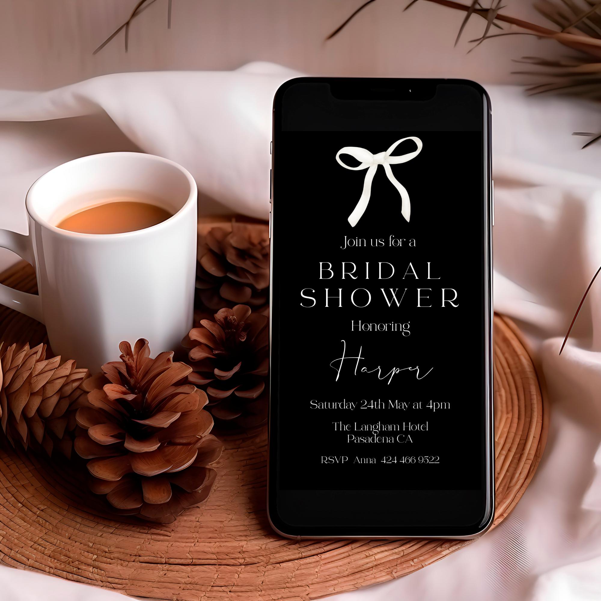 Modern White Bow Bridal Shower Evite Template. An Instant download digital file for you to edit in your web browser with Templett straight after your purchase. Once personalized you are ready to send.