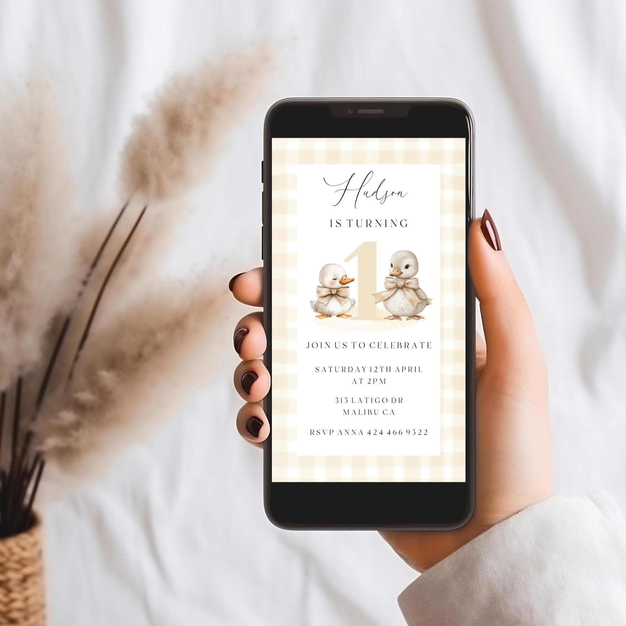 Duckling First Birthday Evite Template. An Instant download digital file for you to edit in your web browser with Templett straight after your purchase. Once personalized you are ready to send.