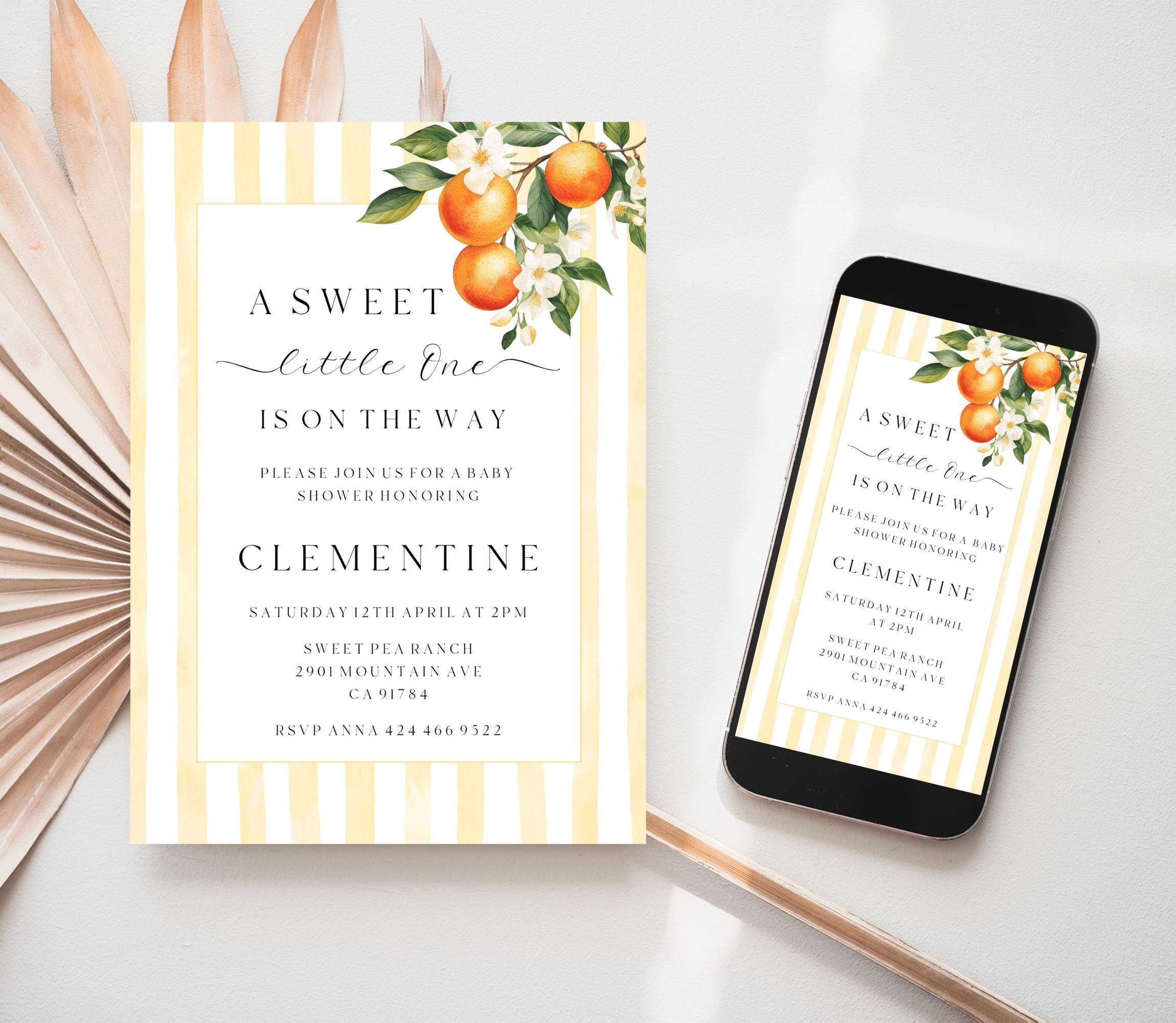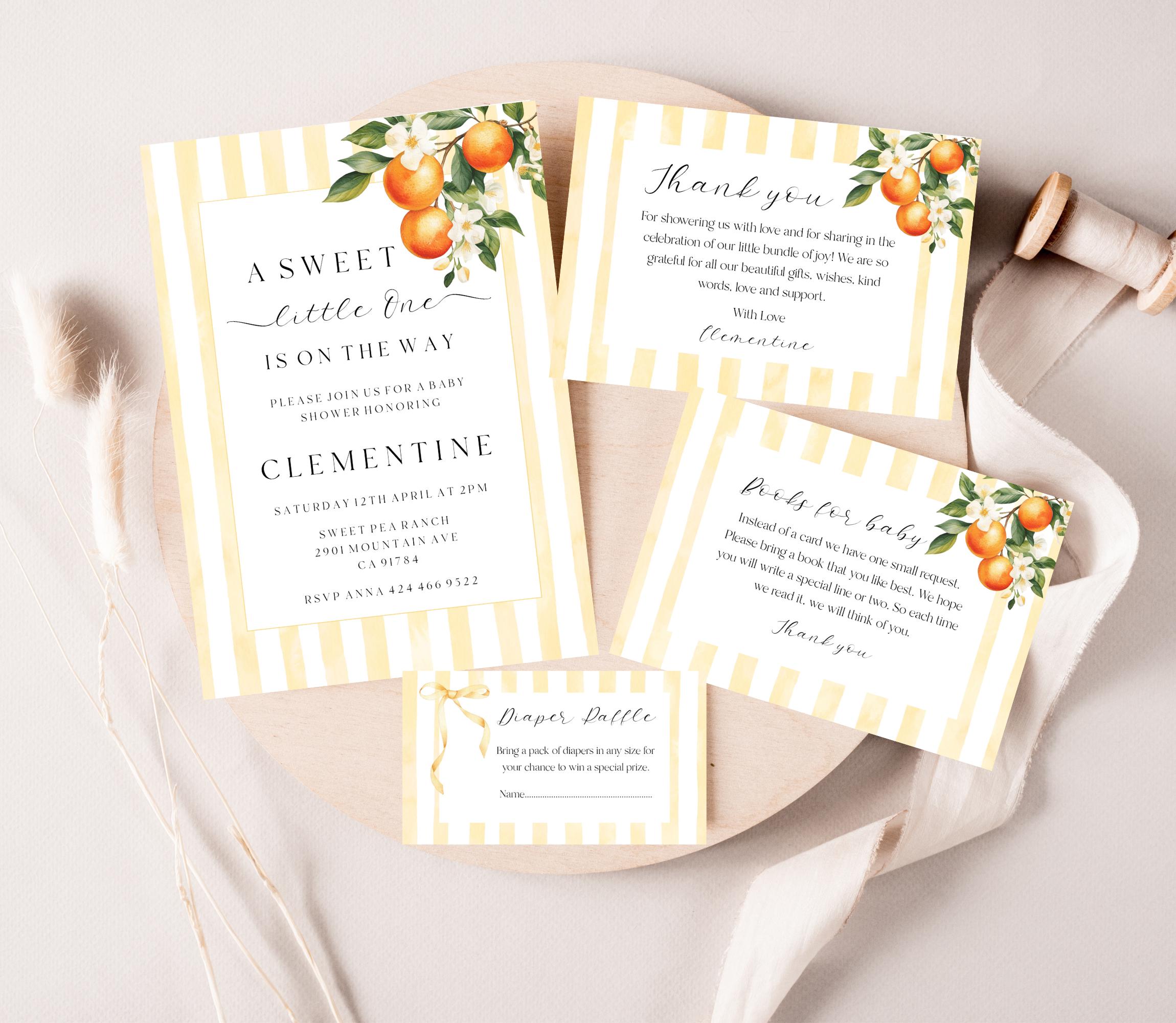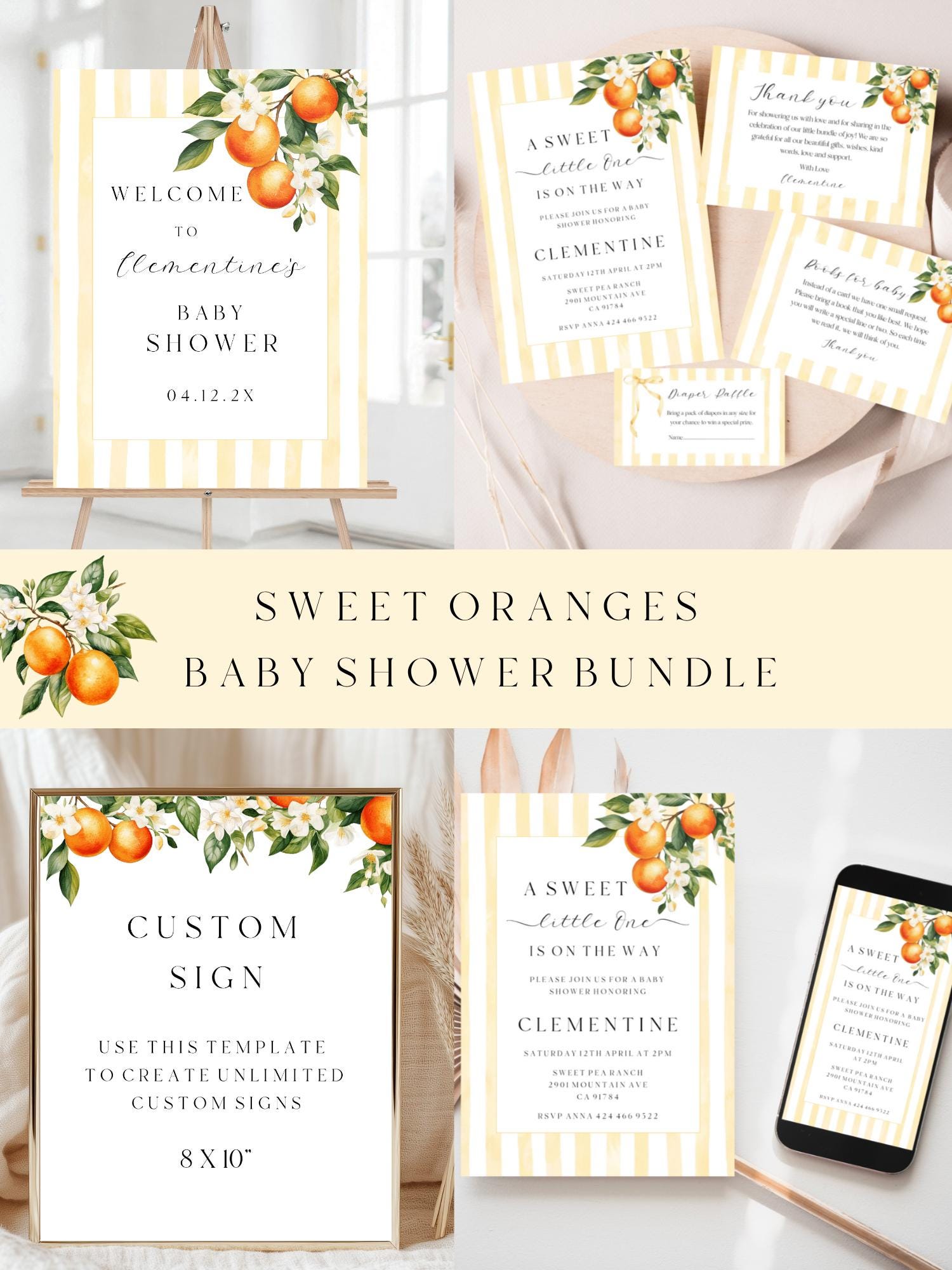 Sweet Oranges Baby Shower Template Bundle. An Instant download digital file for you to edit in your web browser with Templett straight after your purchase. Once personalized you are ready to print.