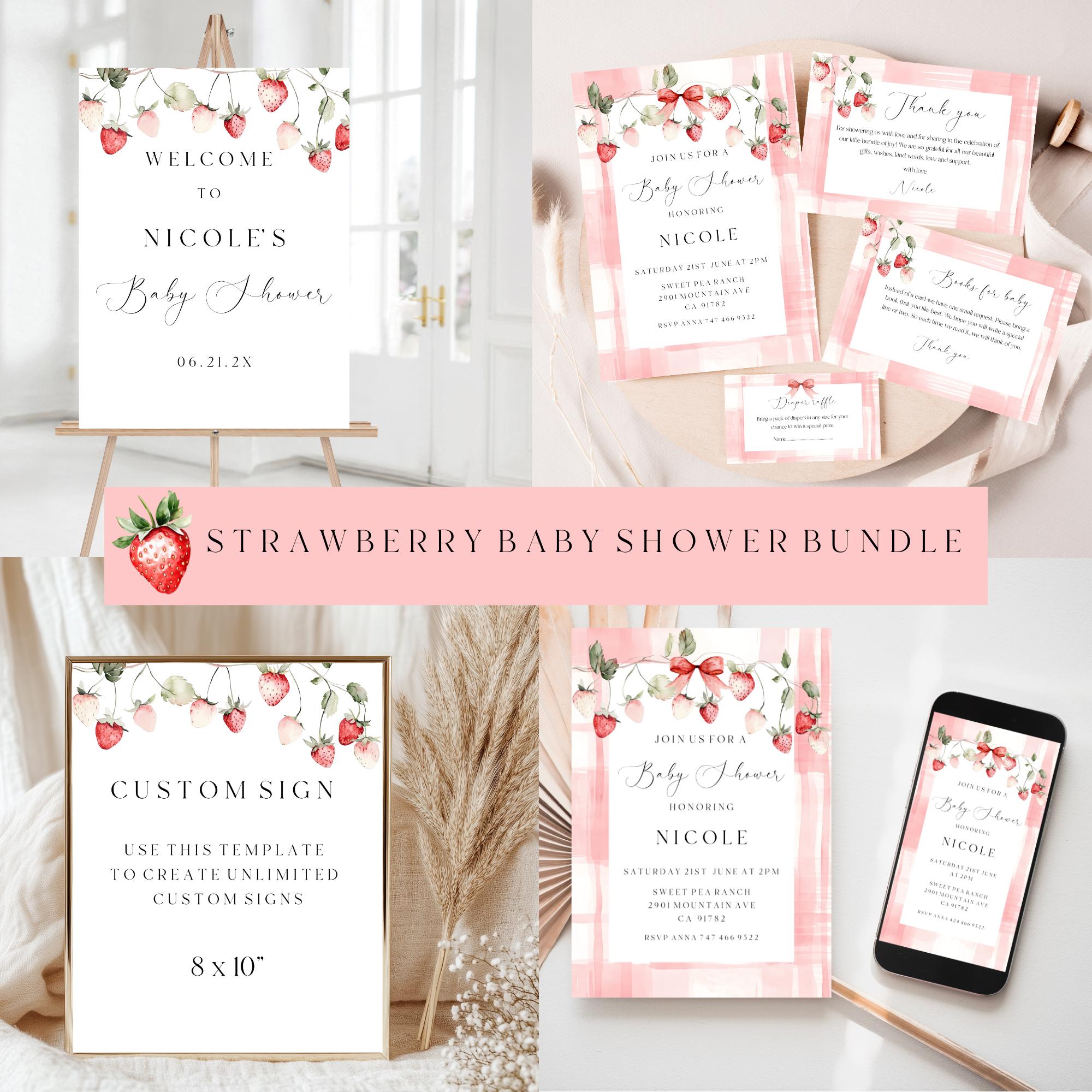 Wild Strawberry Baby Shower Invitation Bundle Templates. An Instant download digital file for you to edit in your web browser with Templett straight after your purchase. Once personalized you are ready to print.