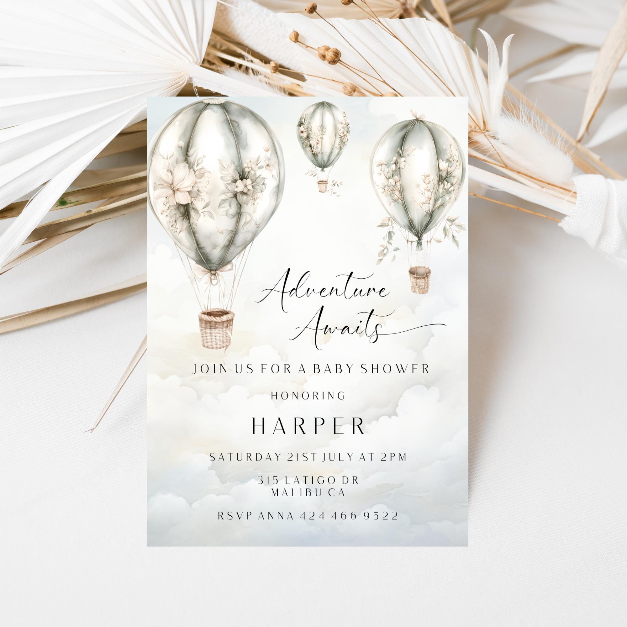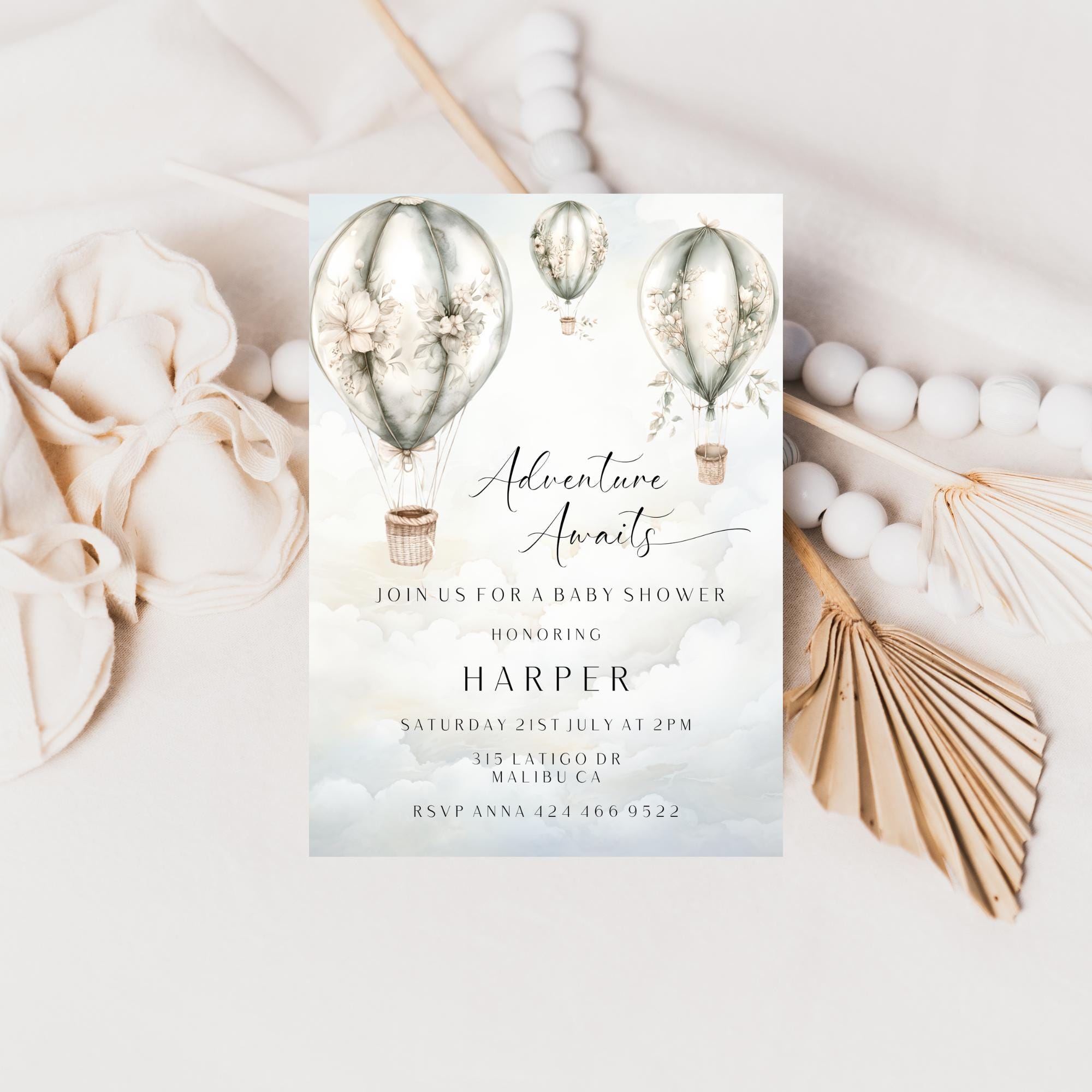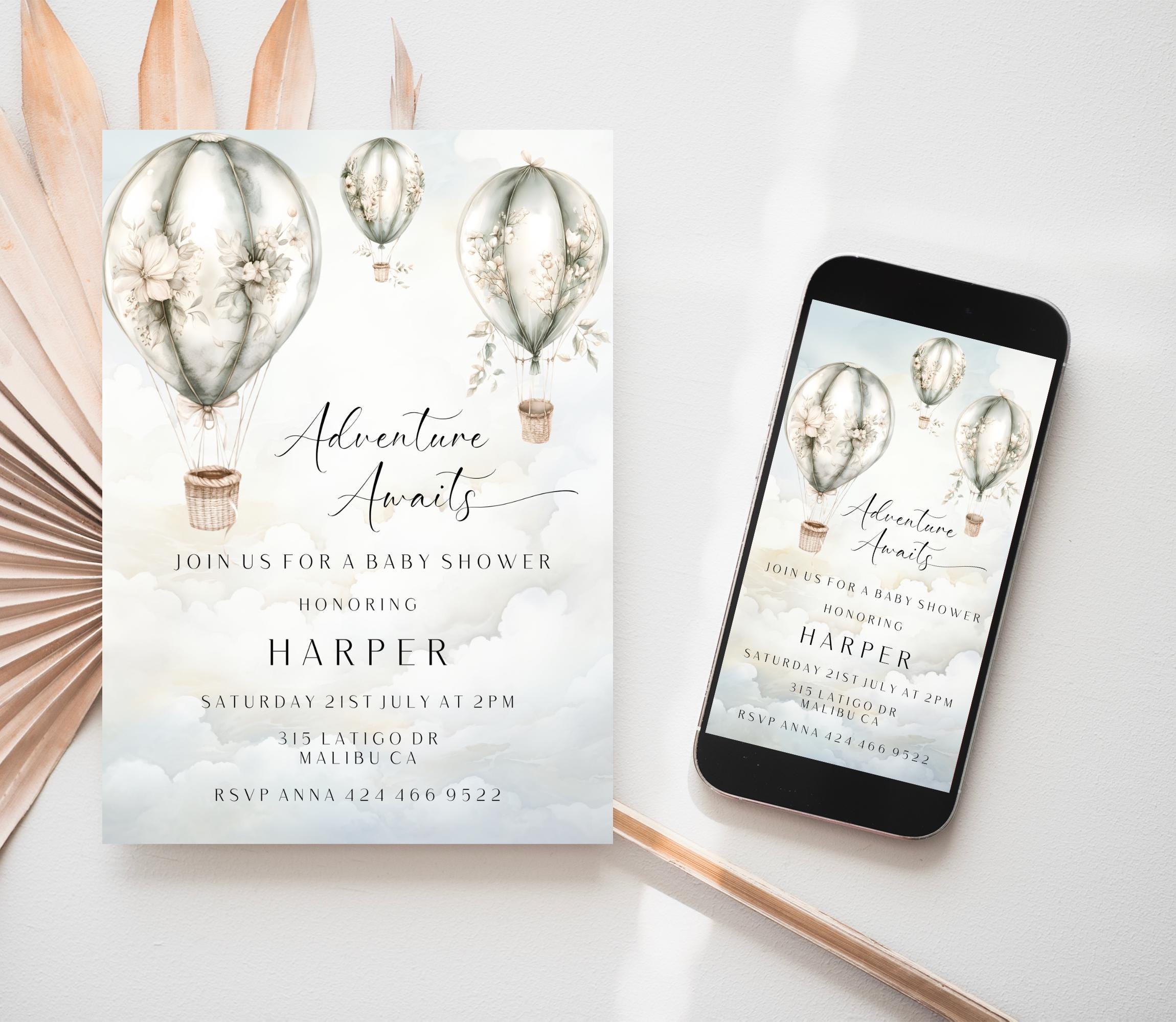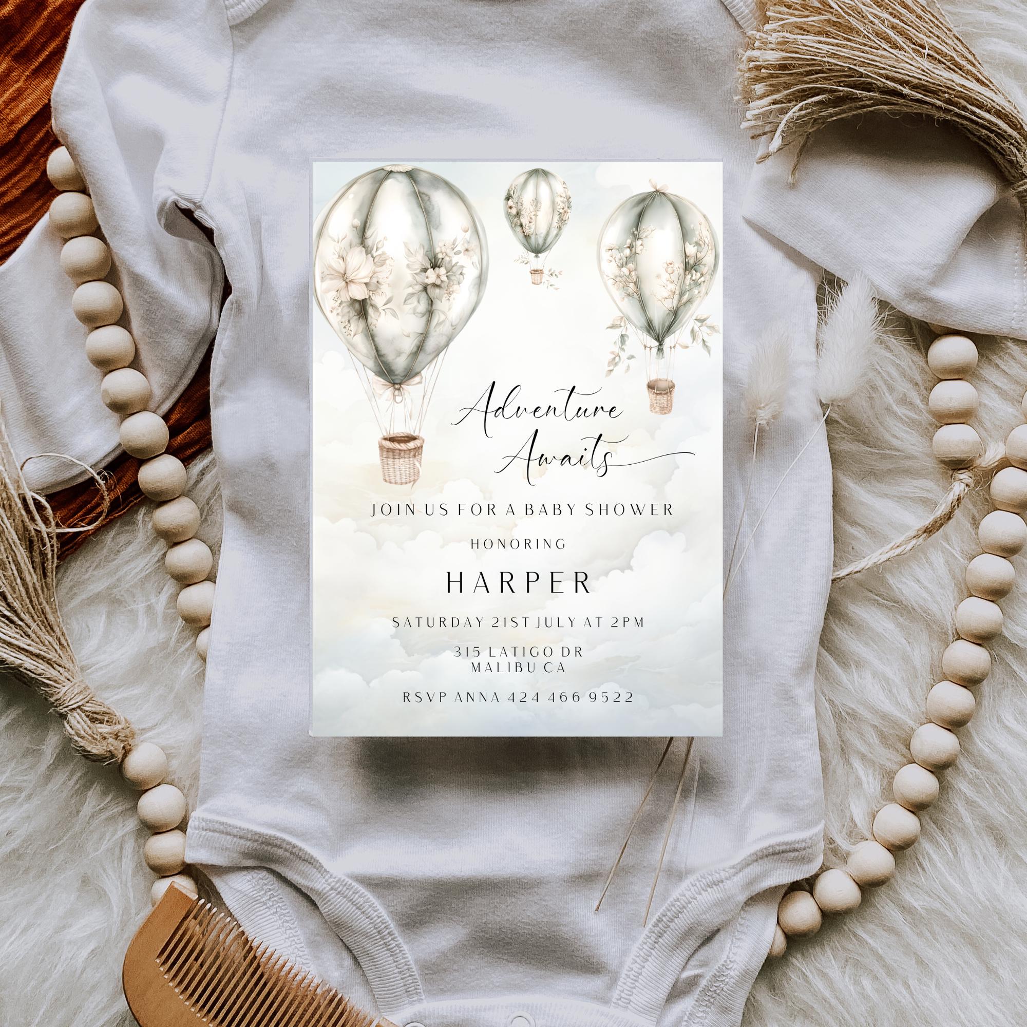 Gender Neutral Hot Air Balloon Baby Shower Invitation Template. An Instant download digital file for you to edit in your web browser with Templett straight after your purchase. Once personalized you are ready to print.