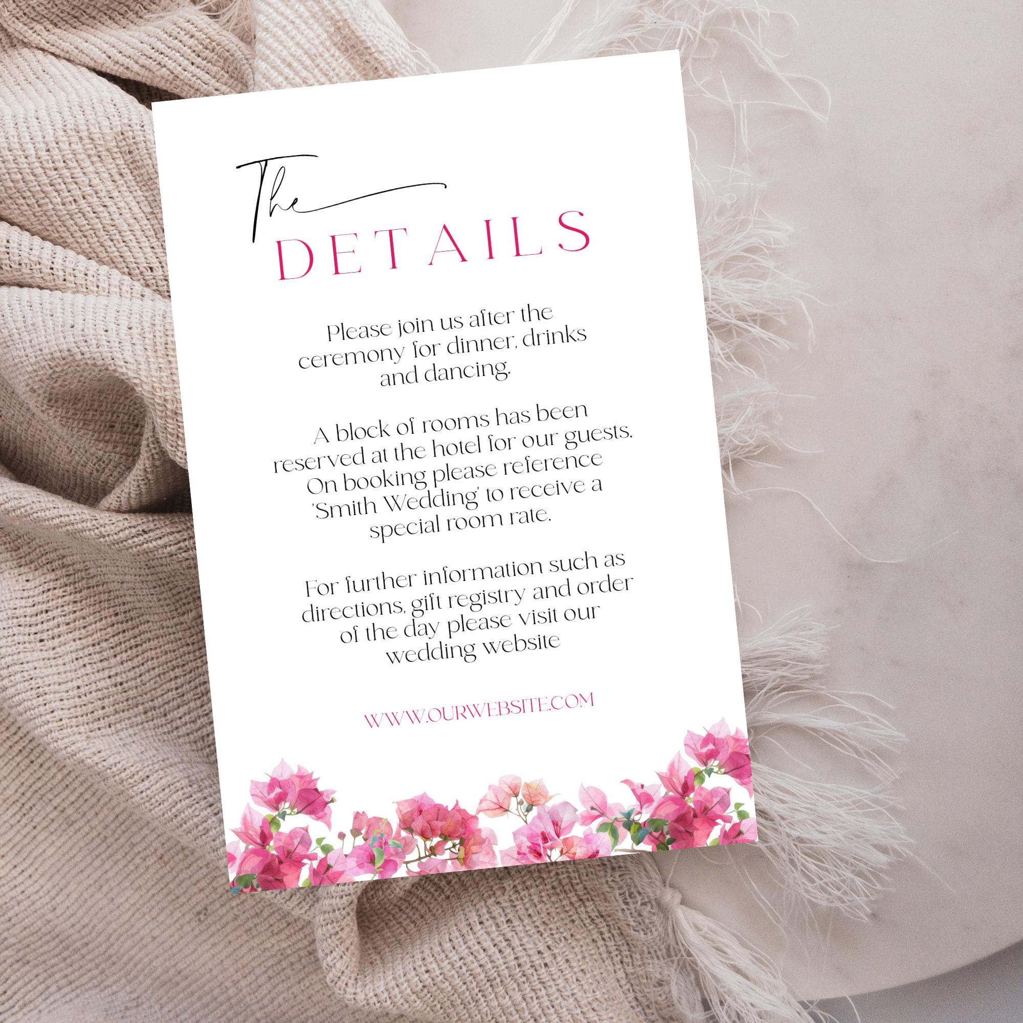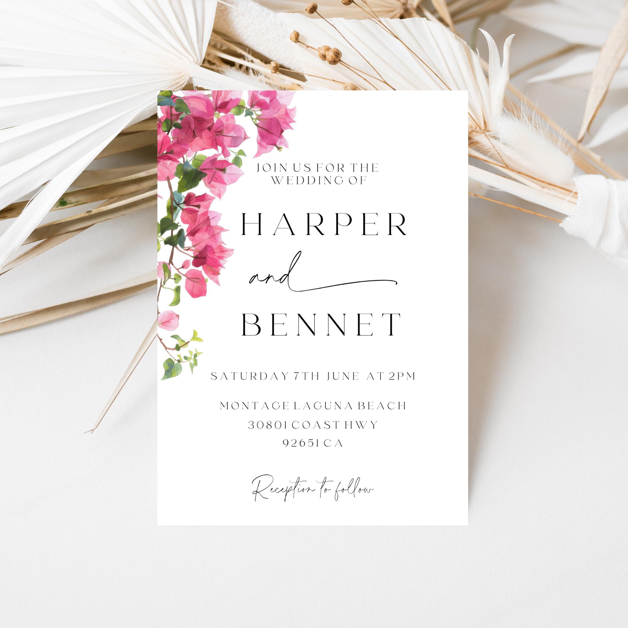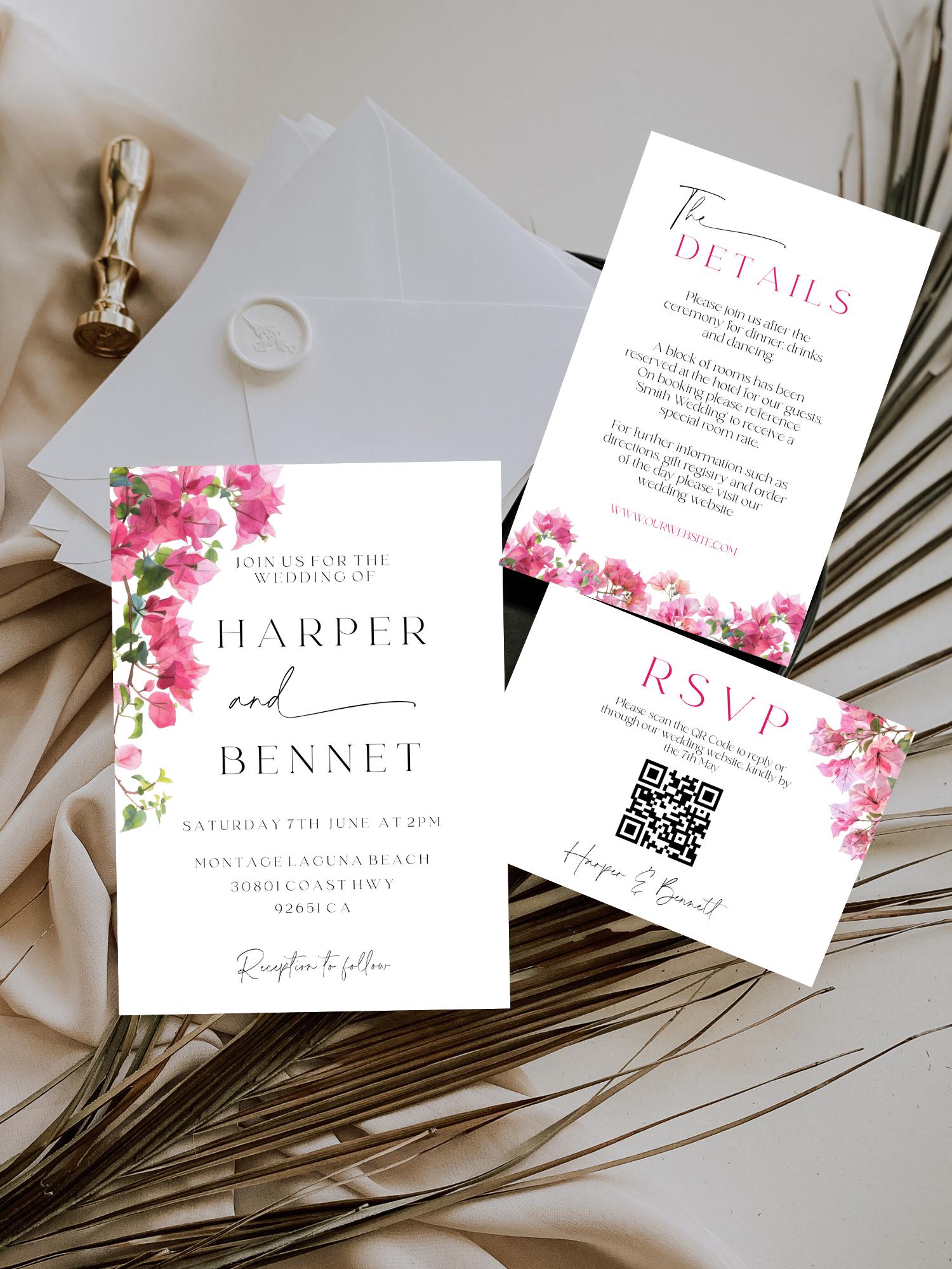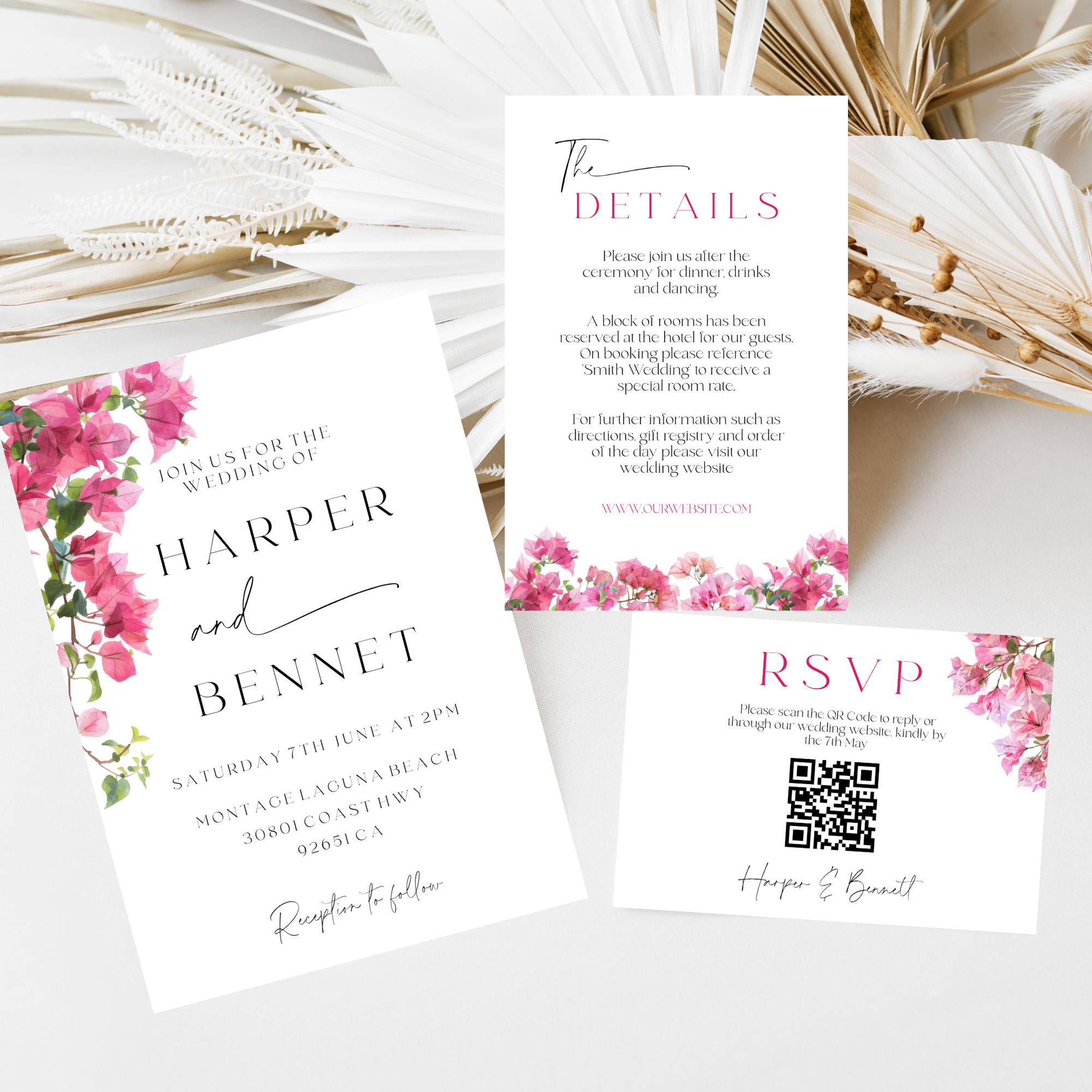 Modern Bougainvillea Wedding Invitation Suite Template. An Instant download digital file for you to edit in your web browser with Templett straight after your purchase. Once personalized you are ready to print.