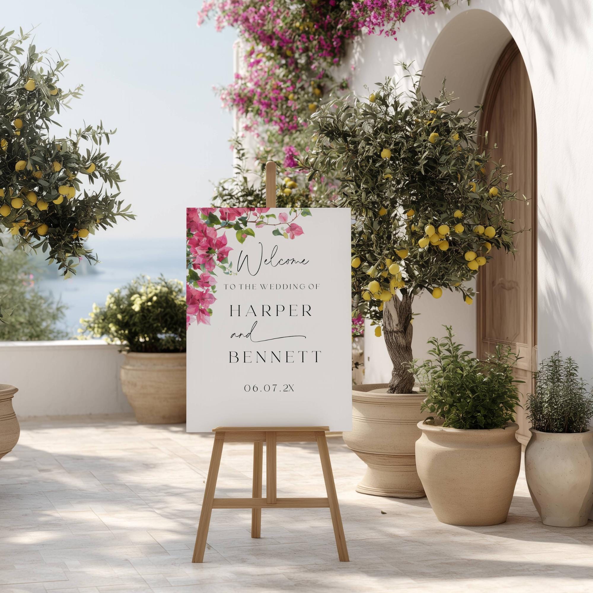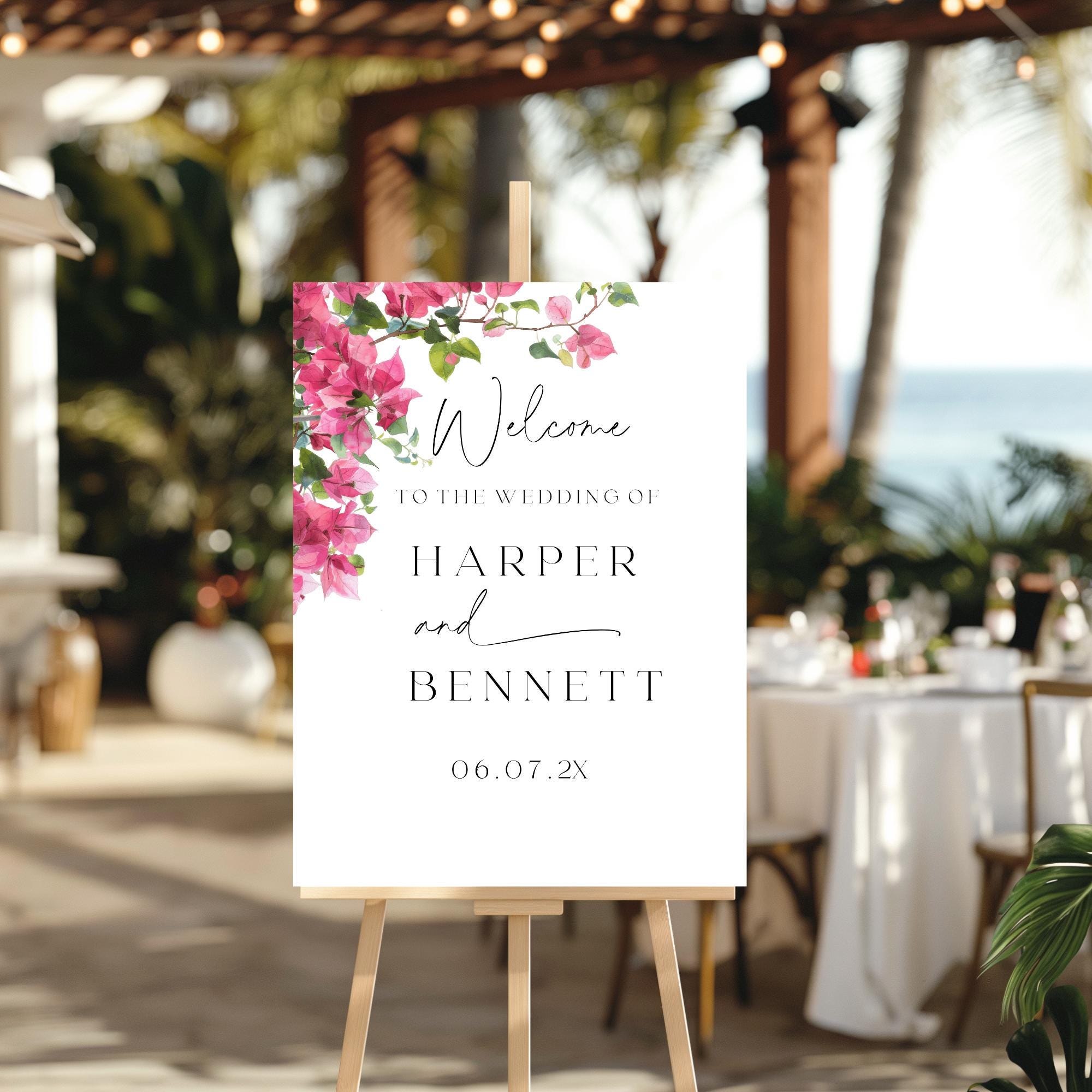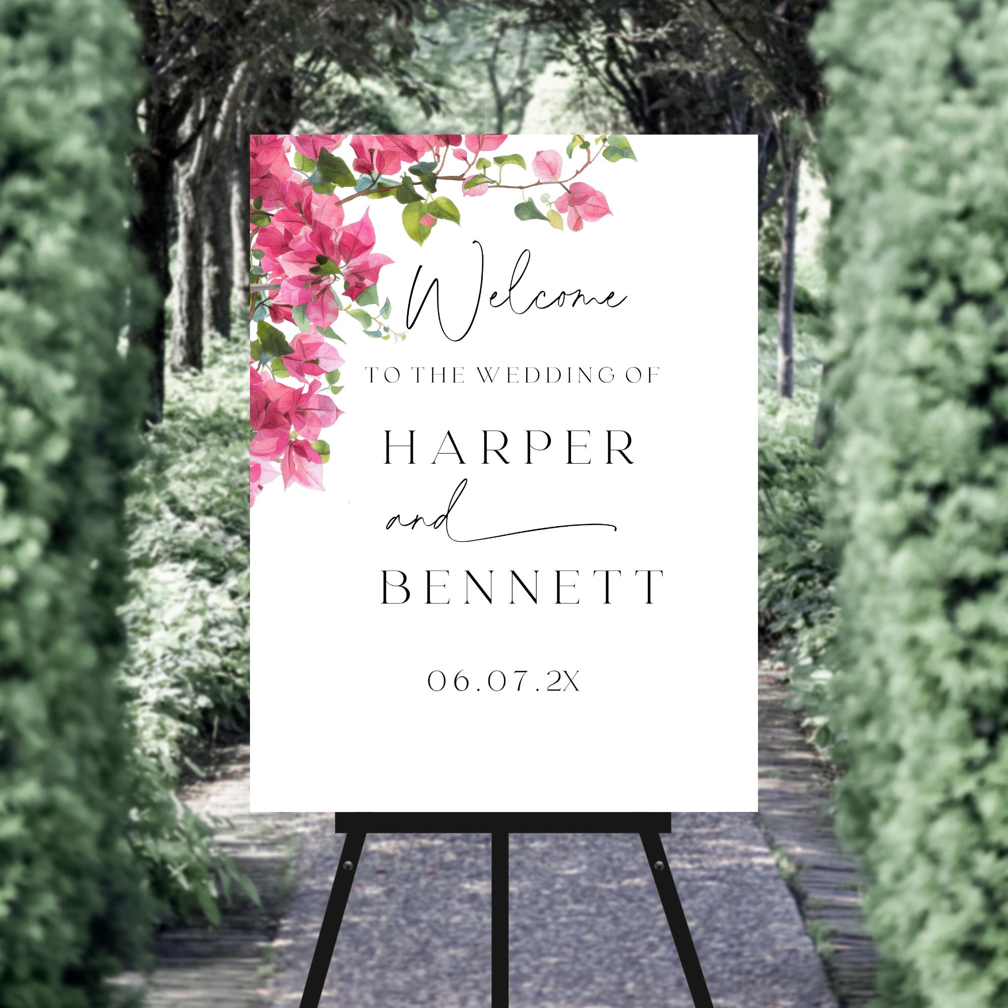 Modern Bougainvillea Wedding Welcome Sign Template. An Instant download digital file for you to edit in your web browser with Templett straight after your purchase. Once personalized you are ready to print.