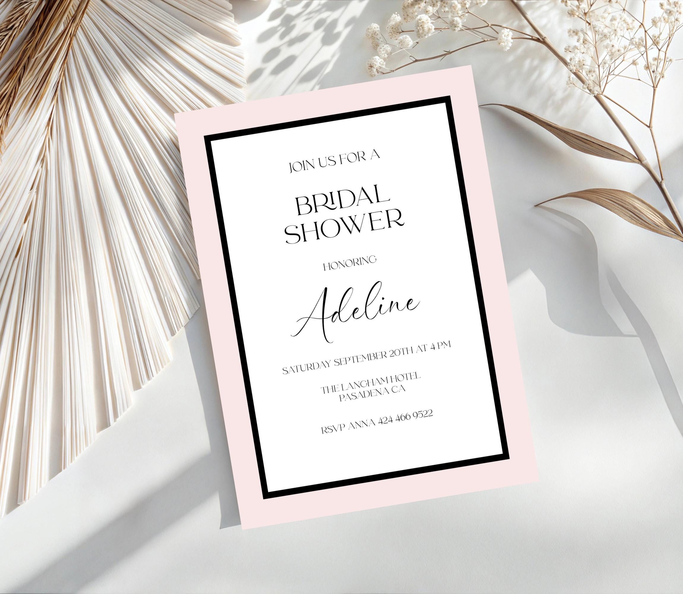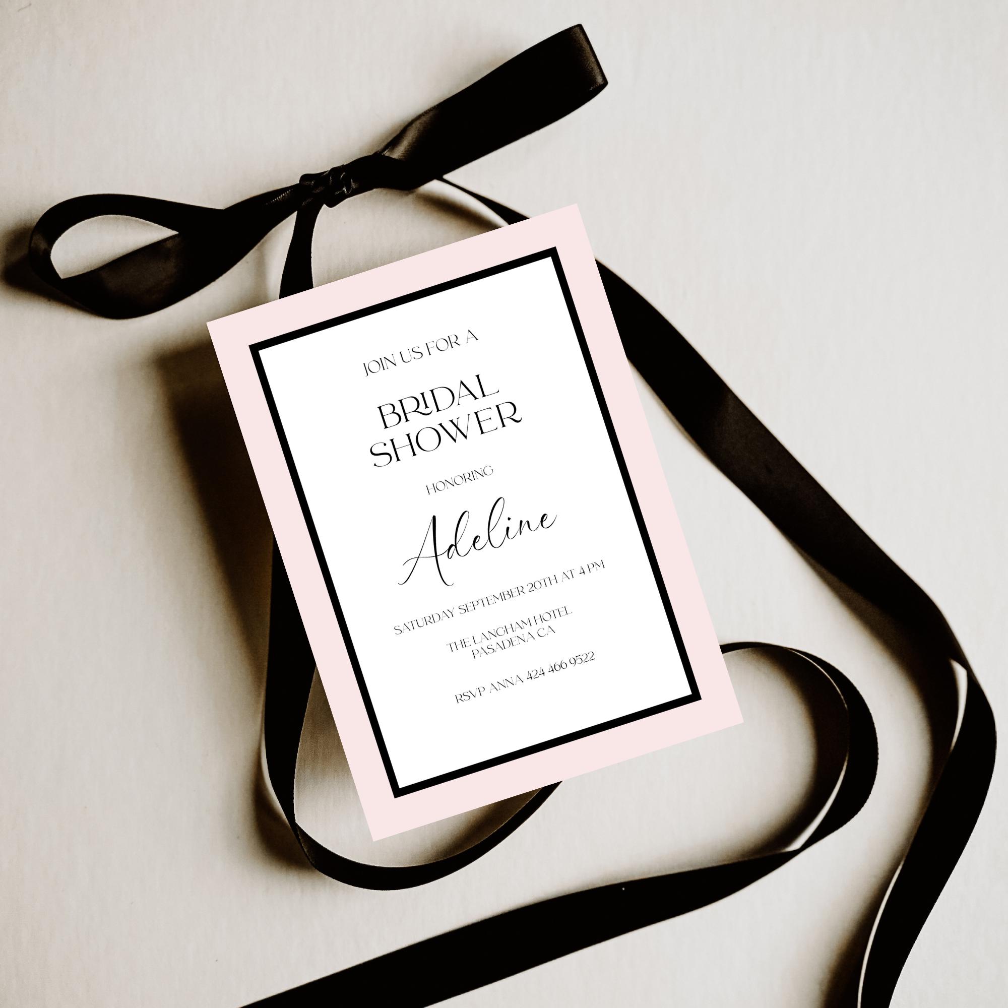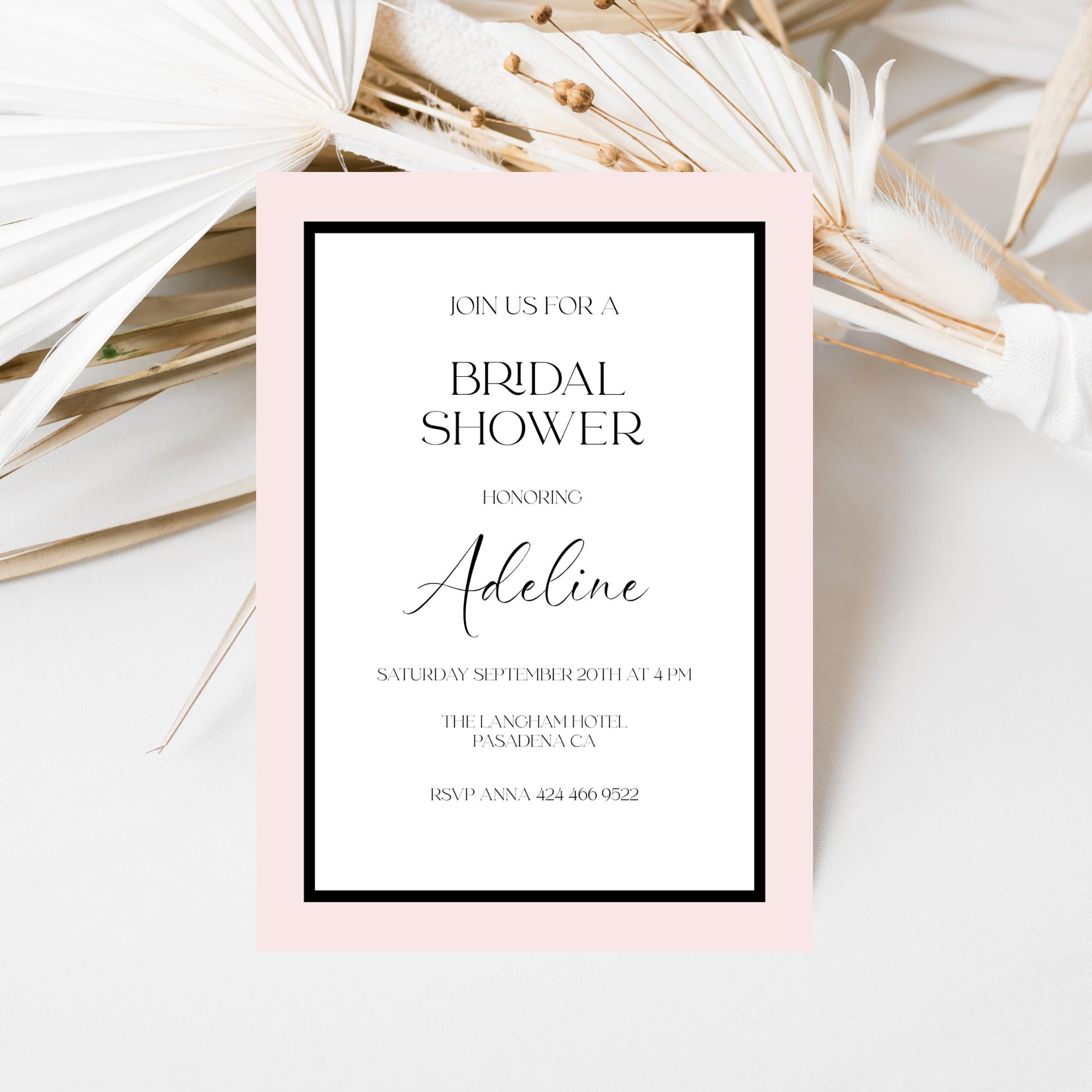 Modern Black and Pink Bridal Shower Invitation Template. An Instant download digital file for you to edit in your web browser with Templett straight after your purchase. Once personalized you are ready to print.