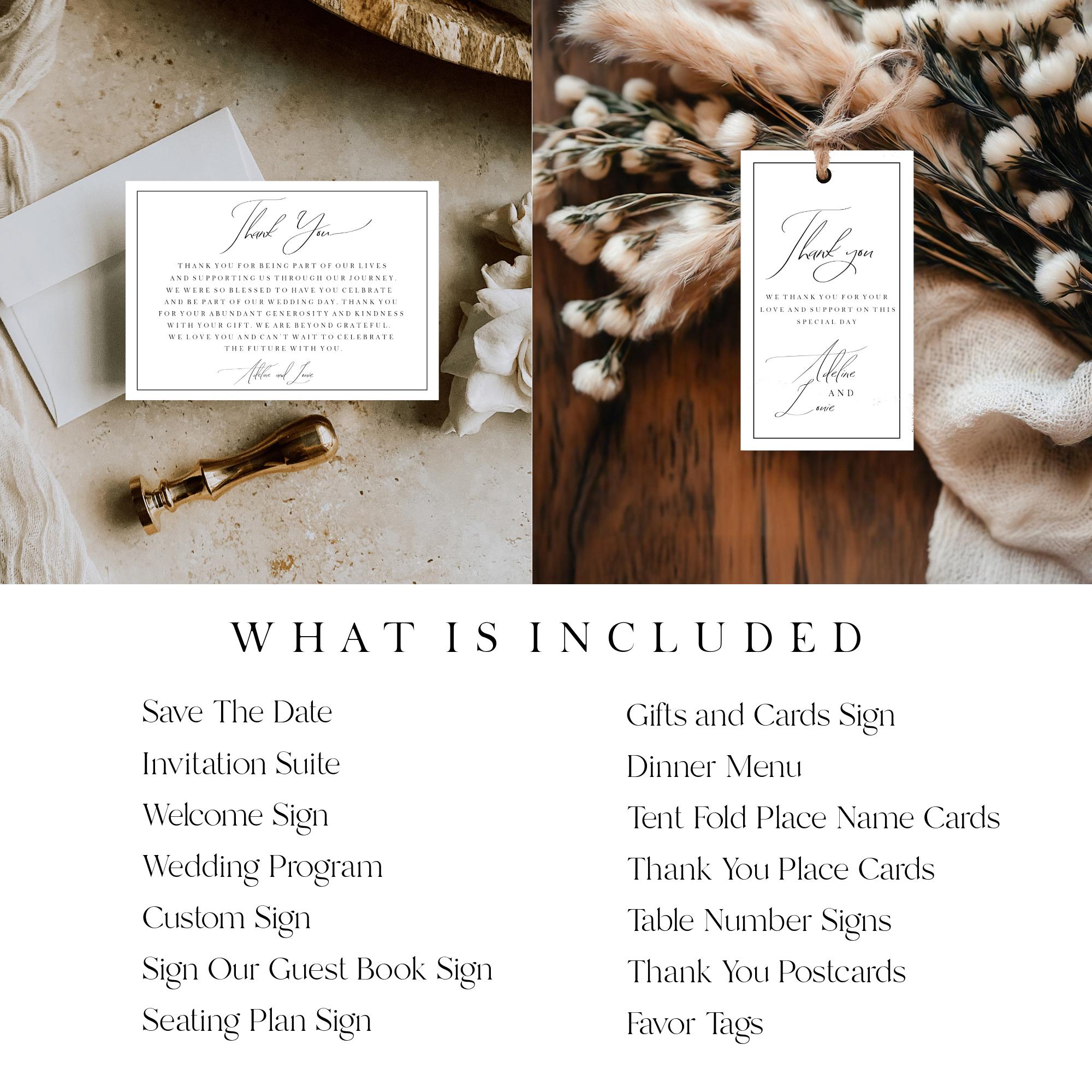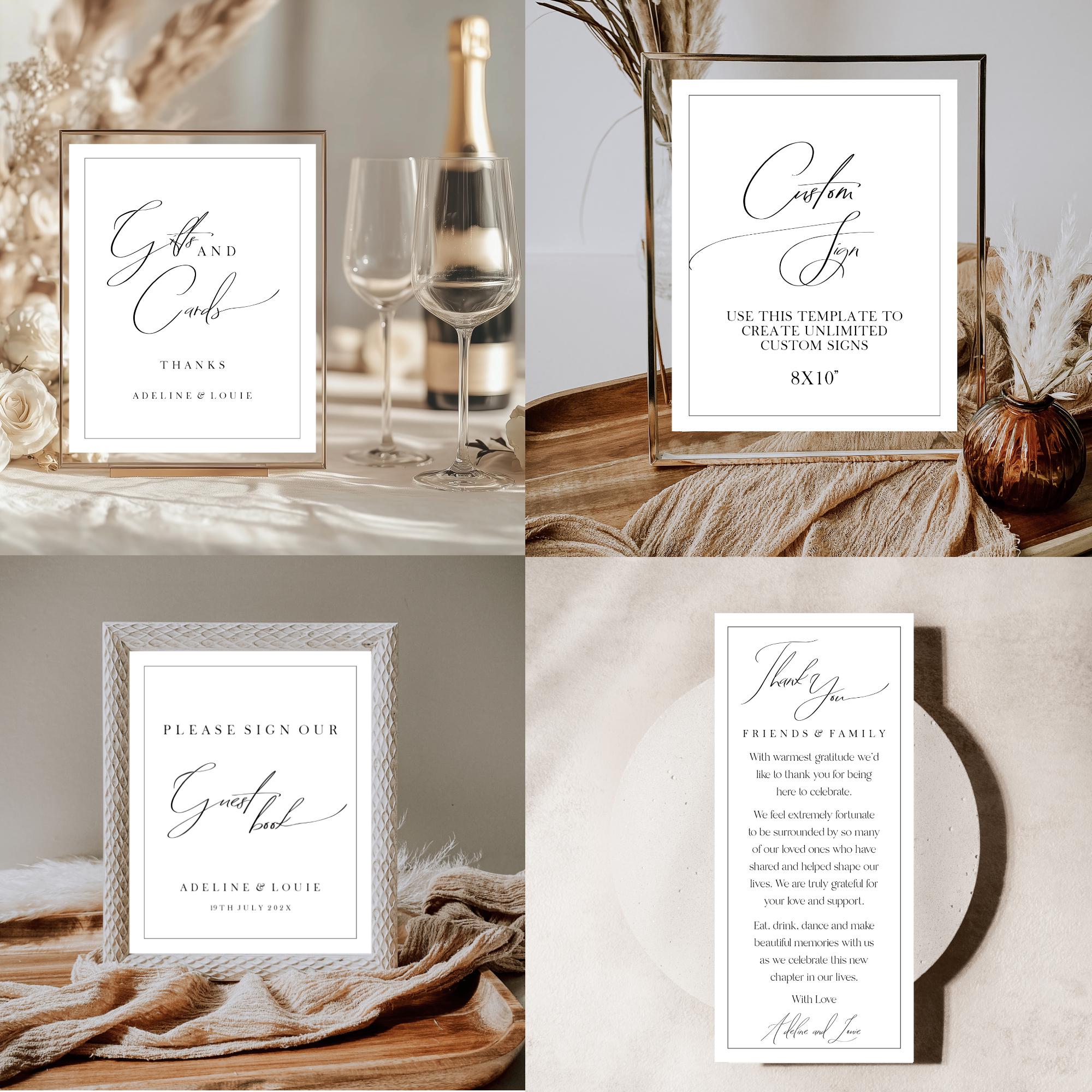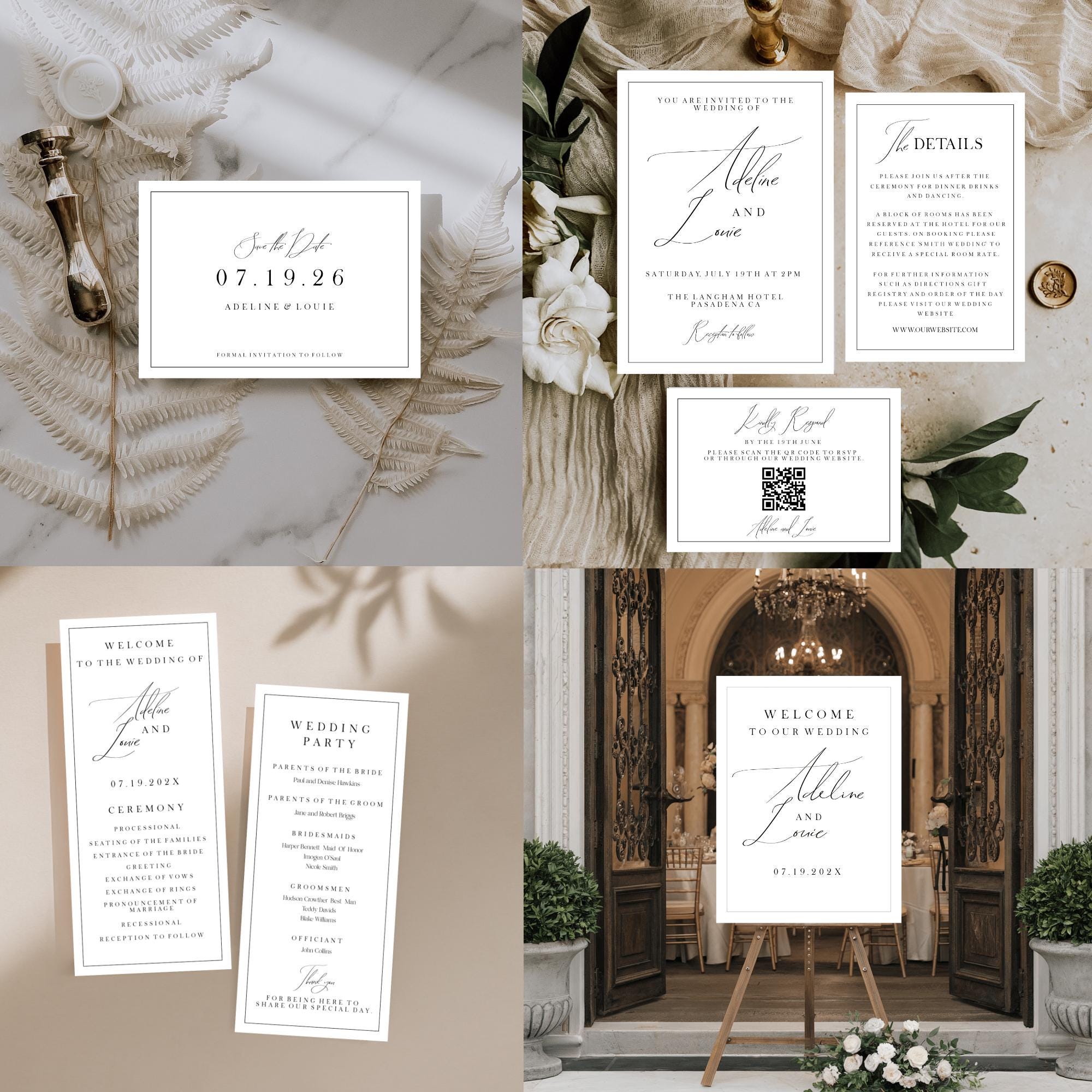Adeline Modern Minimalist Wedding Bundle Templates. An Instant download digital file for you to edit in your web browser with Templett straight after your purchase. Once personalized you are ready to print.