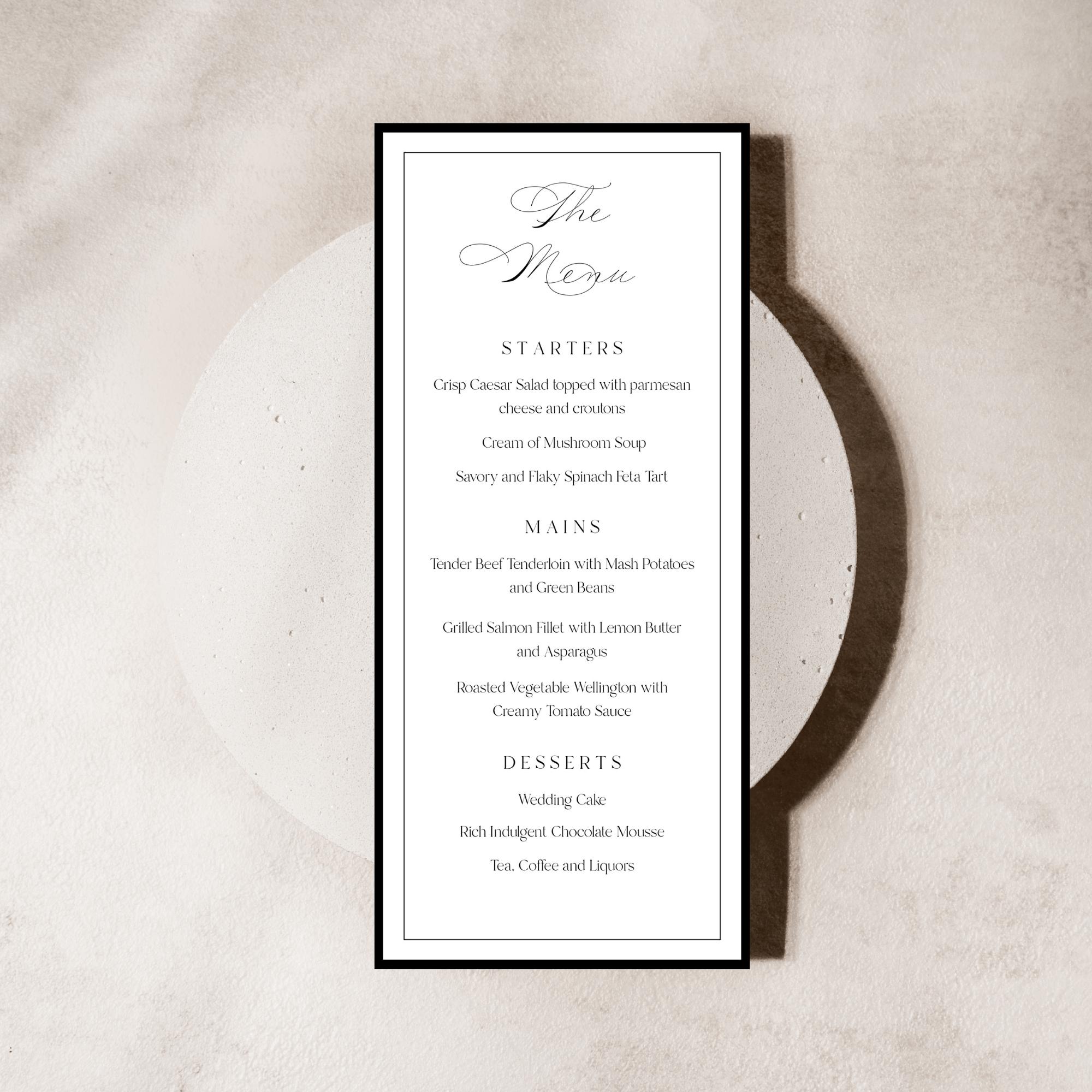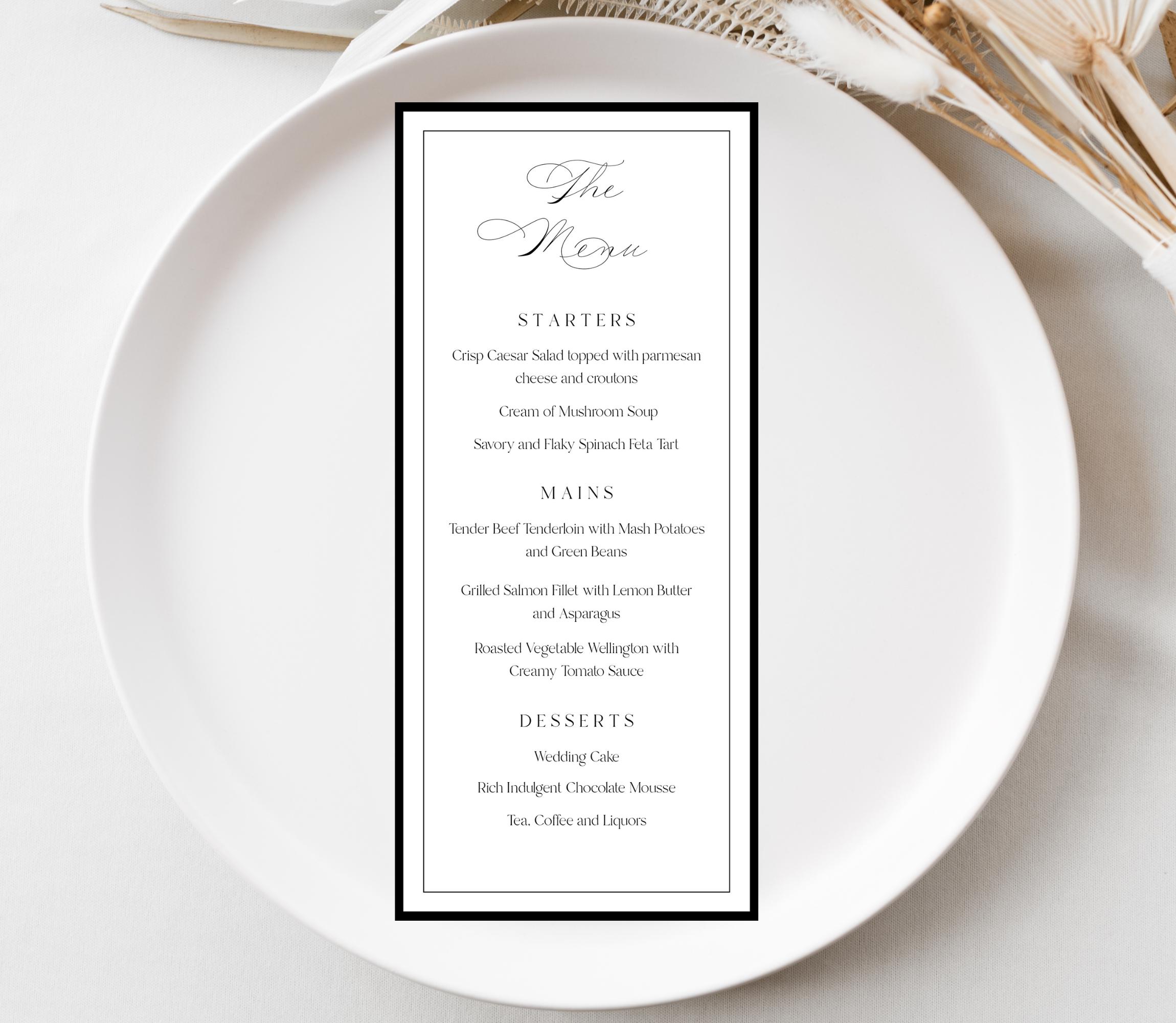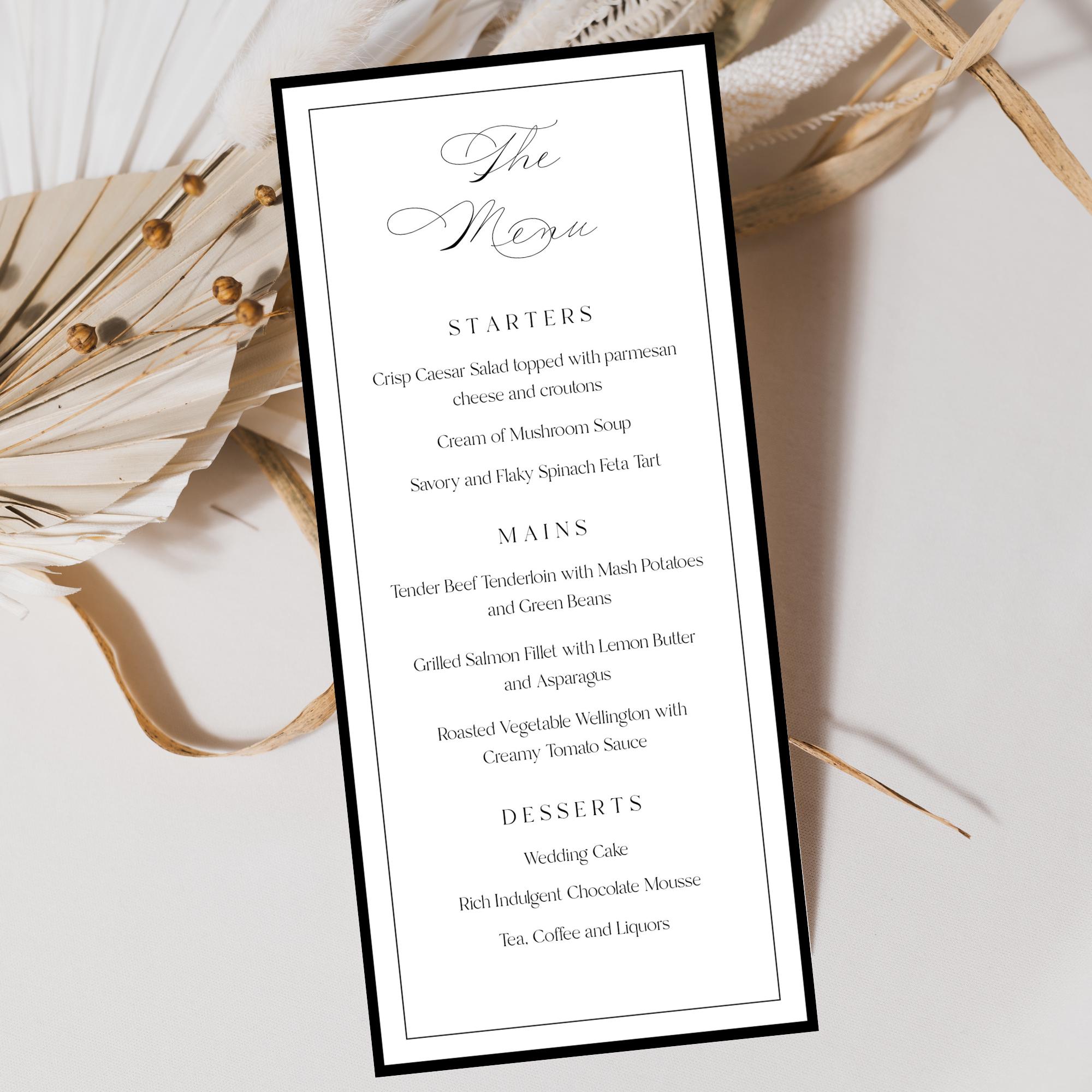 Elegant Script Wedding Menu Template. An Instant download digital file for you to edit in your web browser with Templett straight after your purchase. Once personalized you are ready to print.