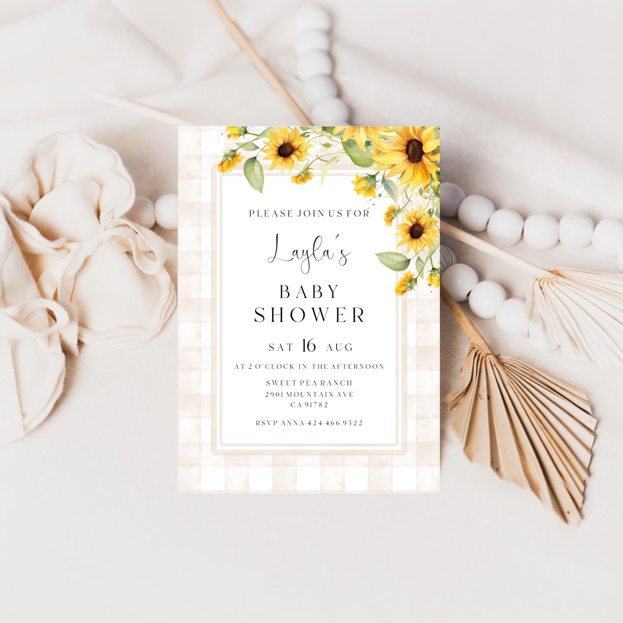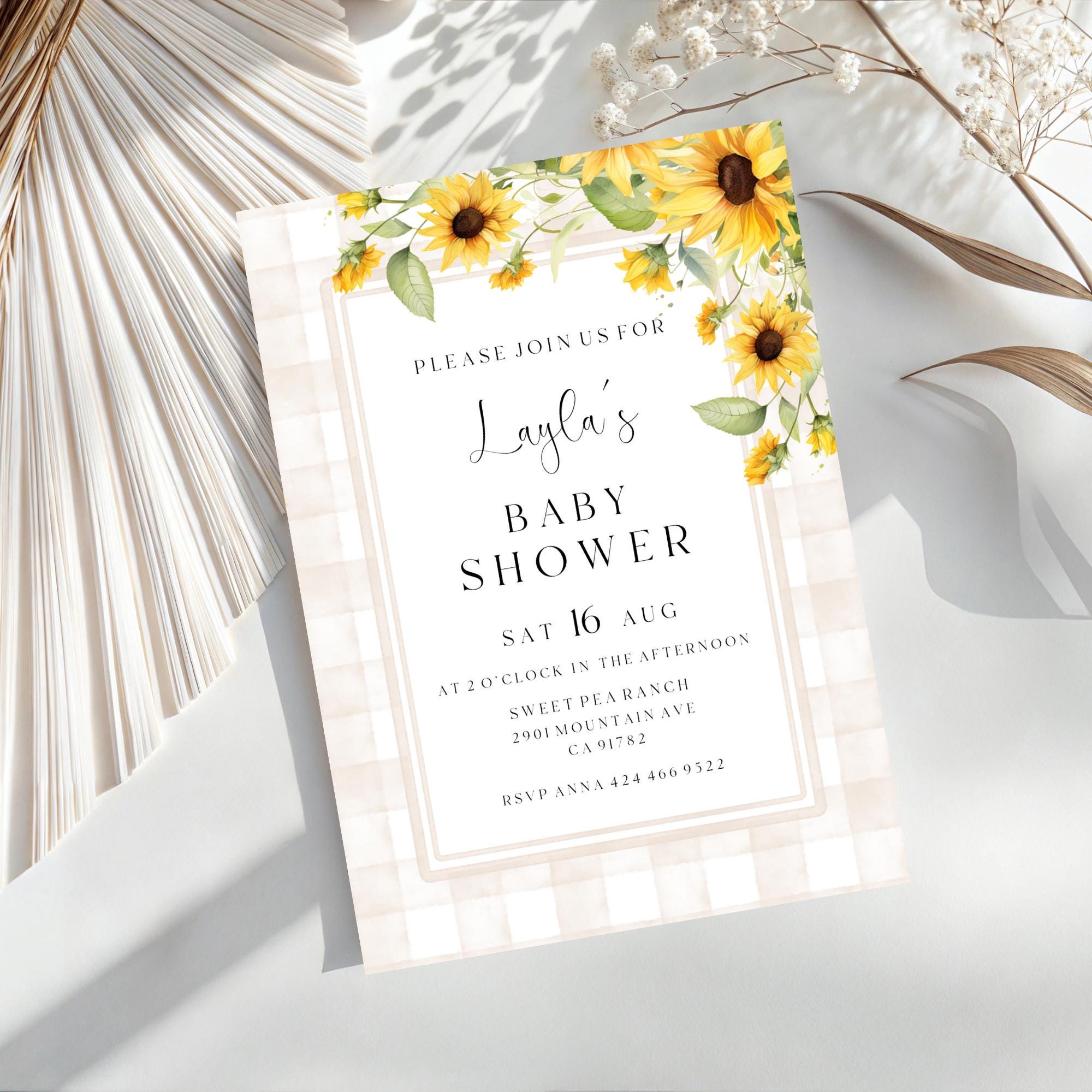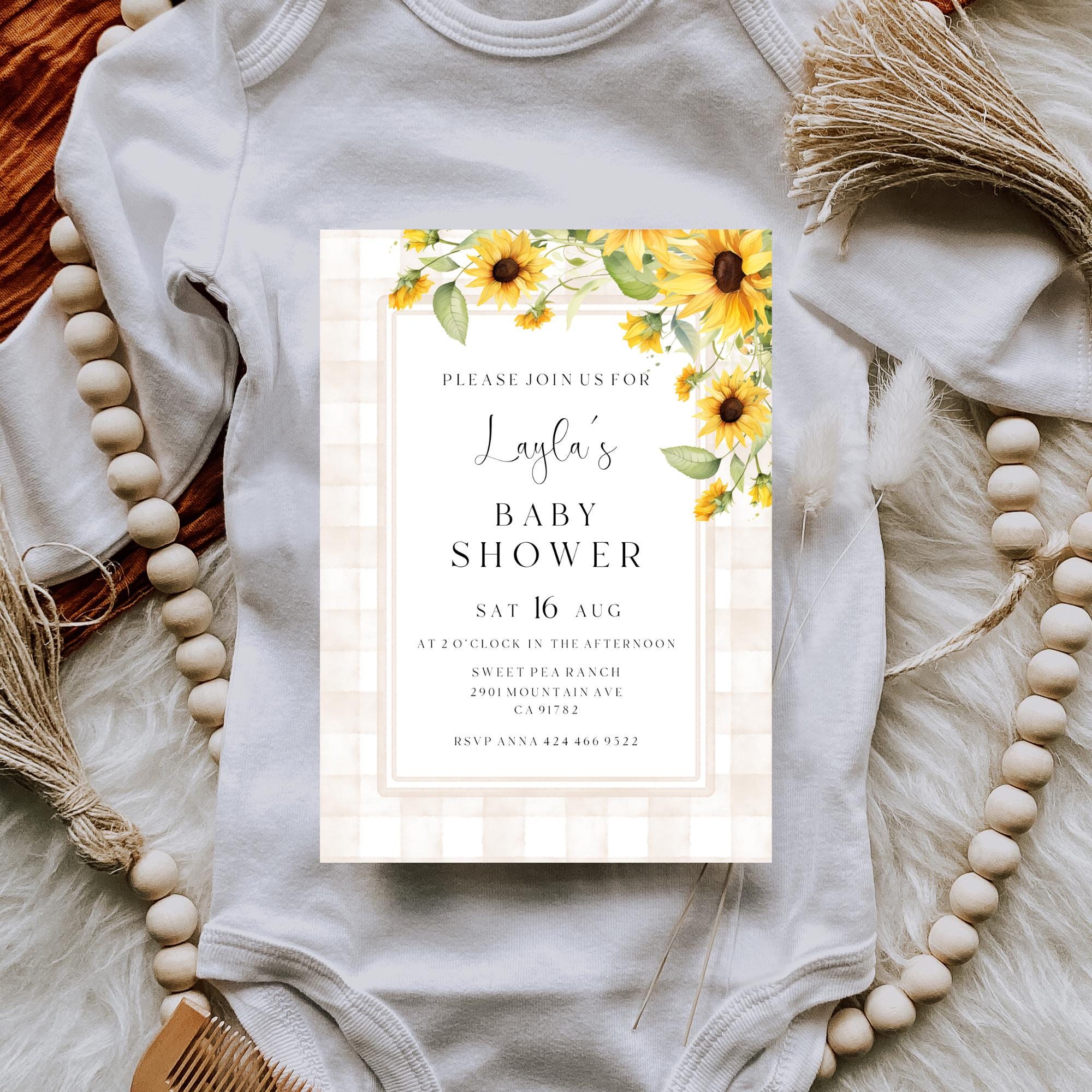Sunflower Baby Shower Invitation Template. An Instant download digital file for you to edit in your web browser with Templett straight after your purchase. Once personalized you are ready to print.
