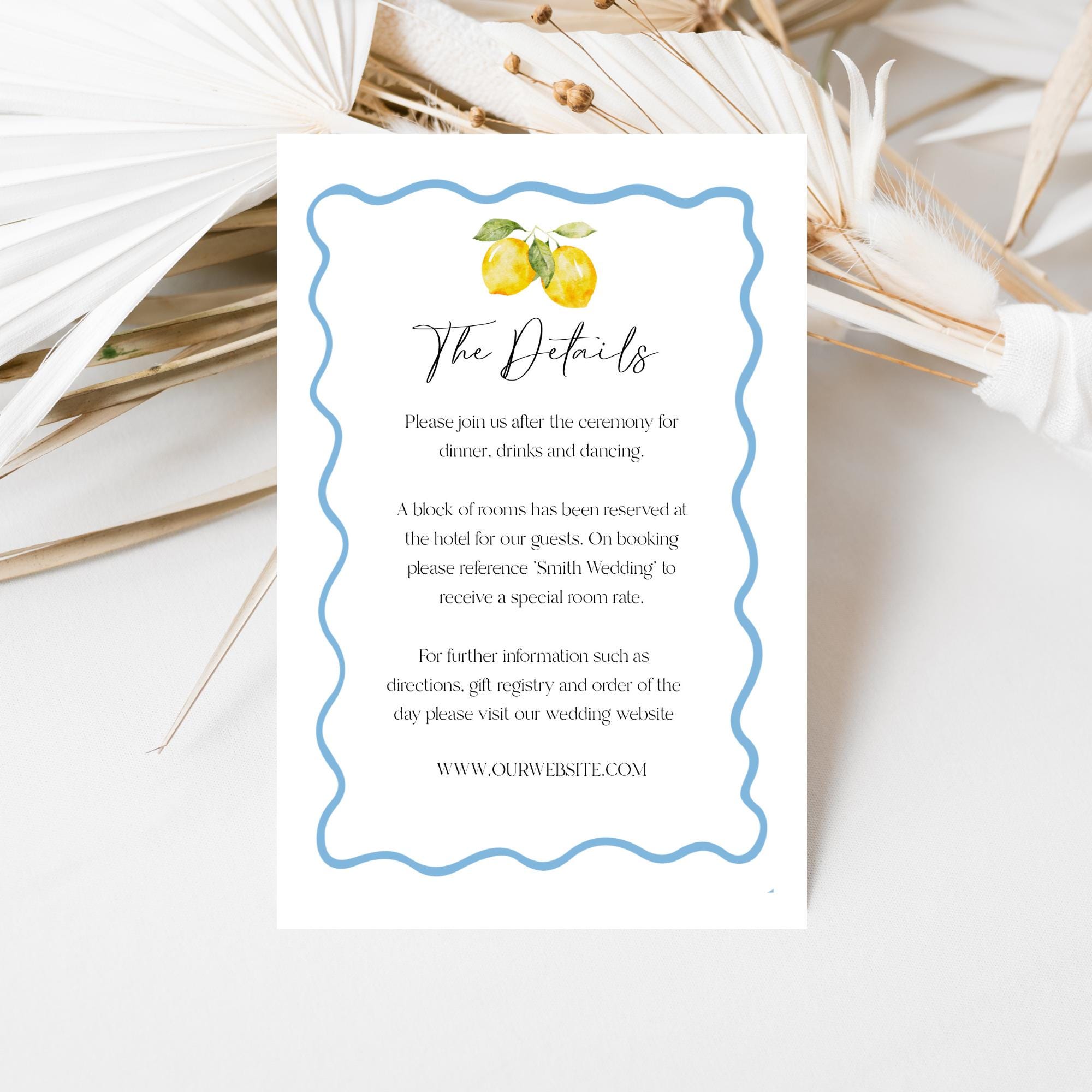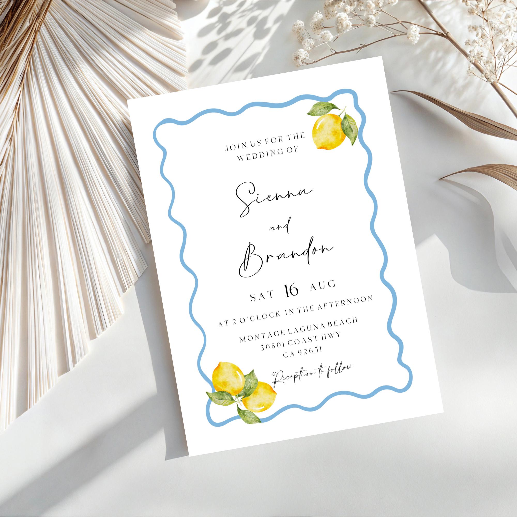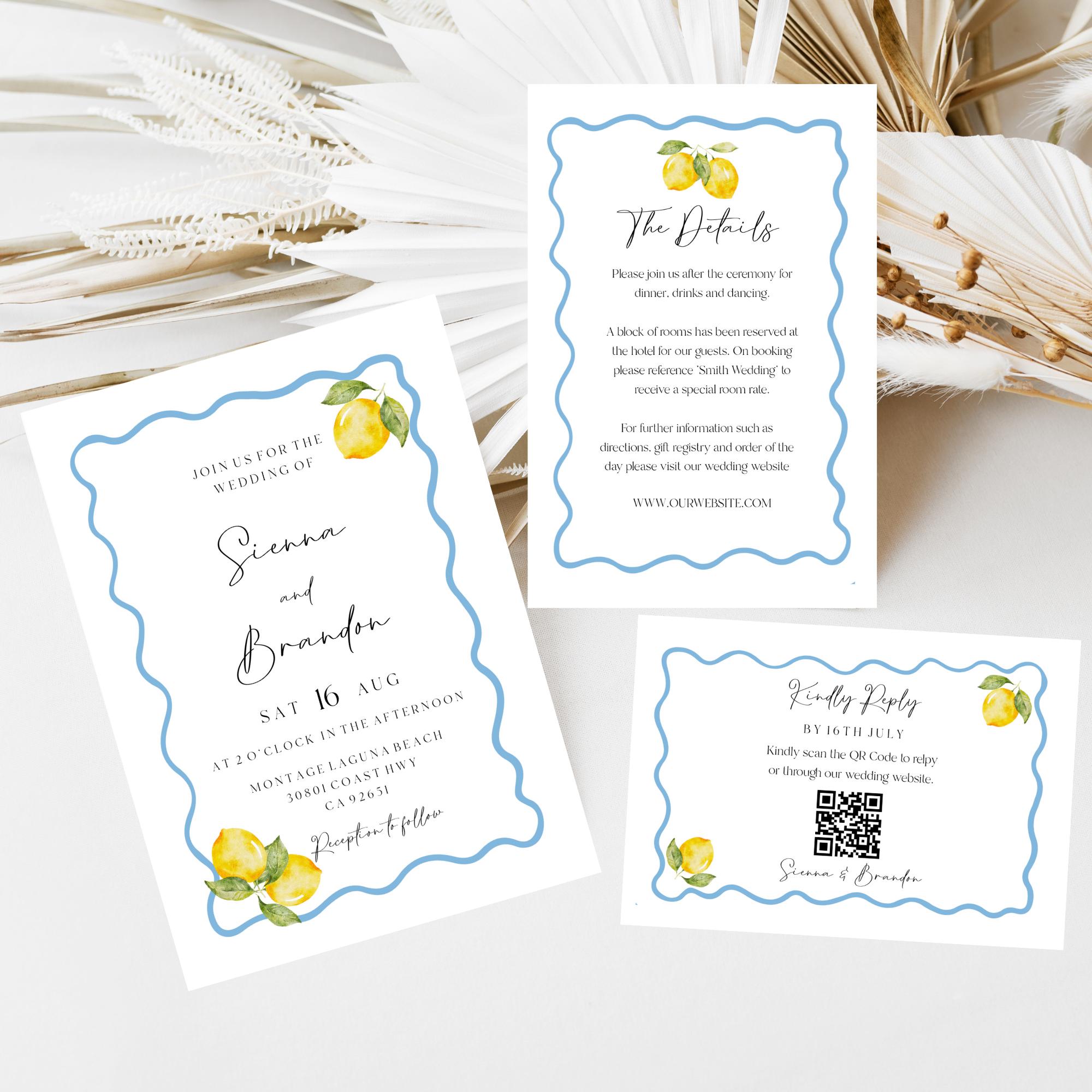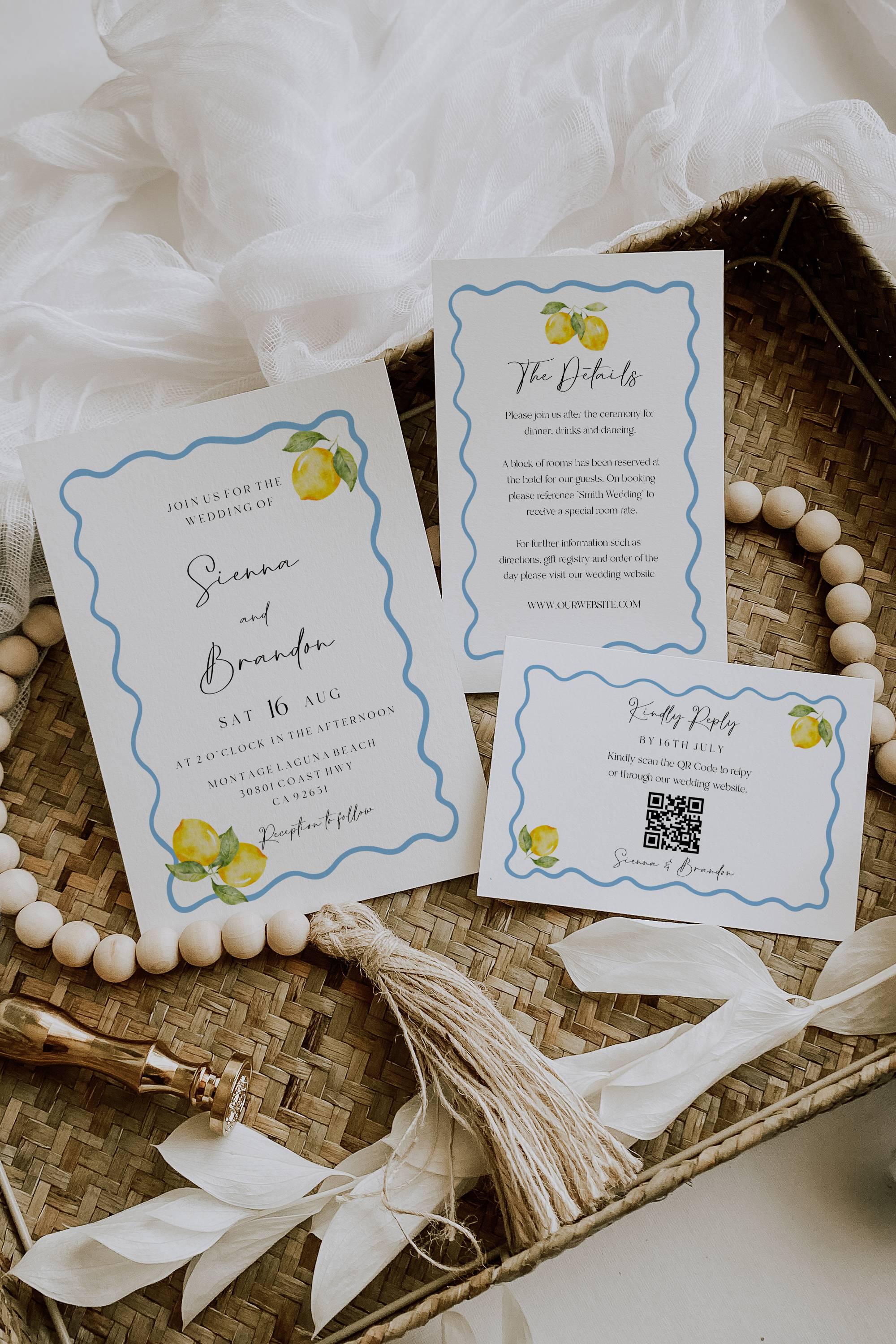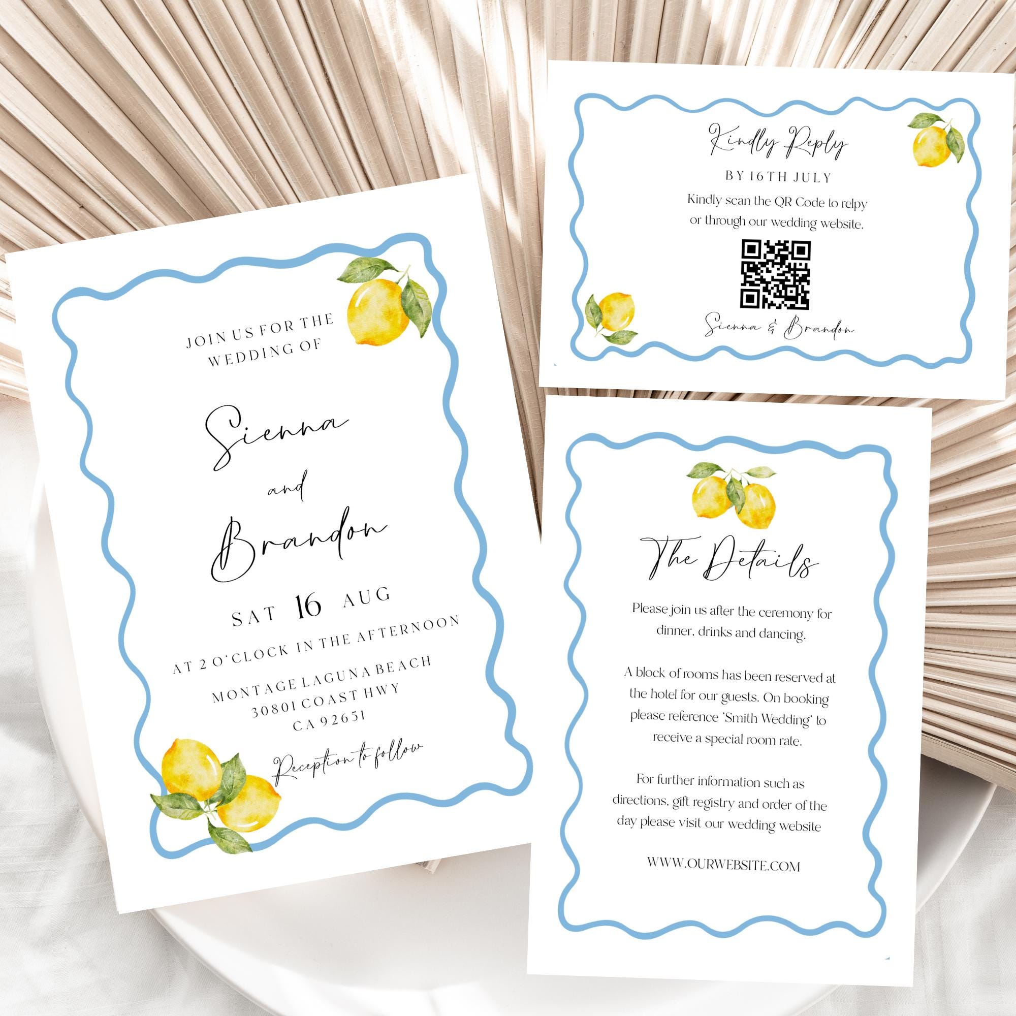 Modern Lemons Wedding Invitation Suite Template. An Instant download digital file for you to edit in your web browser with Templett straight after your purchase. Once personalized you are ready to print.