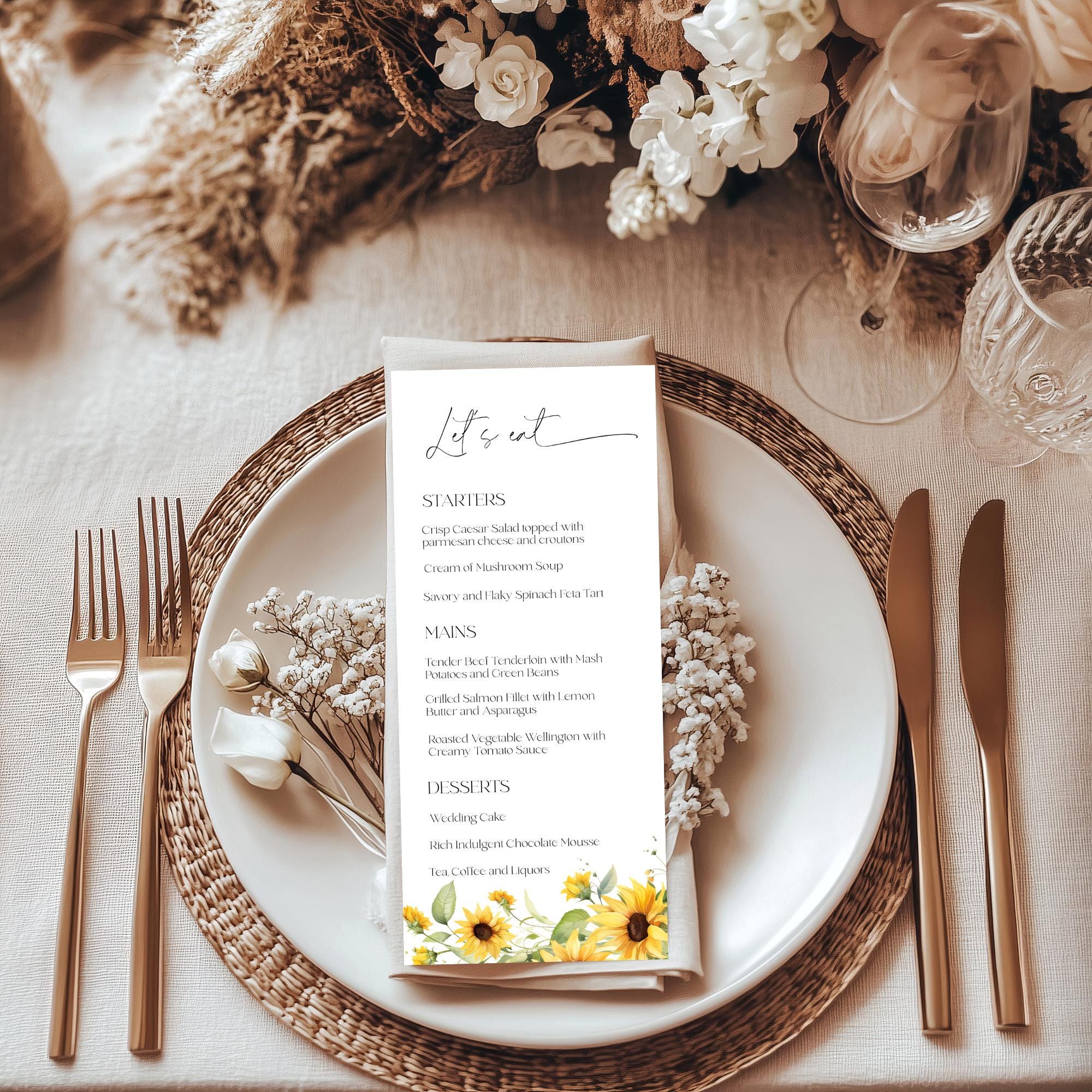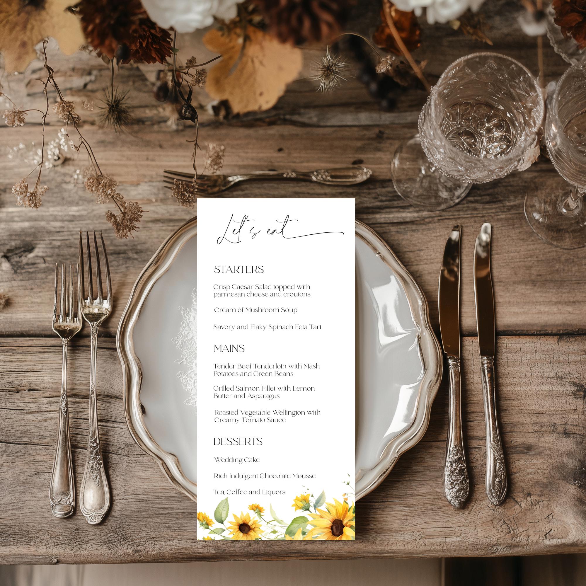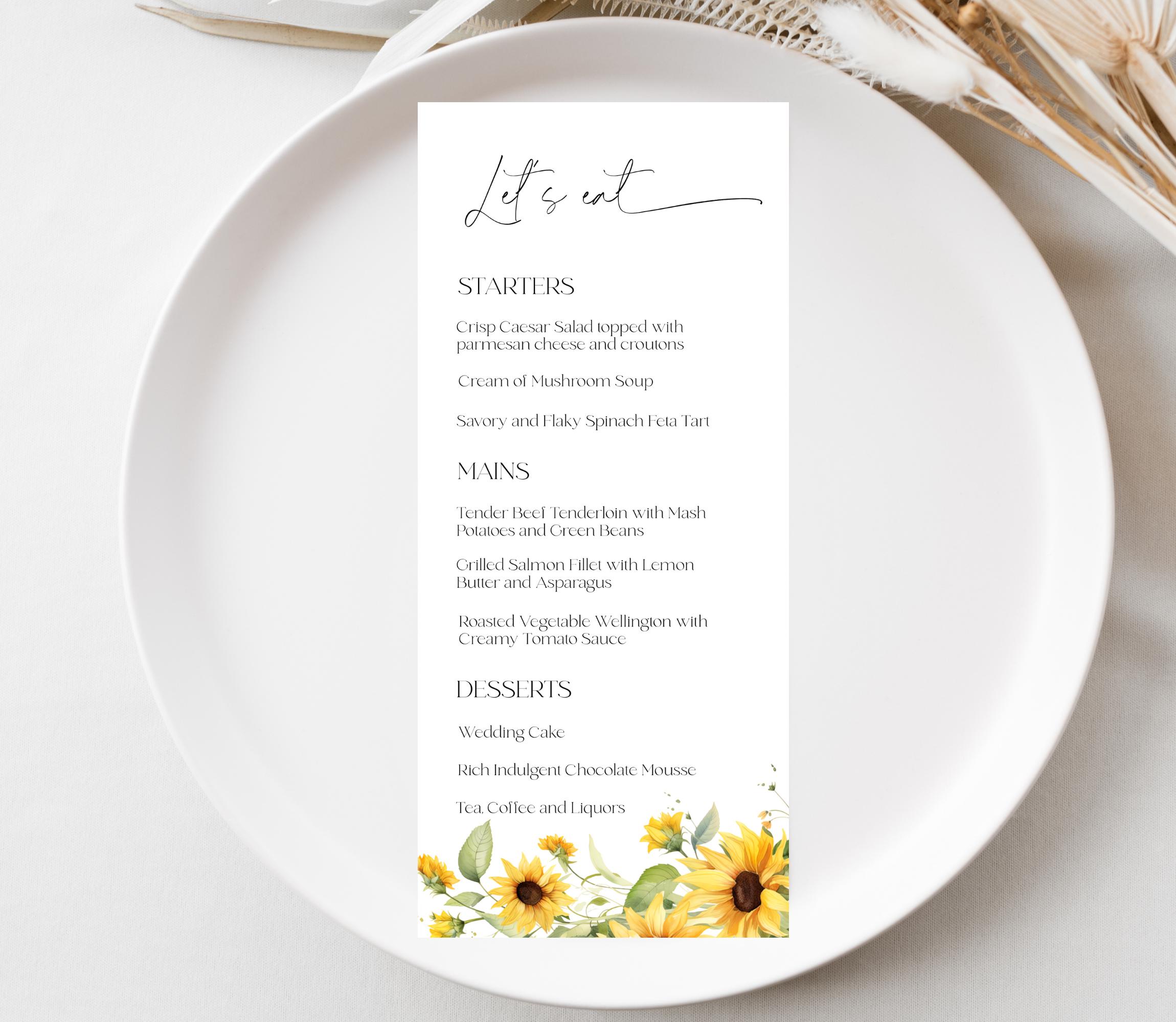 Sunflower Menu Template. An Instant download digital file for you to edit in your web browser with Templett straight after your purchase. Once personalized you are ready to print.