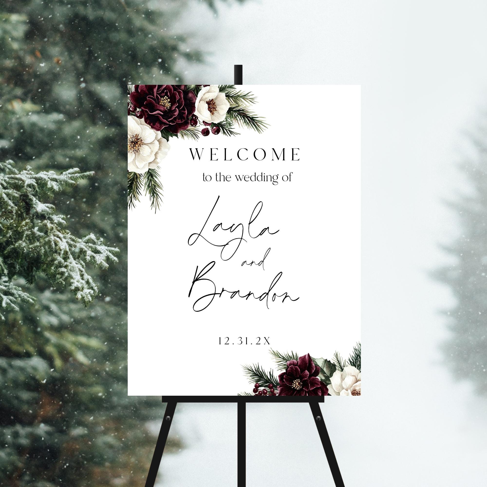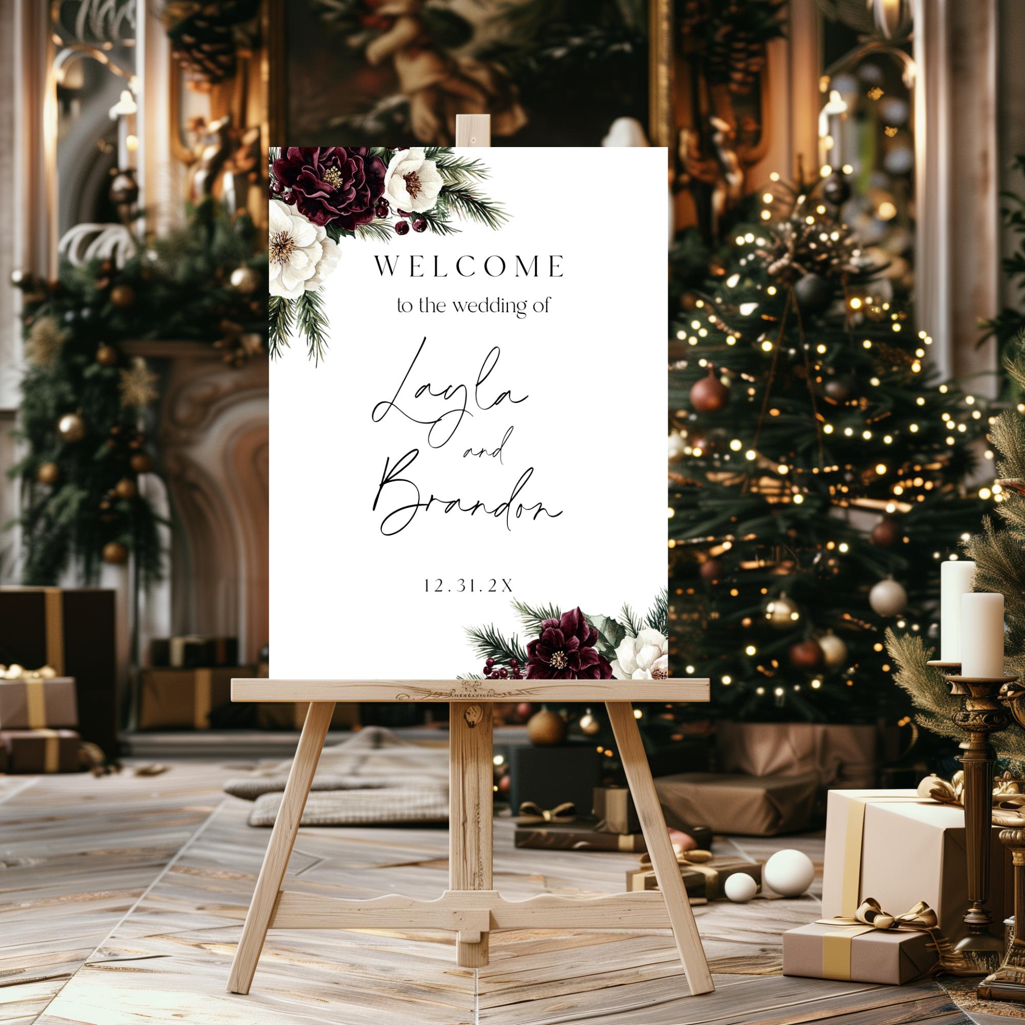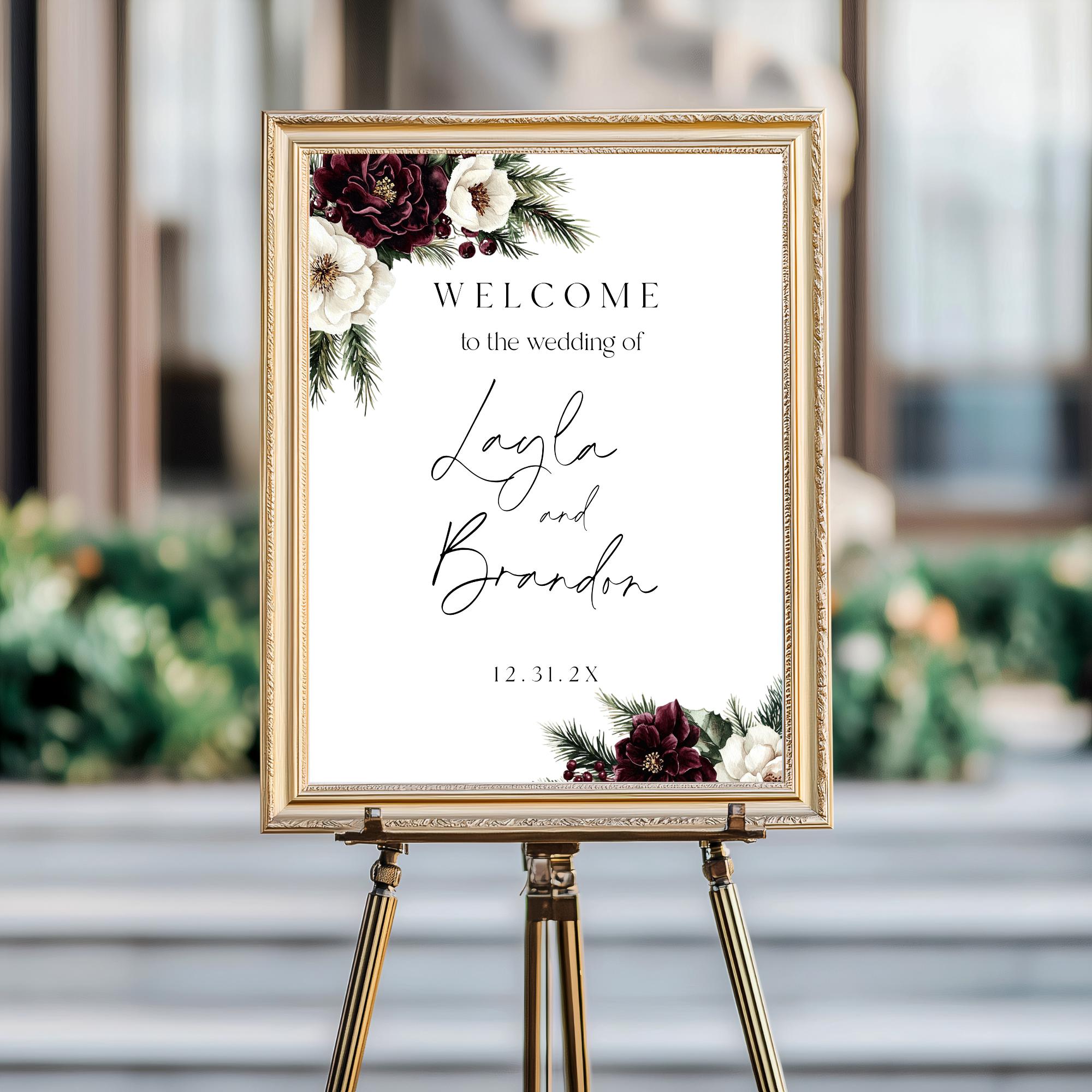 Winter Burgundy Floral Wedding Welcome Sign Template. An Instant download digital file for you to edit in your web browser with Templett straight after your purchase. Once personalized you are ready to print.