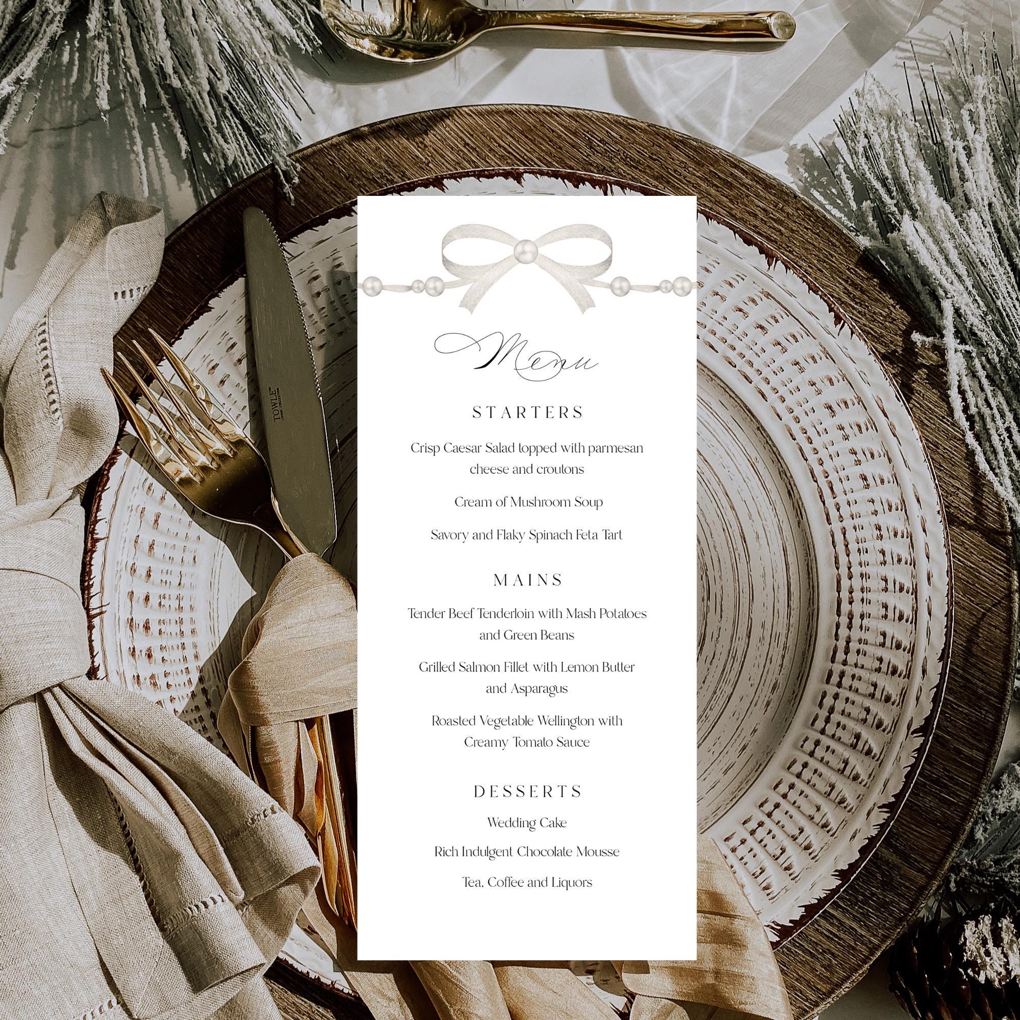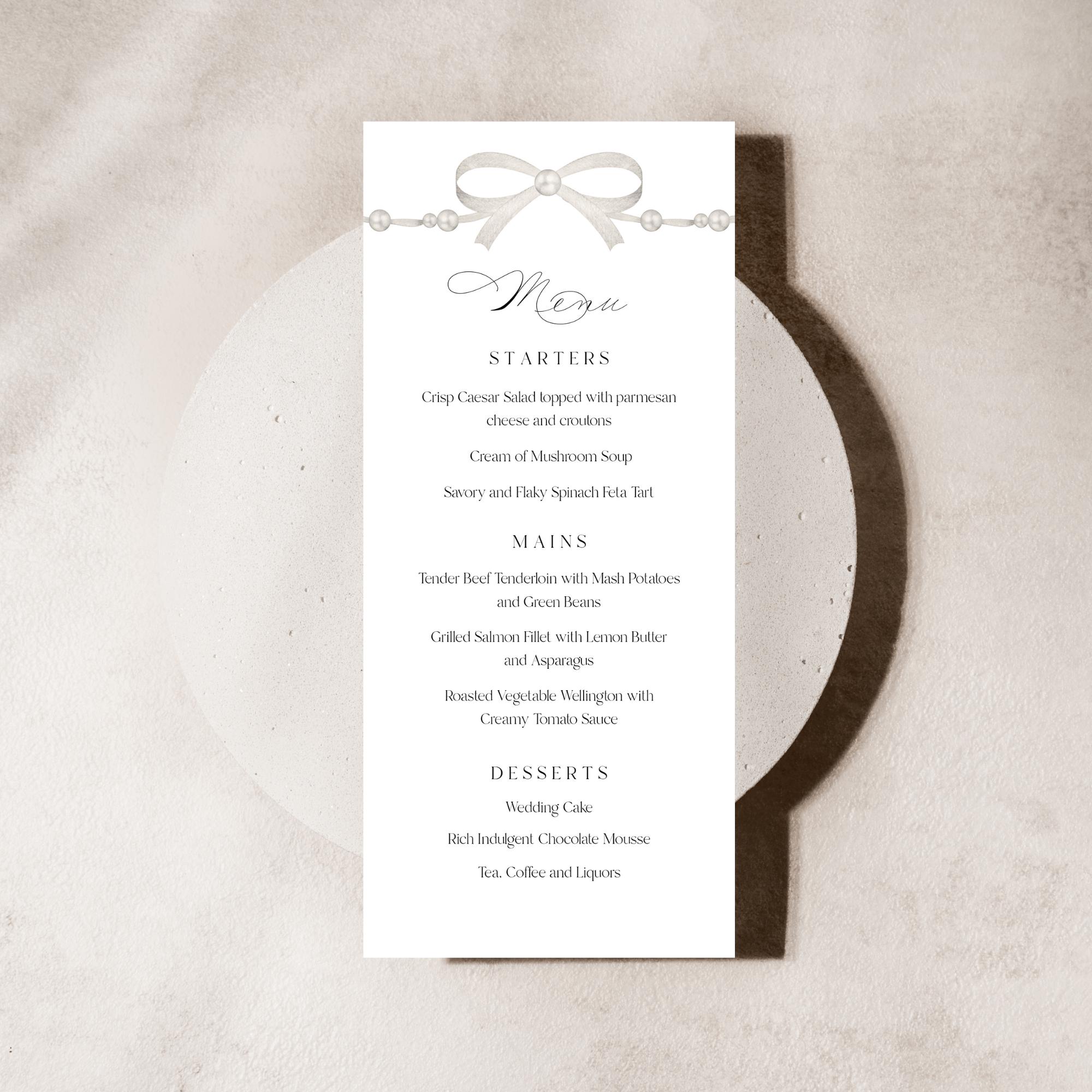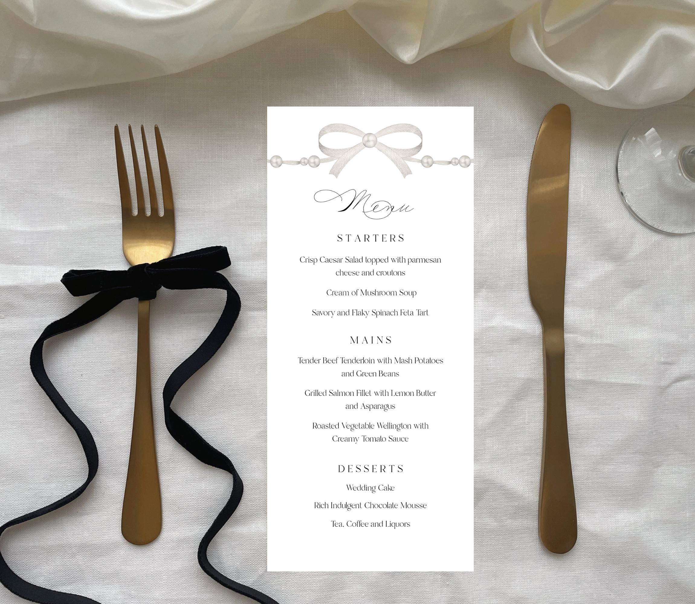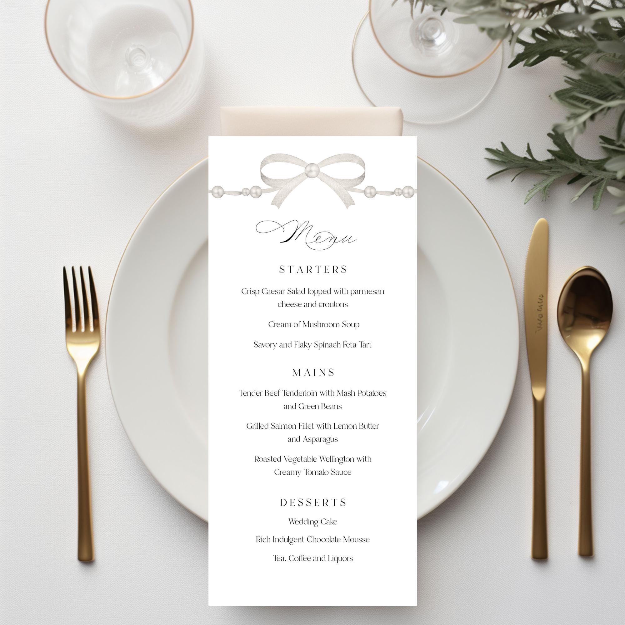 Pearl Bow Wedding Menu Template. An Instant download digital file for you to edit in your web browser with Templett straight after your purchase. Once personalized you are ready to print.