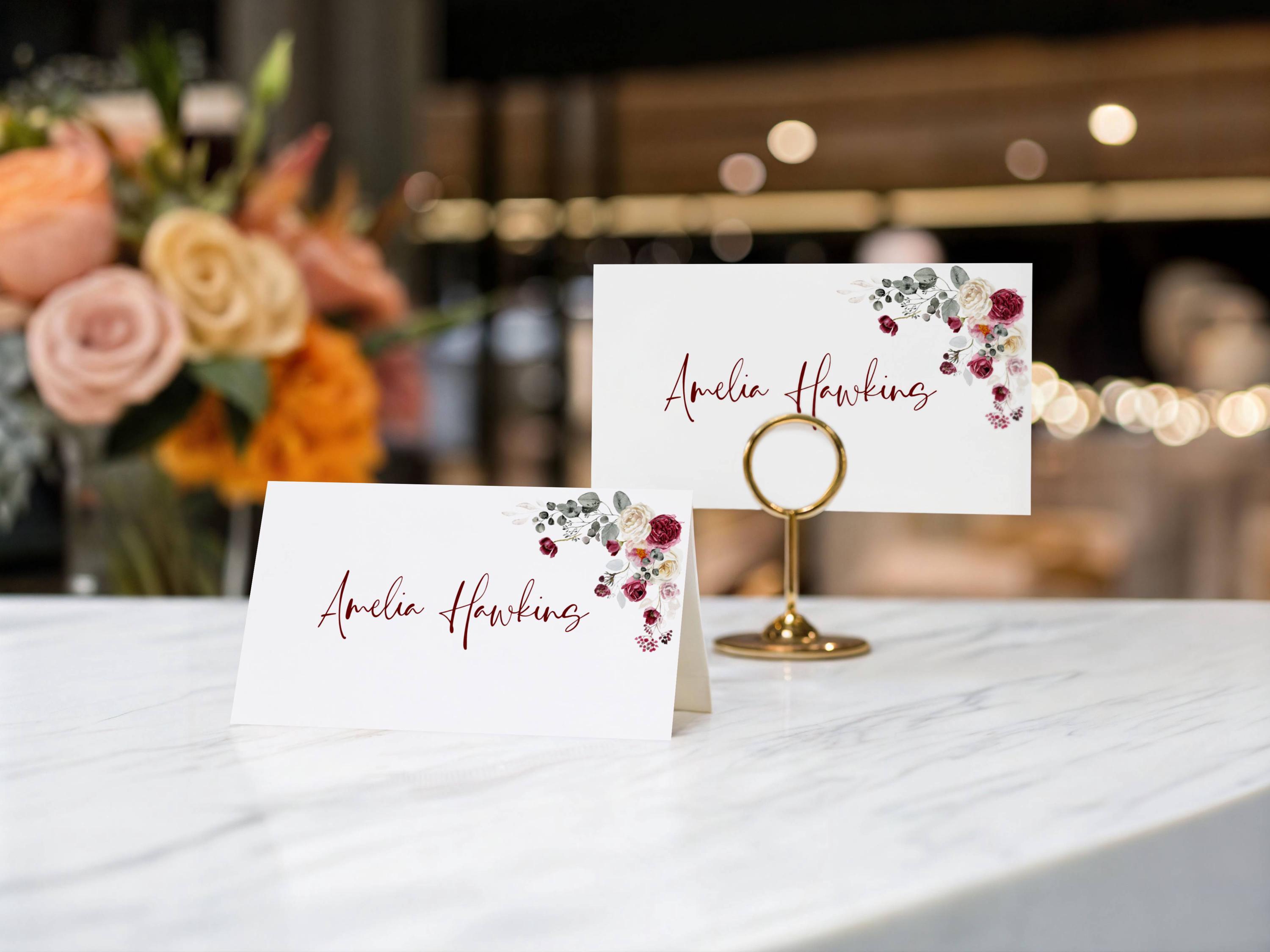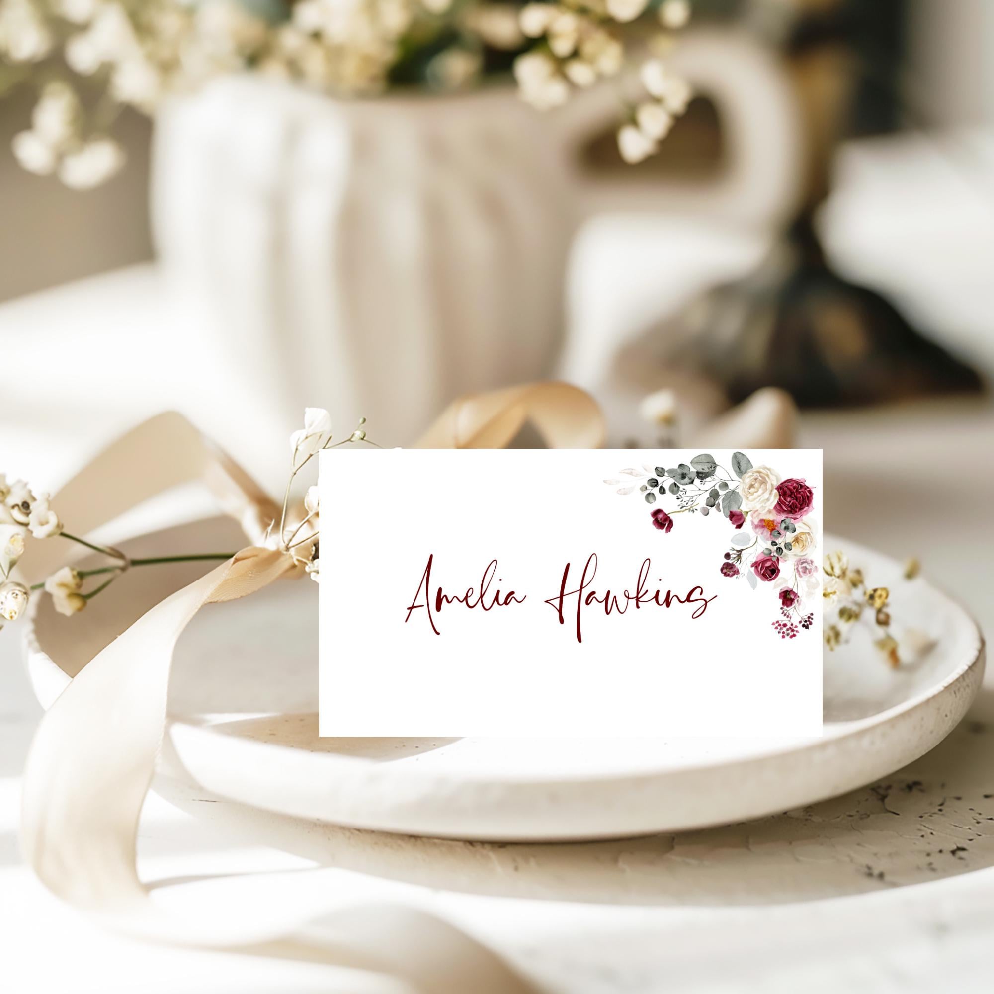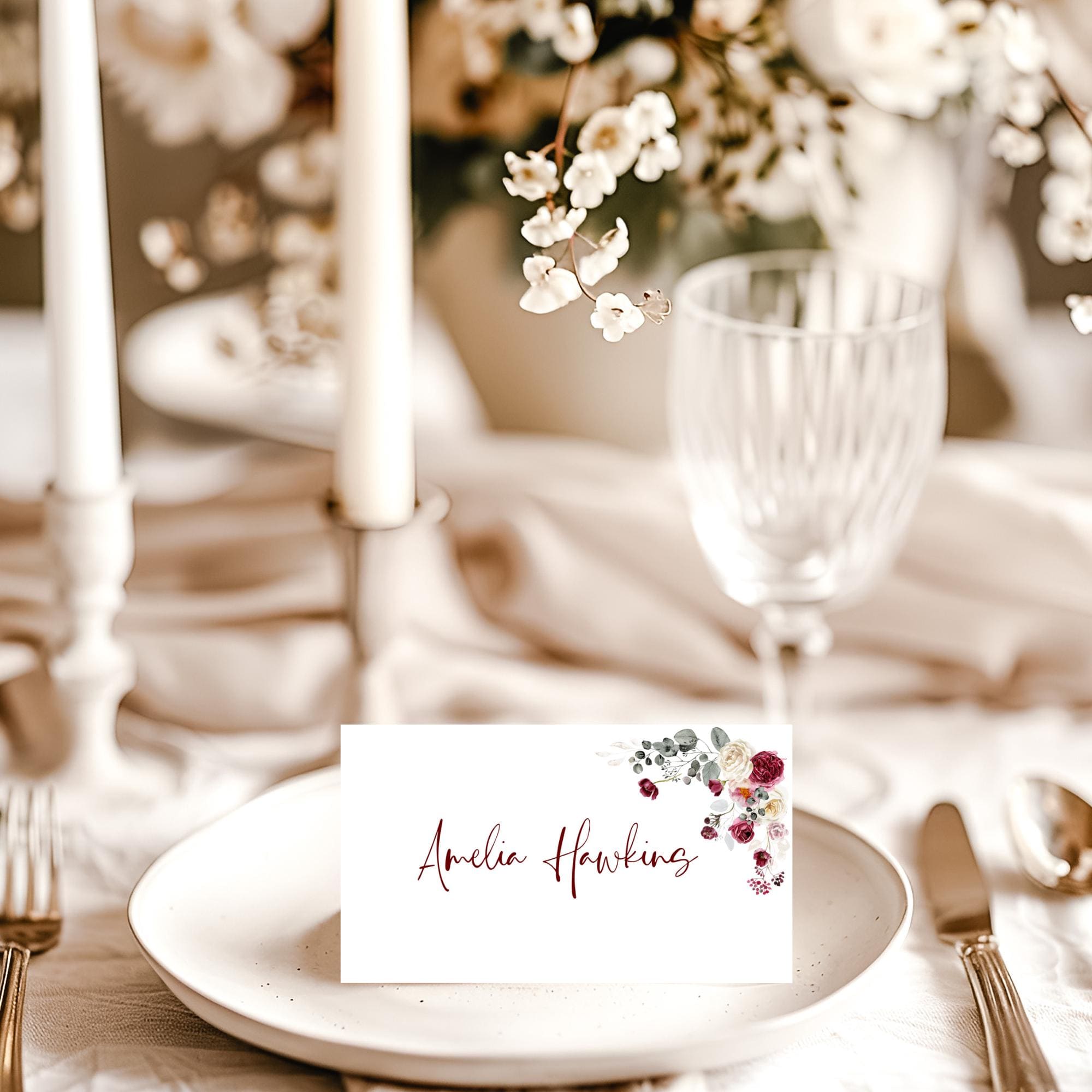 Burgundy and Blush Place Card Template. An Instant download digital file for you to edit in your web browser with Templett straight after your purchase. Once personalized you are ready to print.