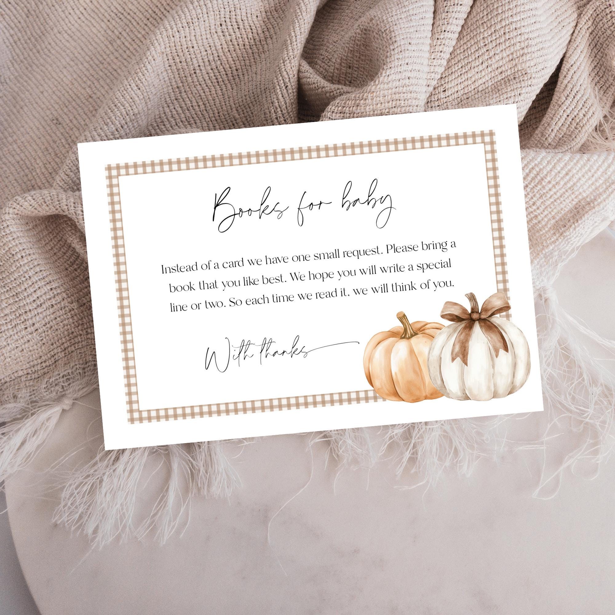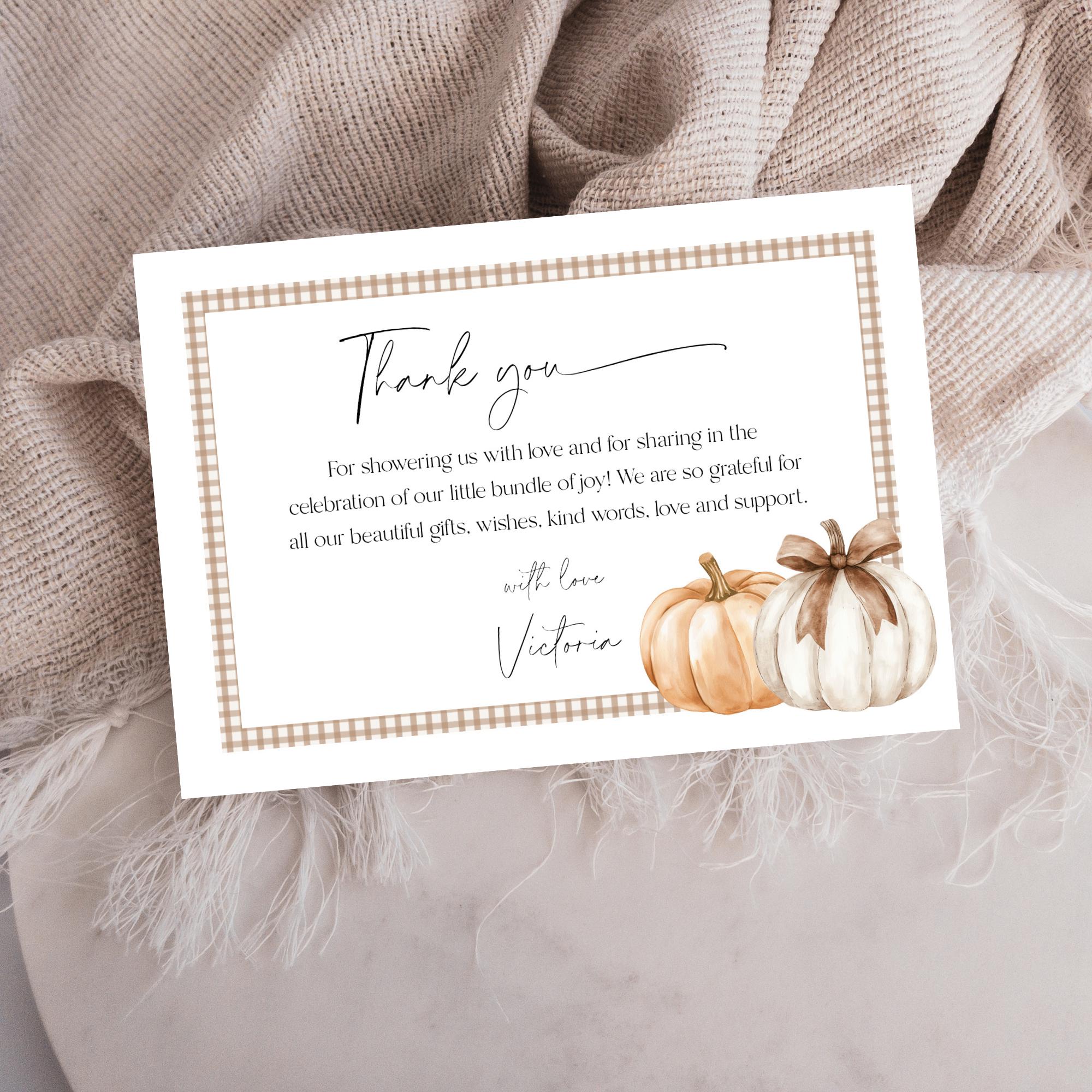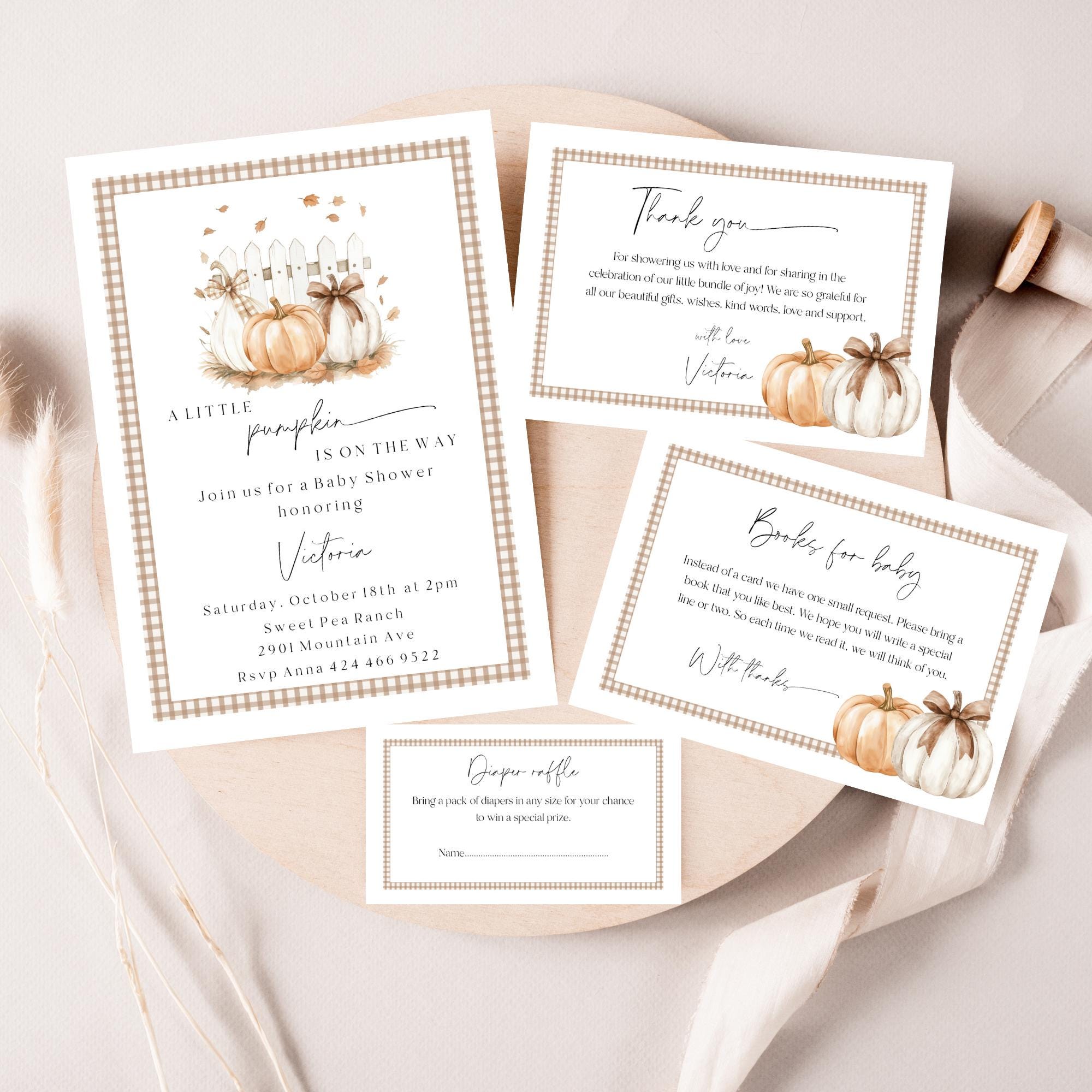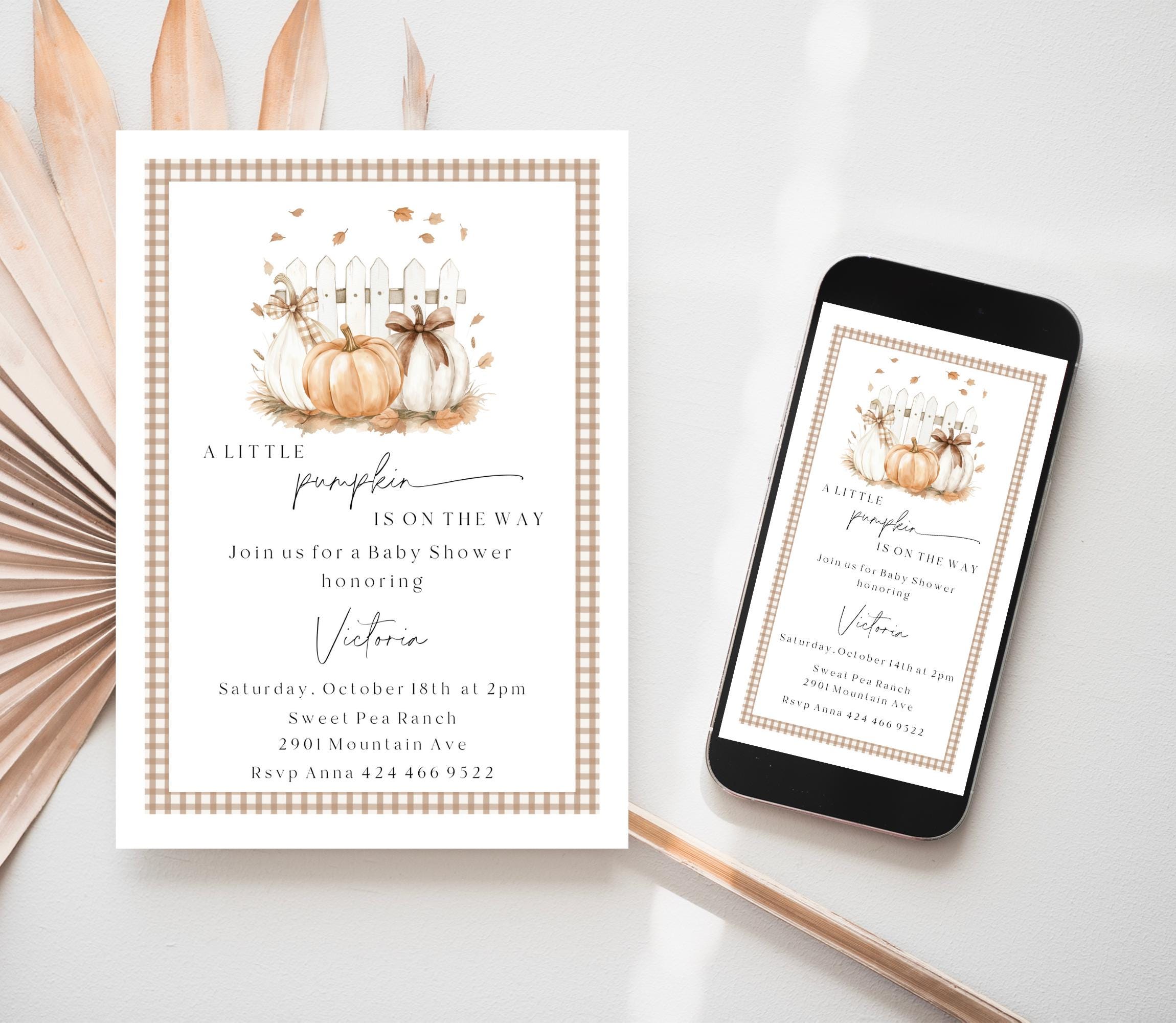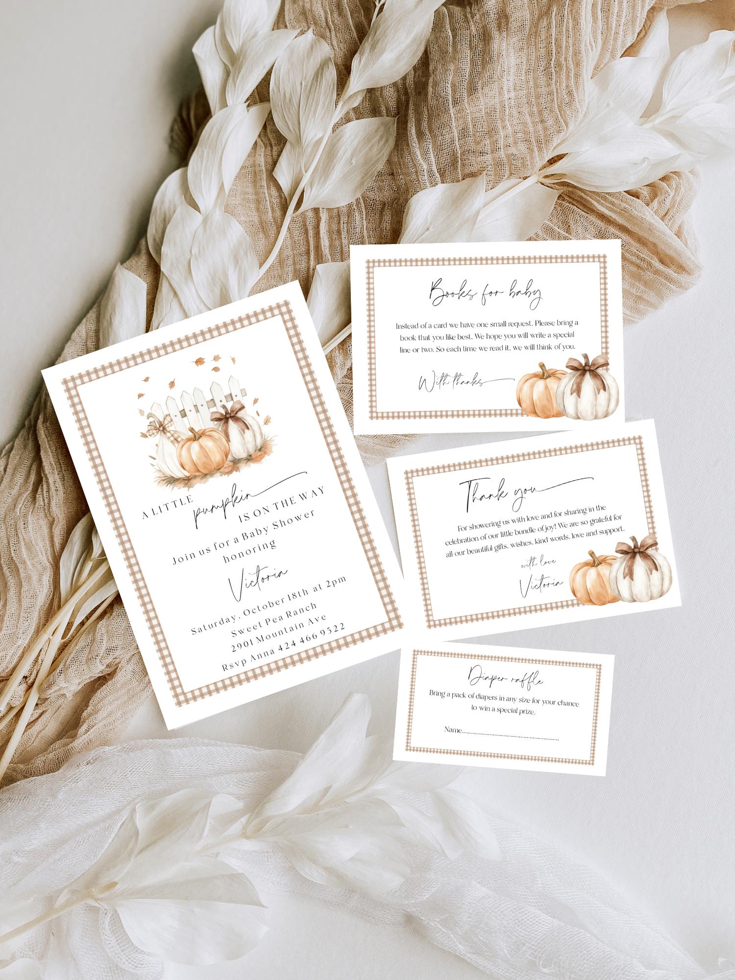 Pumpkin Baby Shower Invitation Set Template. An Instant download digital file for you to edit in your web browser with Templett straight after your purchase. Once personalized you are ready to print.