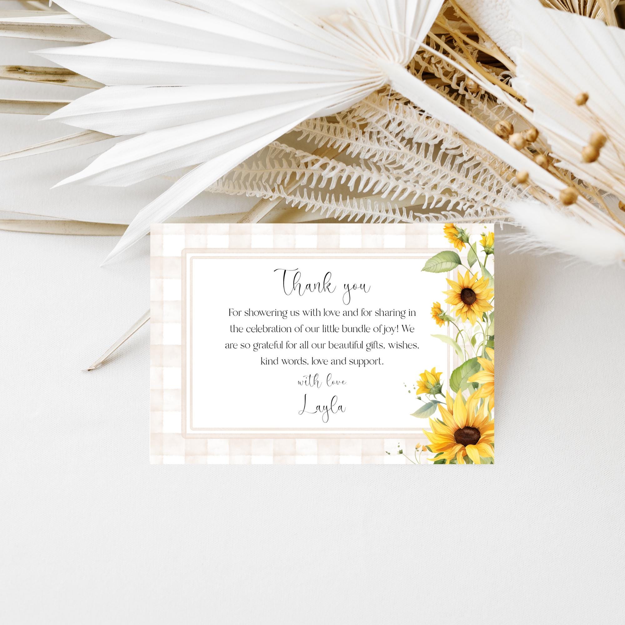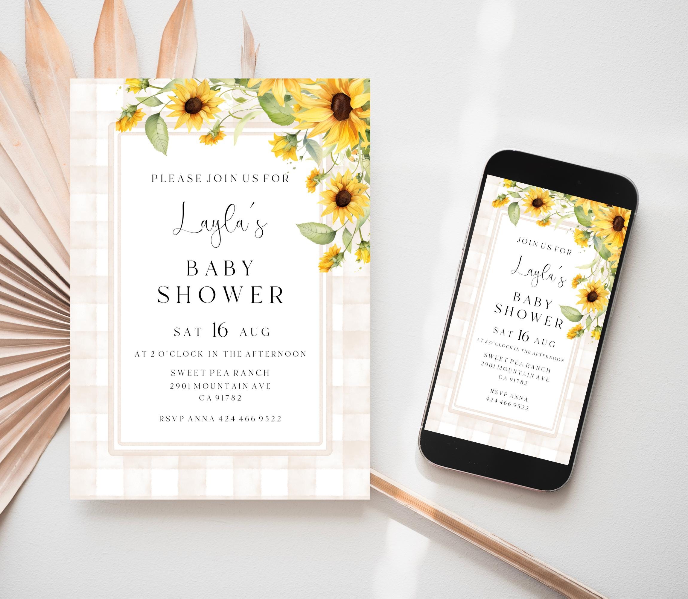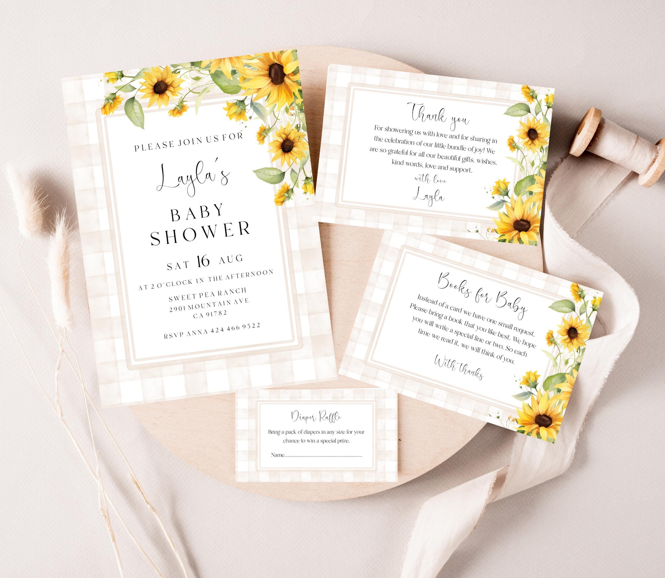 Sunflower Baby Shower Invitation Template Set. An Instant download digital file for you to edit in your web browser with Templett straight after your purchase. Once personalized you are ready to print.