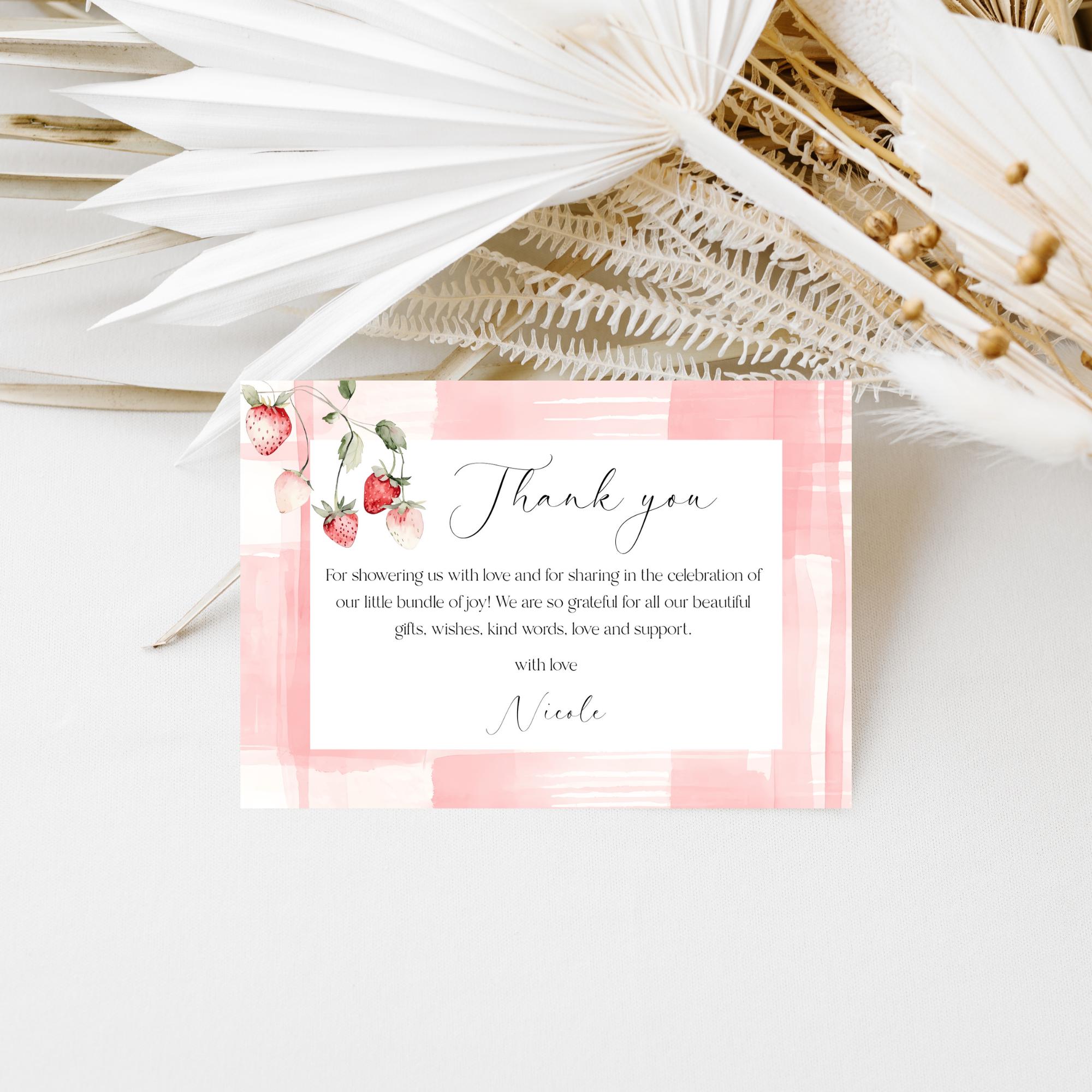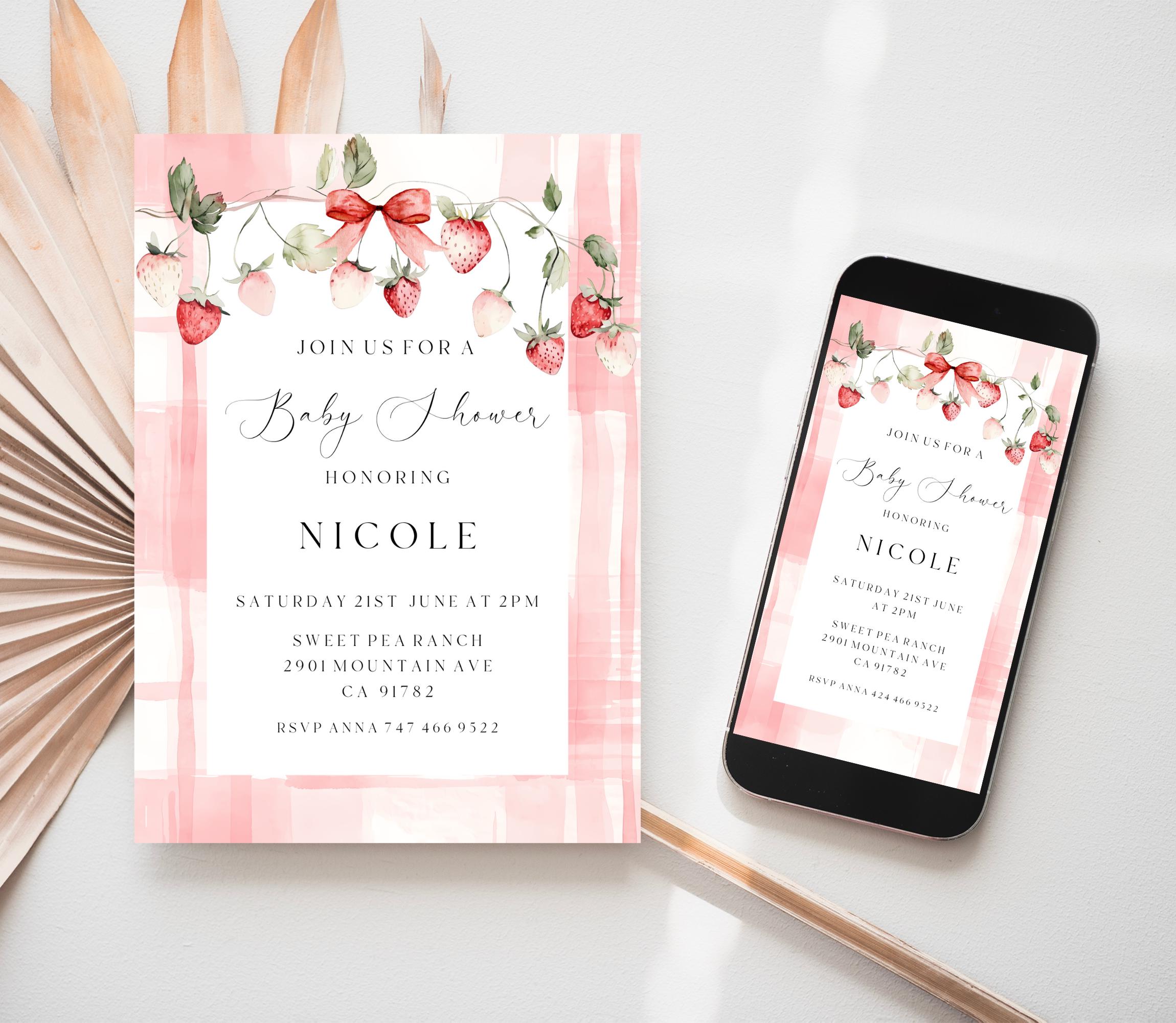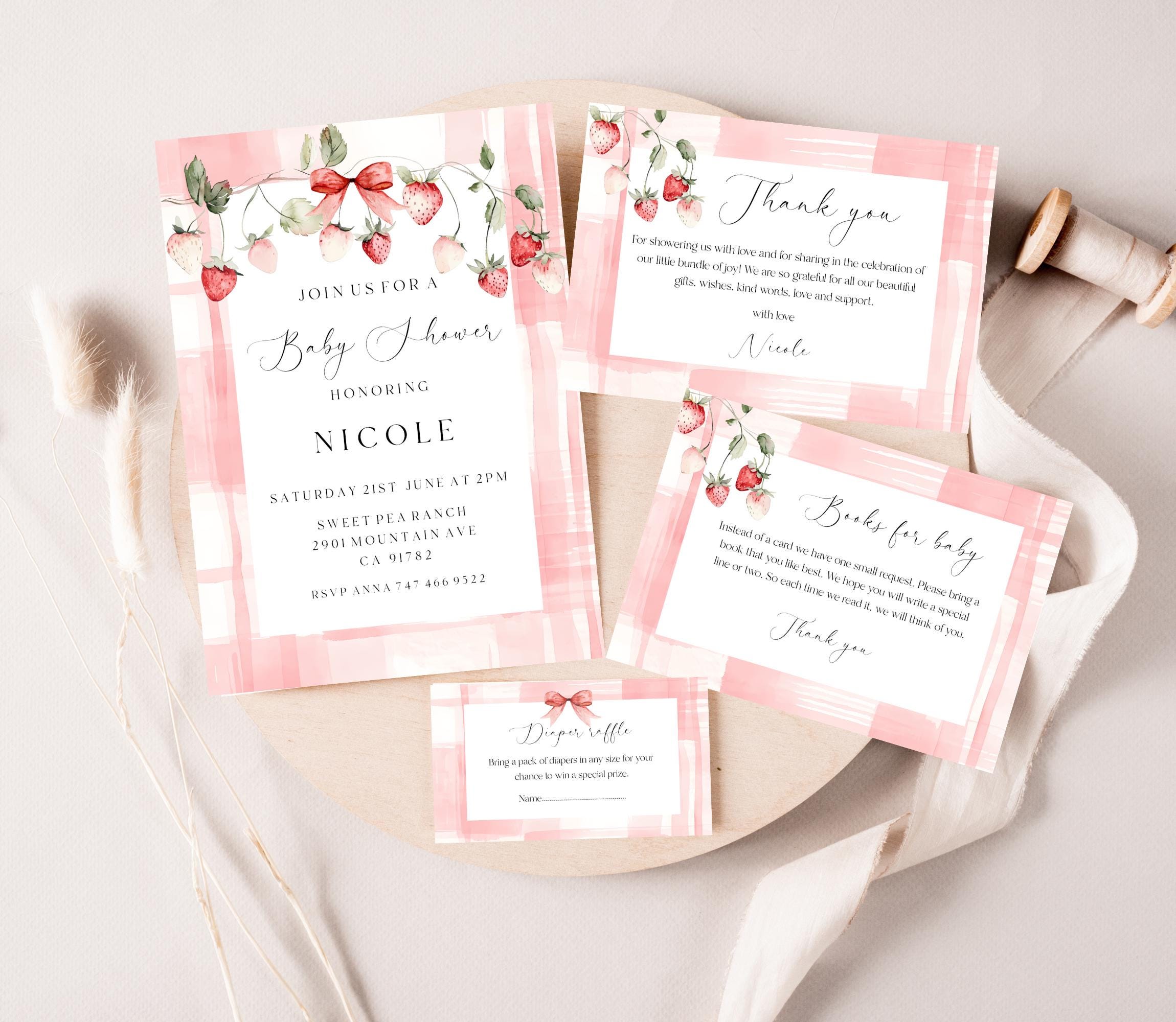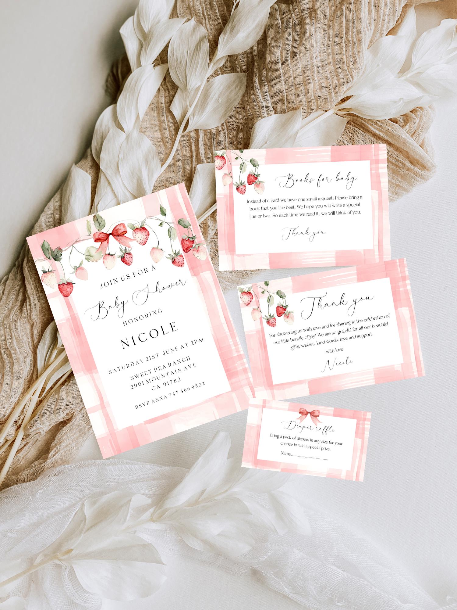Wild Strawberry Baby Shower Invitation Template Set. An Instant download digital file for you to edit in your web browser with Templett straight after your purchase. Once personalized you are ready to print.