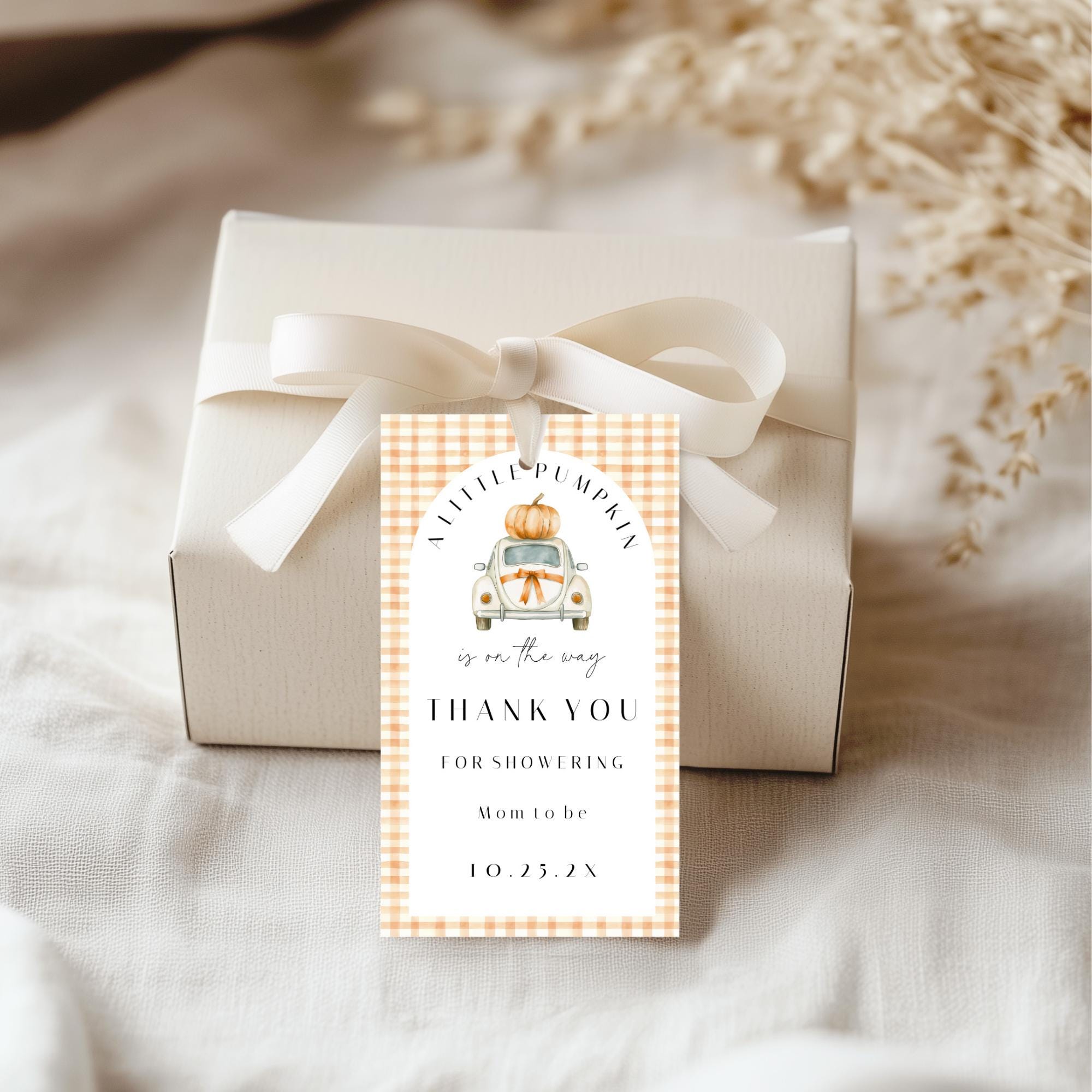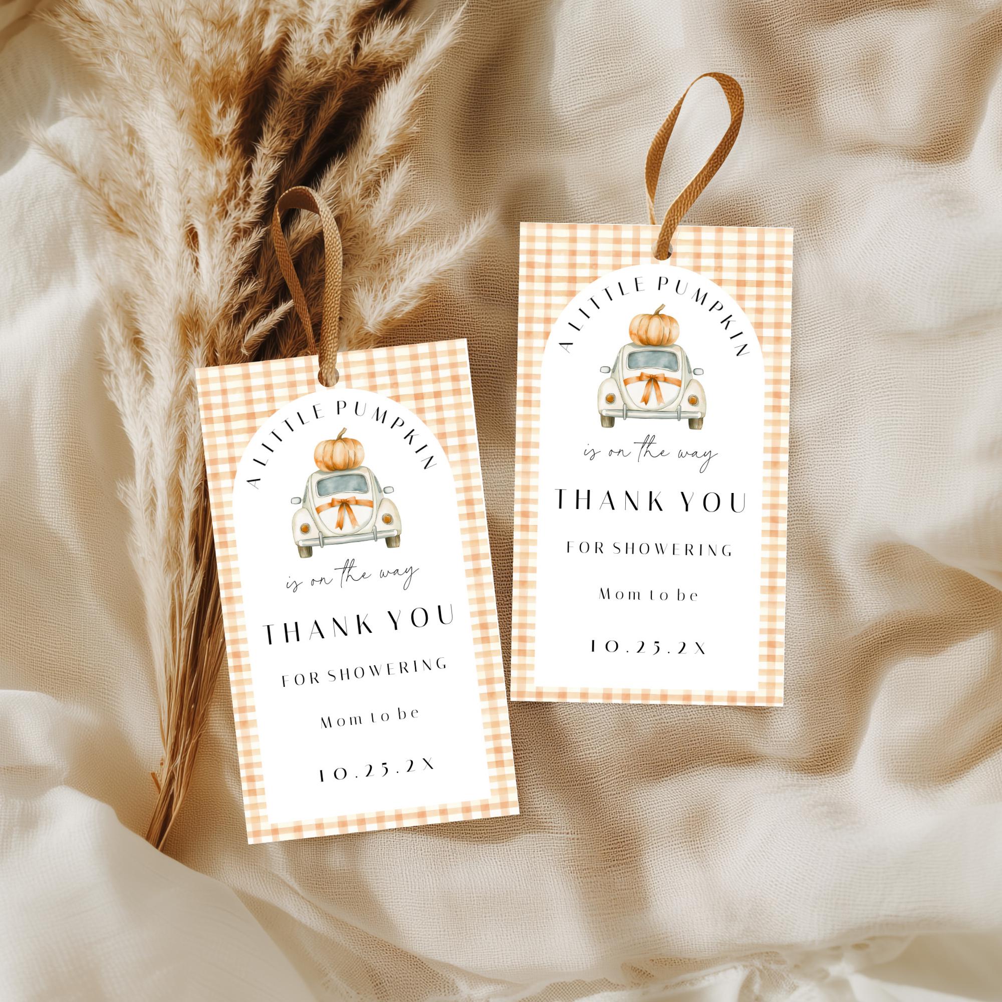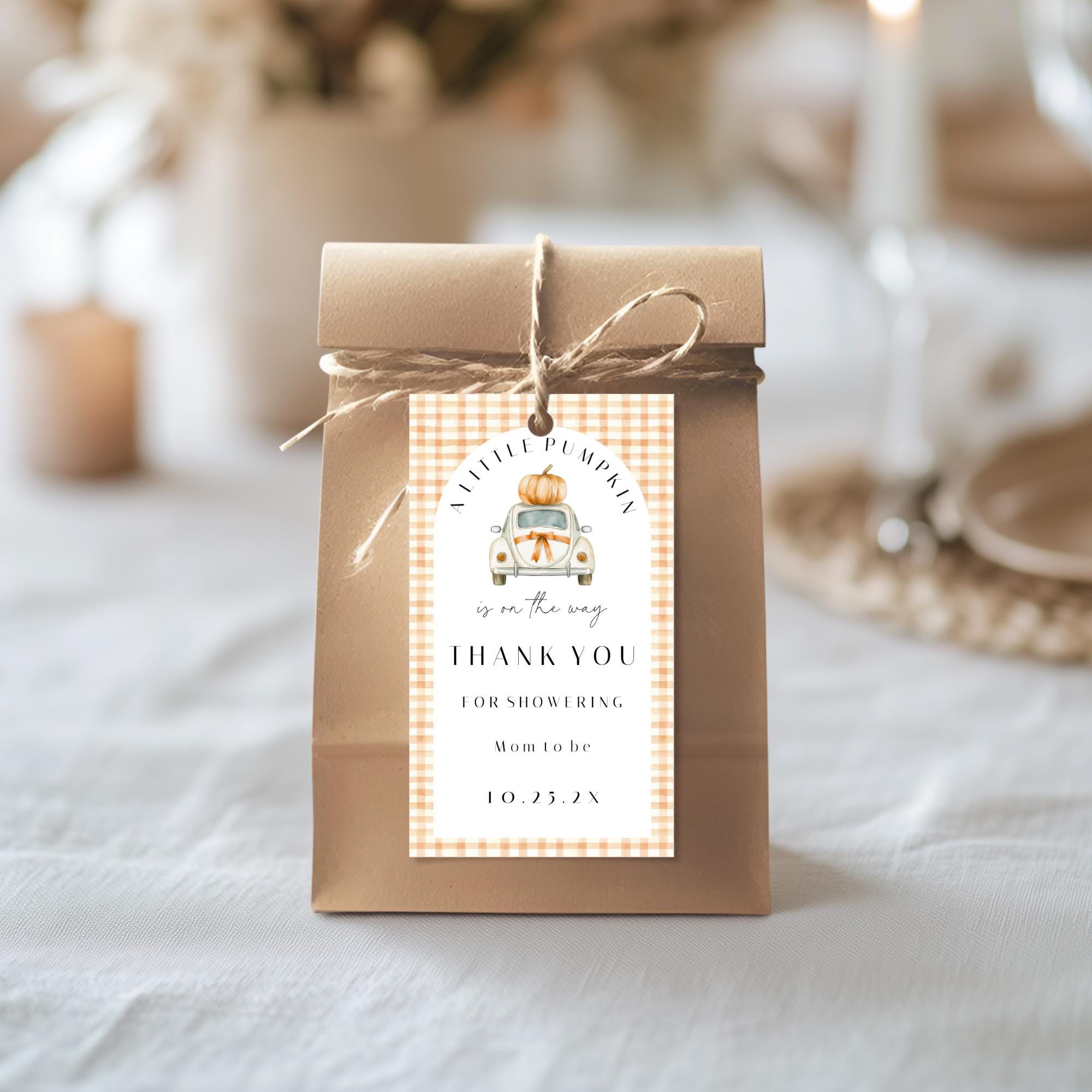 Fall Pumpkin Baby shower Favor Tag Template. An Instant download digital file for you to edit in your web browser with Templett straight after your purchase. Once personalized you are ready to print.