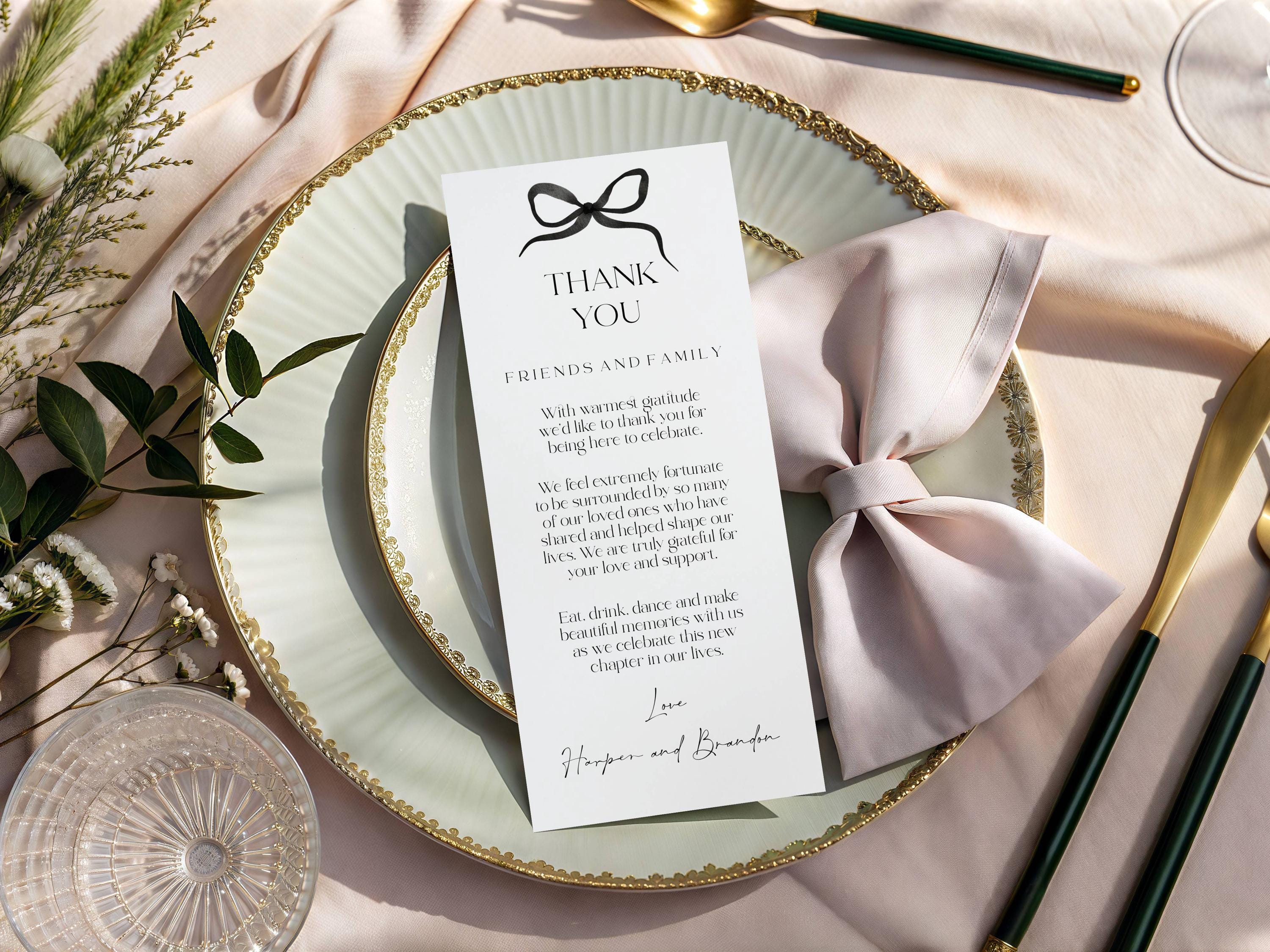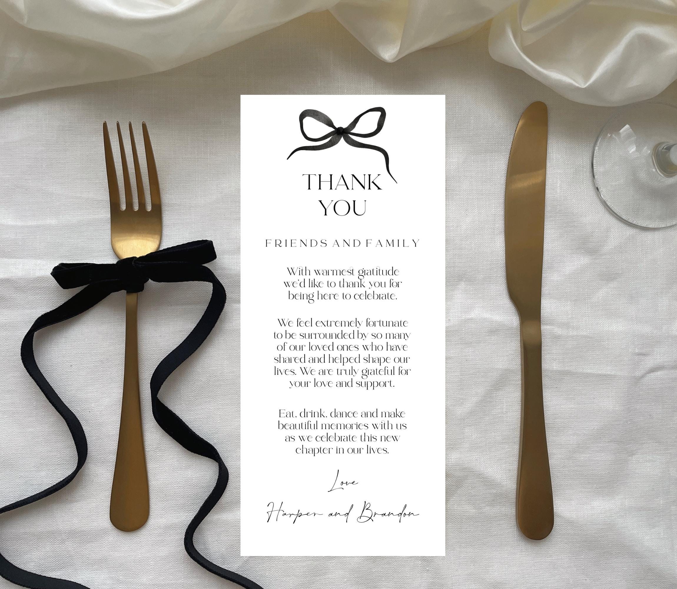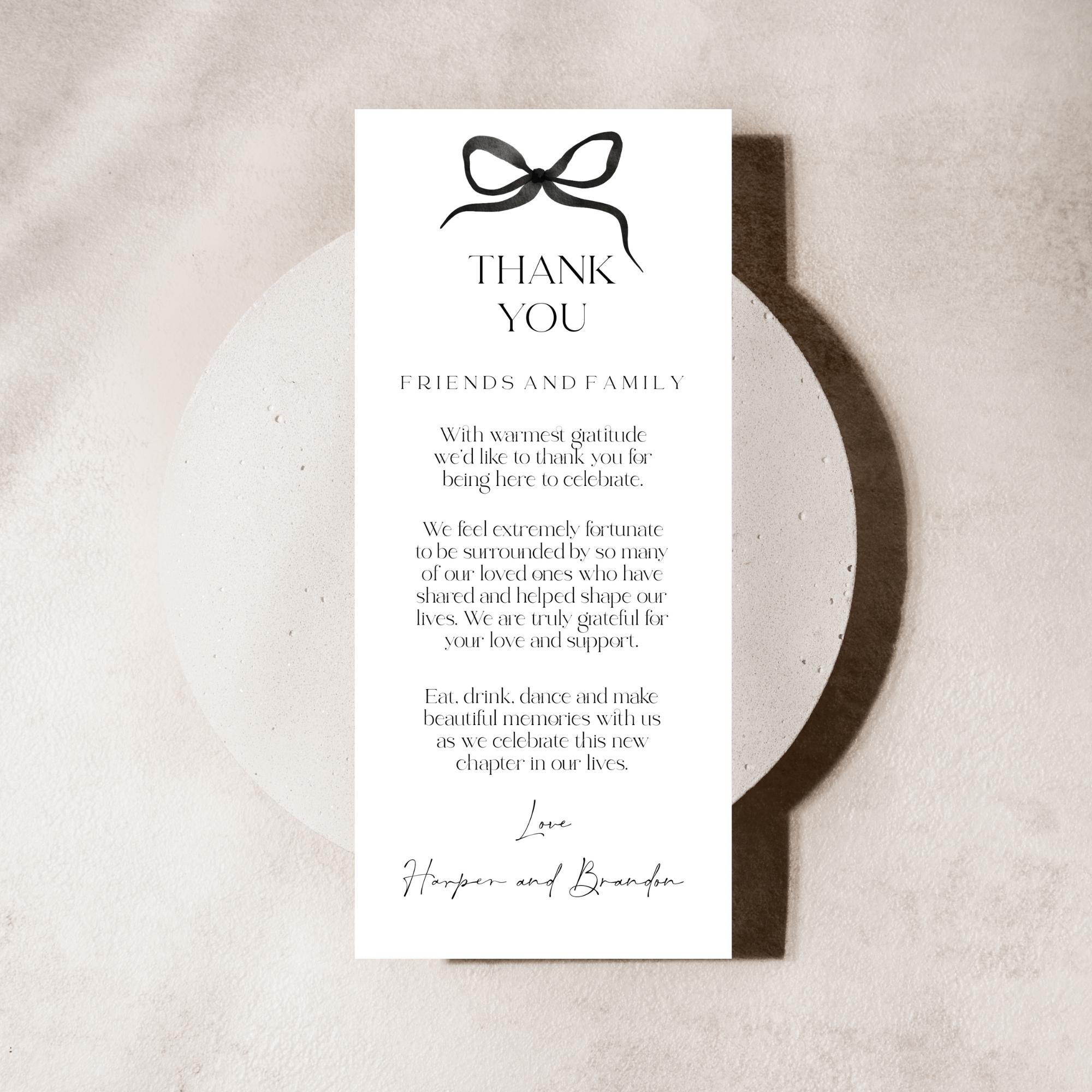 Black Bow Wedding Thank You Place Card Template. An Instant download digital file for you to edit in your web browser with Templett straight after your purchase. Once personalized you are ready to print.