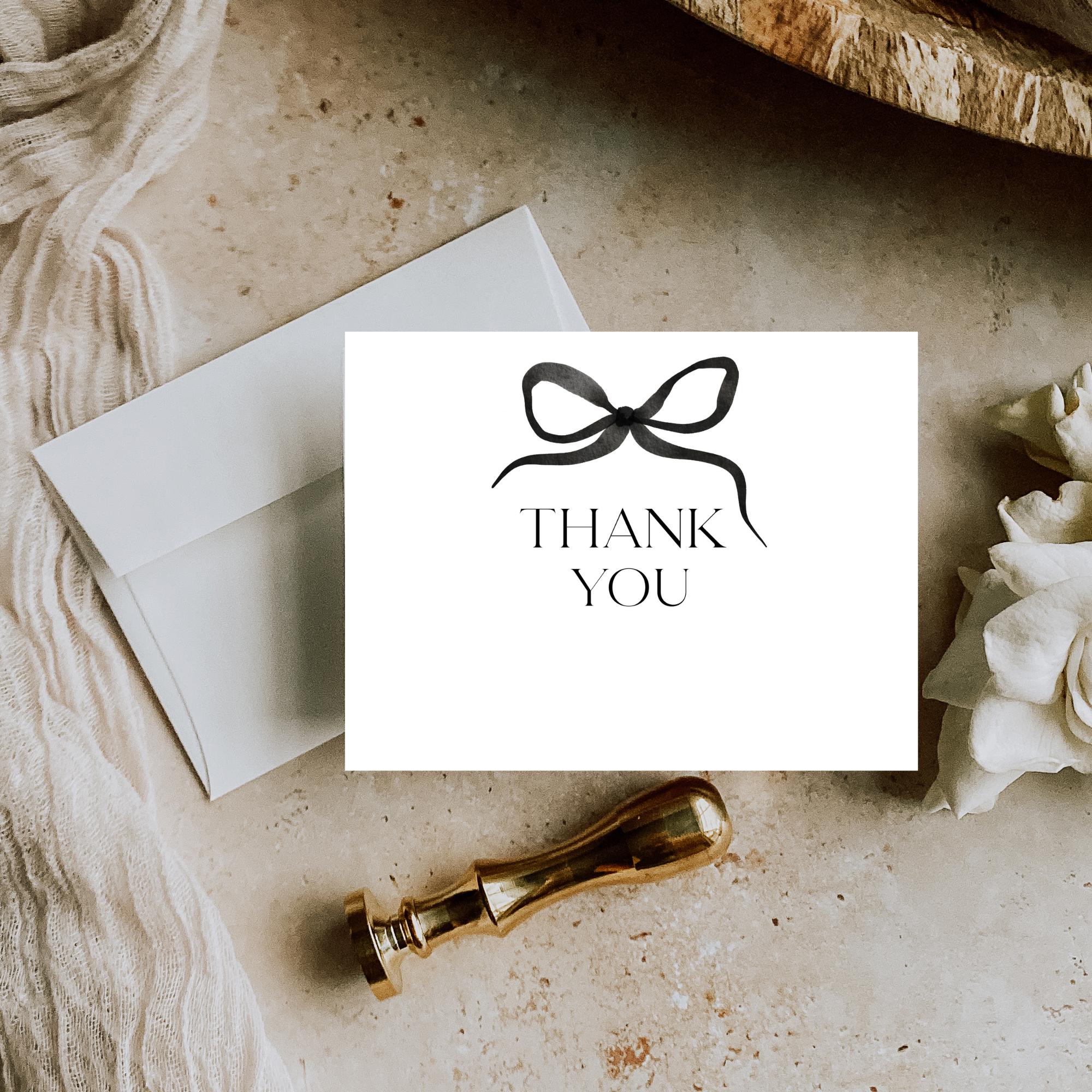 Modern Black Bow Thank You Card Template. An Instant download digital file for you to edit in your web browser with Templett straight after your purchase. Once personalized you are ready to print.