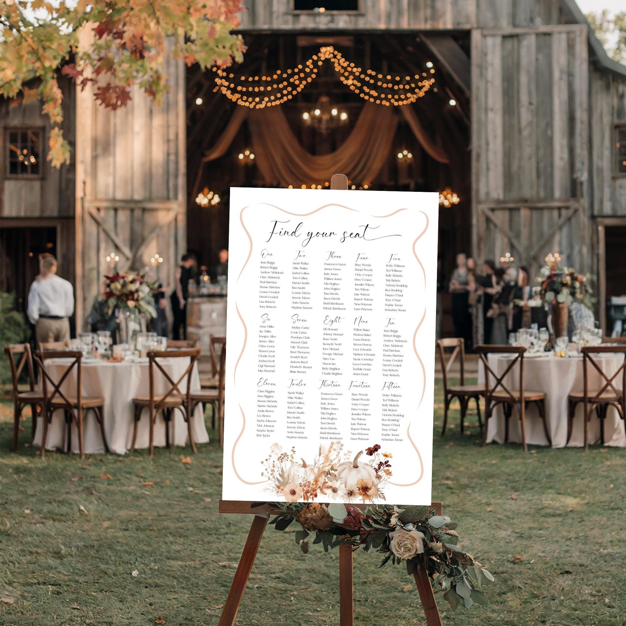 Modern Fall Wedding Seating Plan Sign Template. An Instant download digital file for you to edit in your web browser with Templett straight after your purchase. Once personalized you are ready to print.