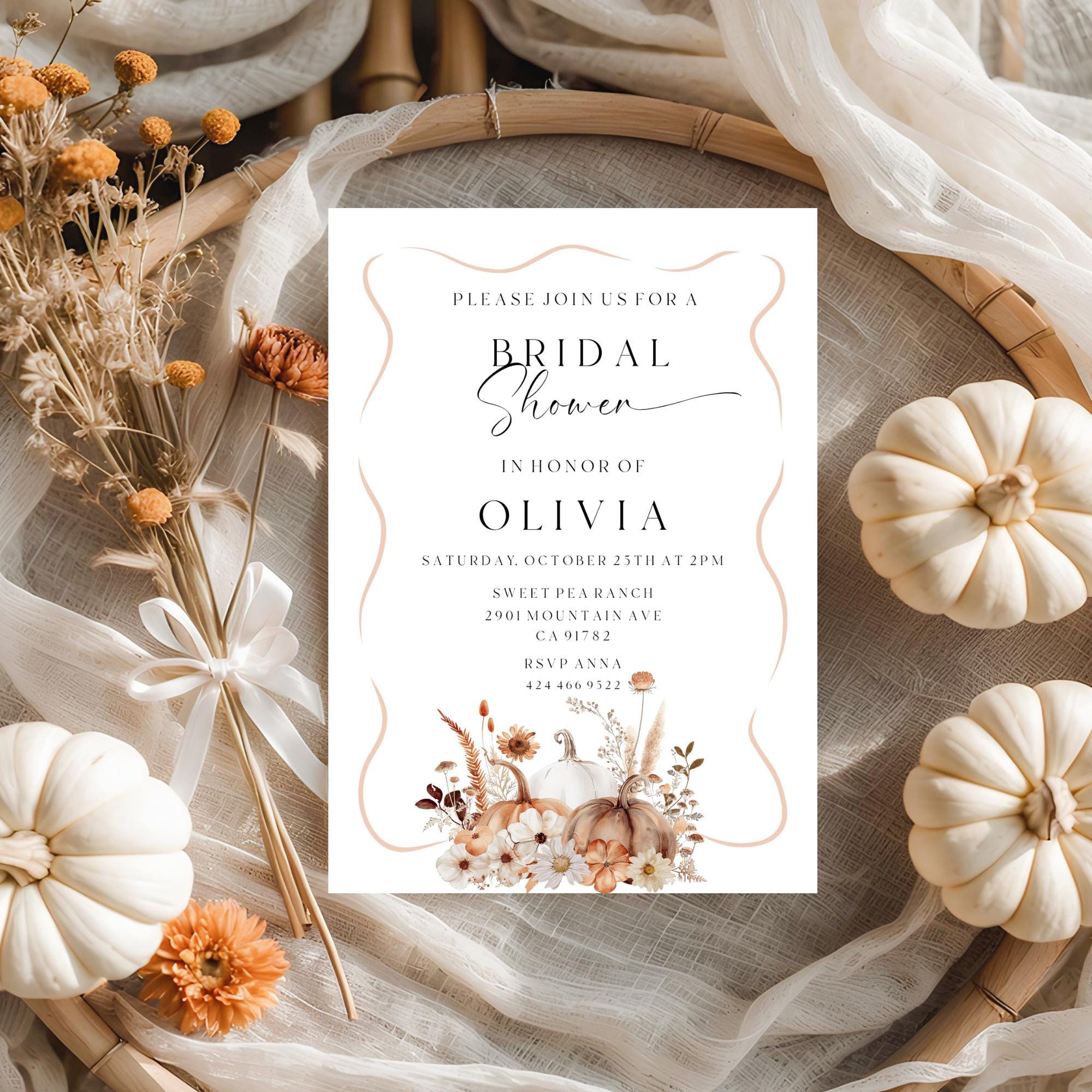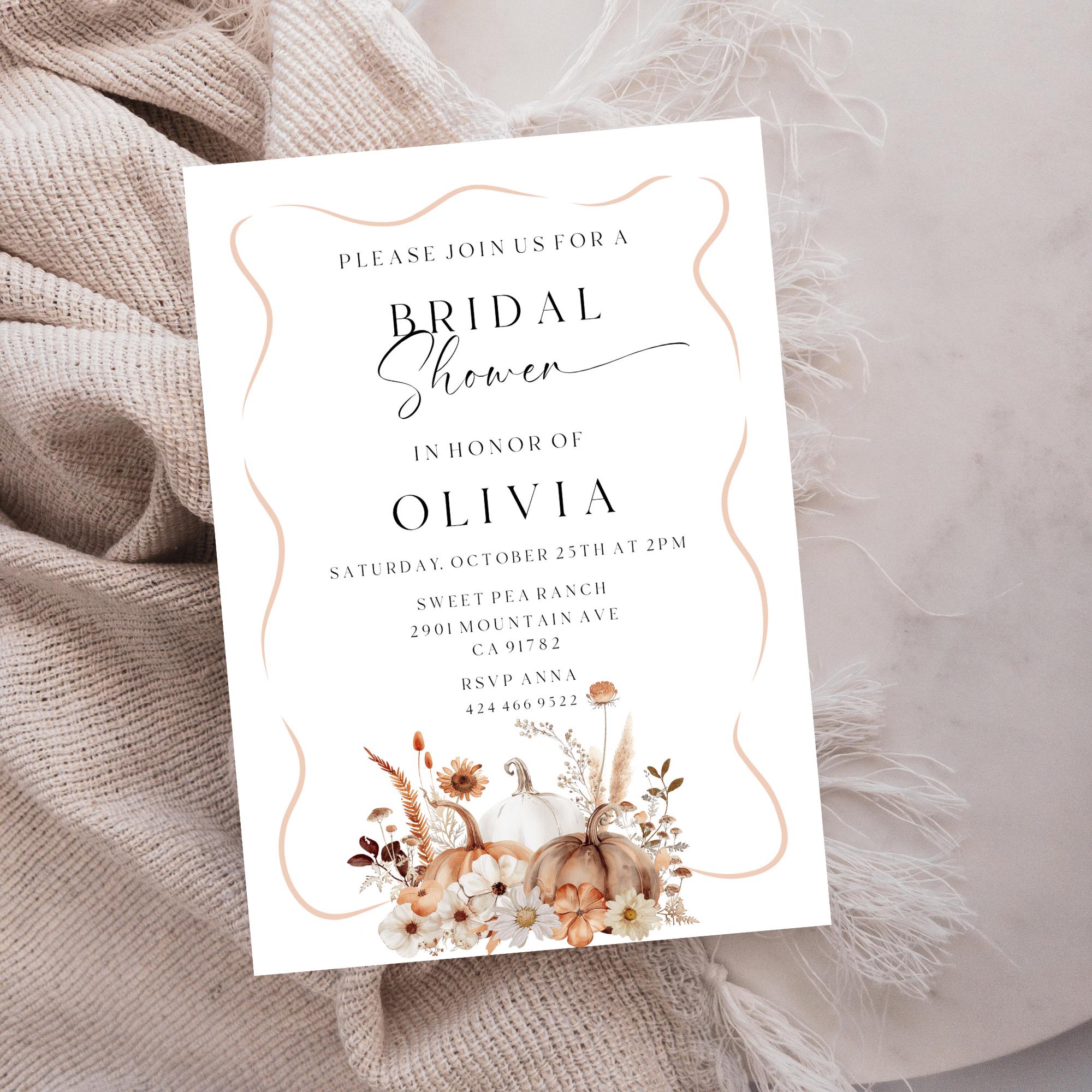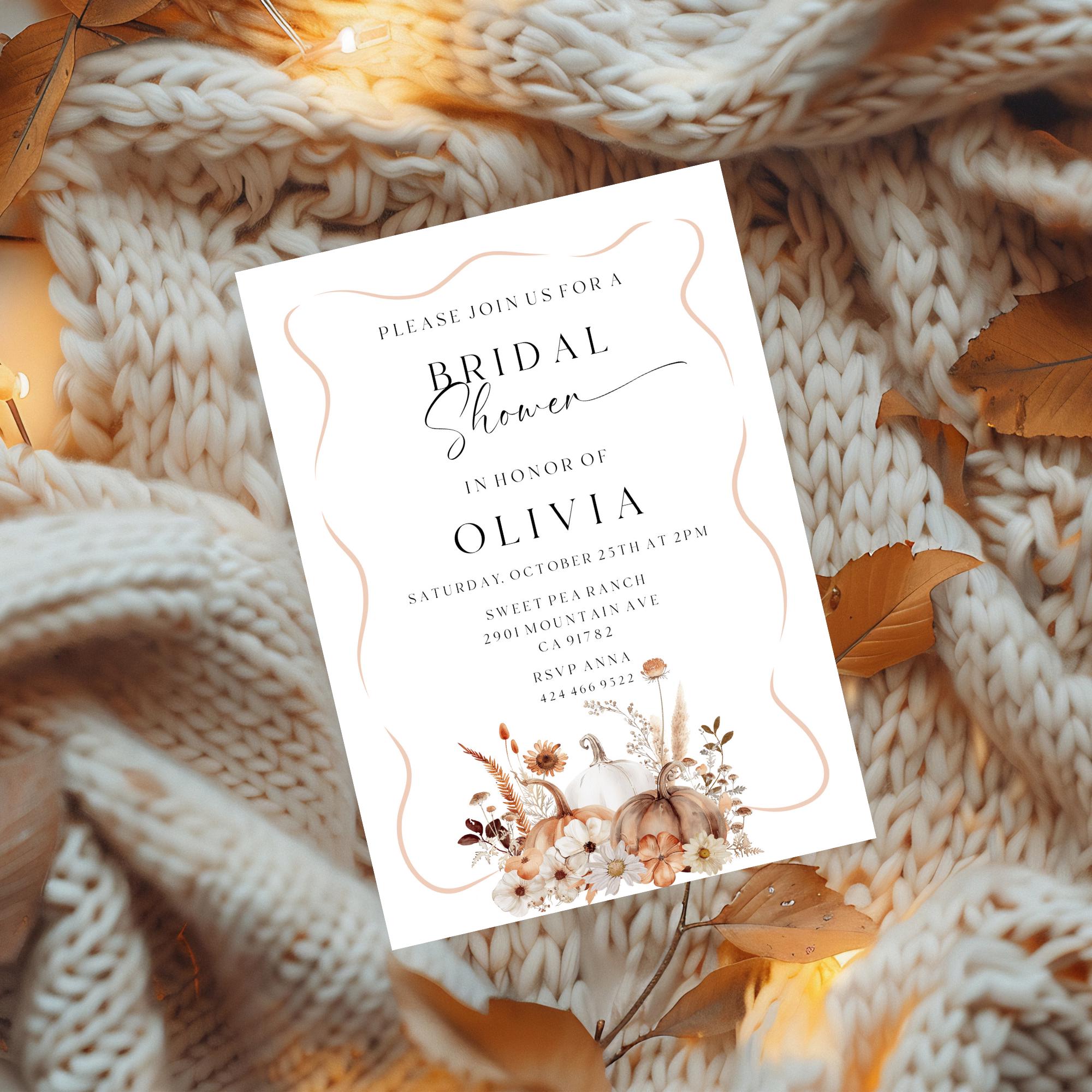 Modern Fall Bridal Shower Invitation Template. An Instant download digital file for you to edit in your web browser with Templett straight after your purchase. Once personalized you are ready to print.
