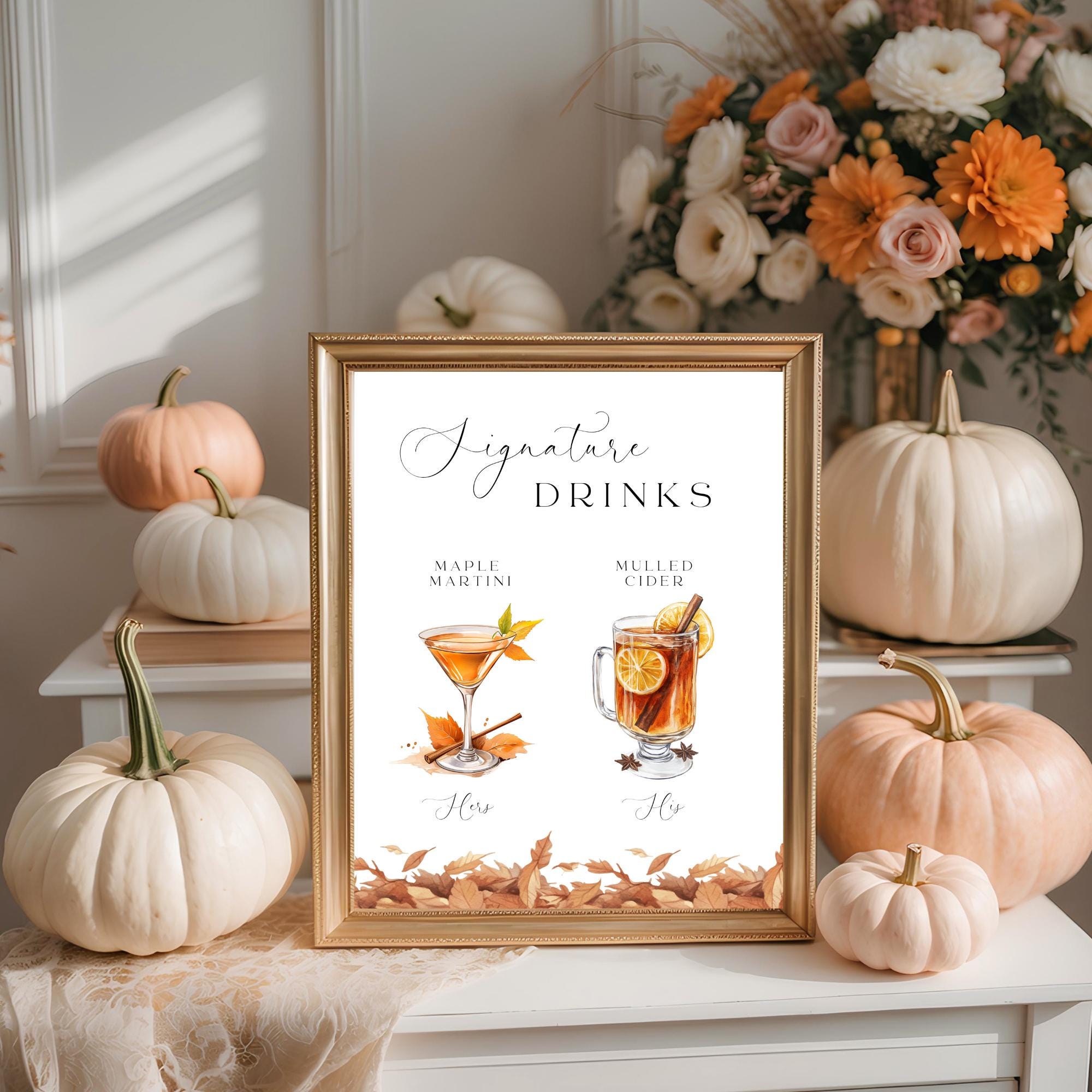 Fall Leaves Signature Drinks Sign Template. An Instant download digital file for you to edit in your web browser with Templett straight after your purchase. Once personalized you are ready to print.