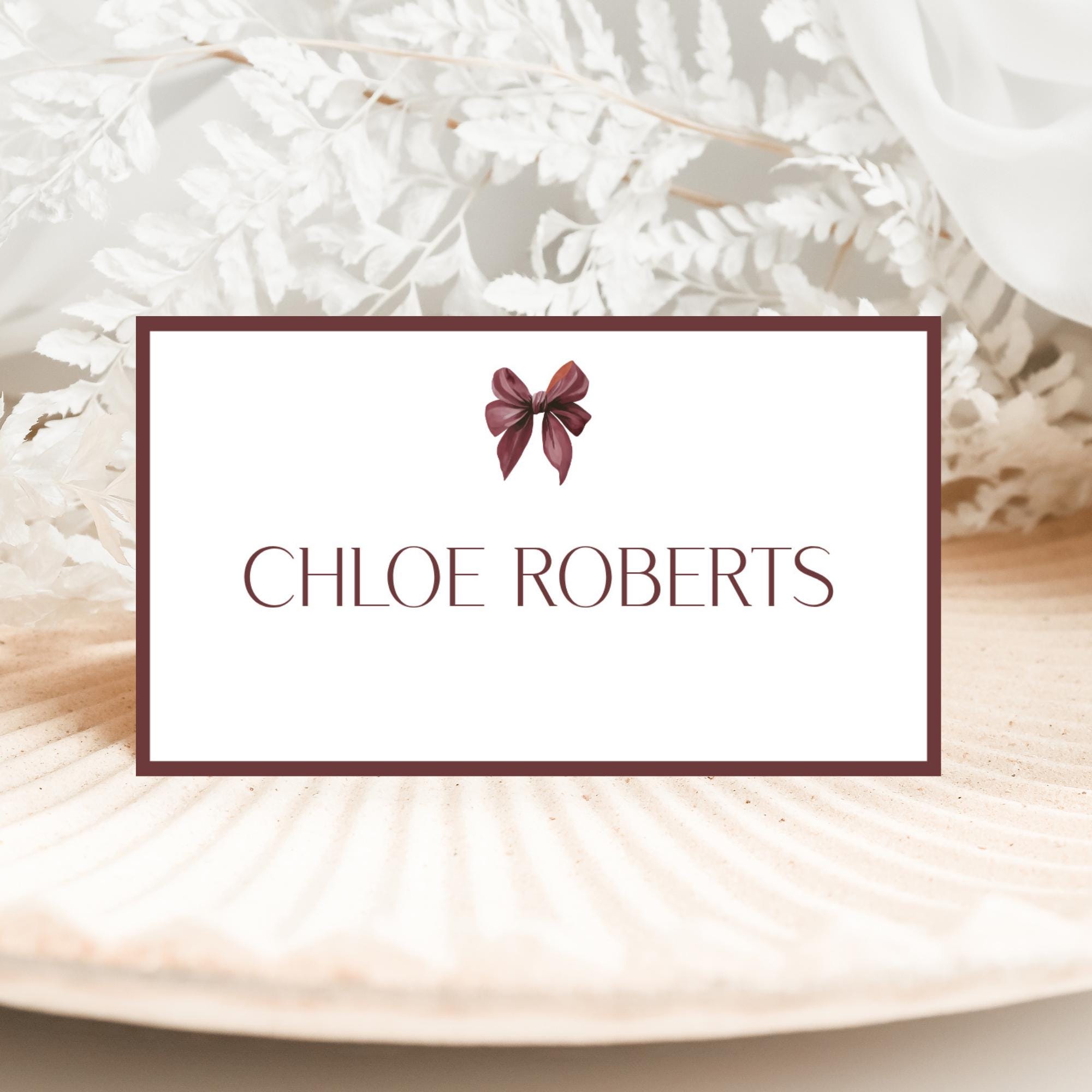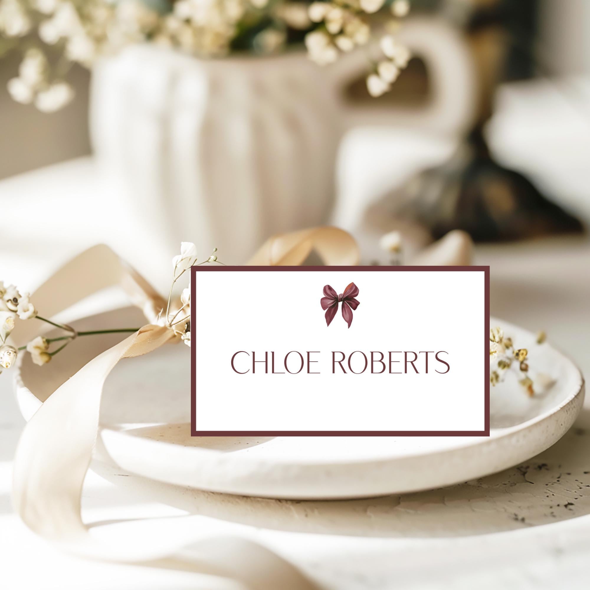 Burgundy Bow Place Card Template. An Instant download digital file for you to edit in your web browser with Templett straight after your purchase. Once personalized you are ready to print.