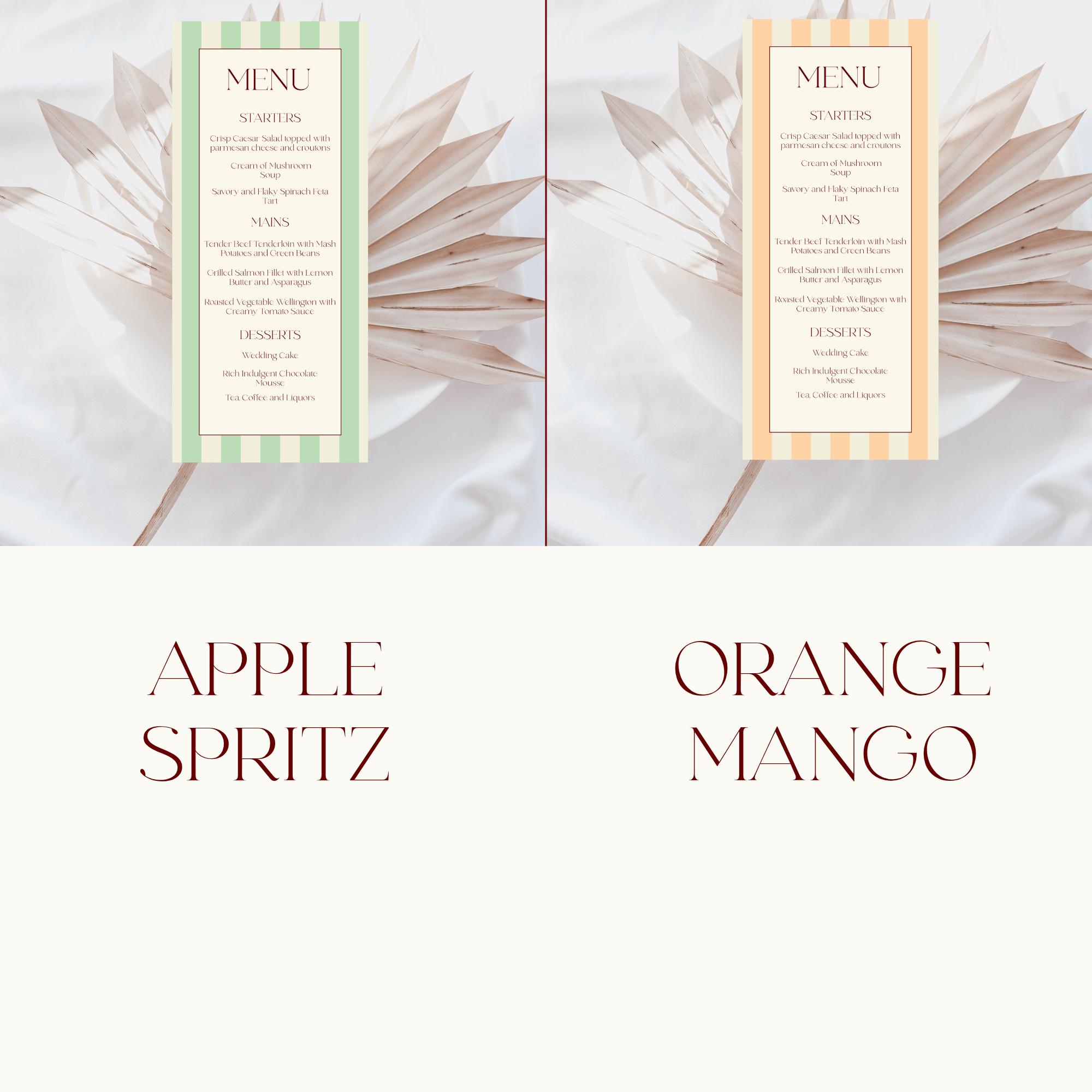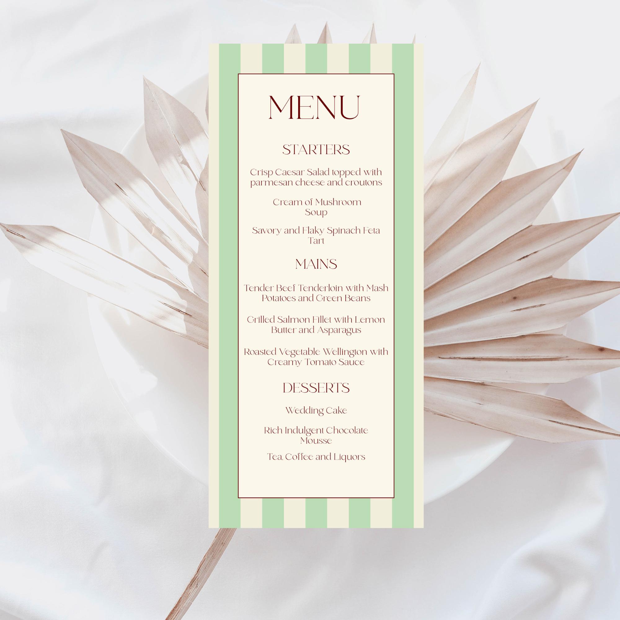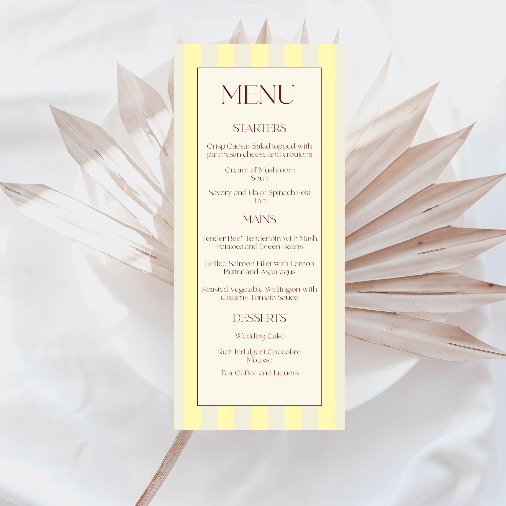 Modern Florence Striped Wedding Menu Template. An Instant download digital file for you to edit in your web browser with Templett straight after your purchase. Once personalized you are ready to print.