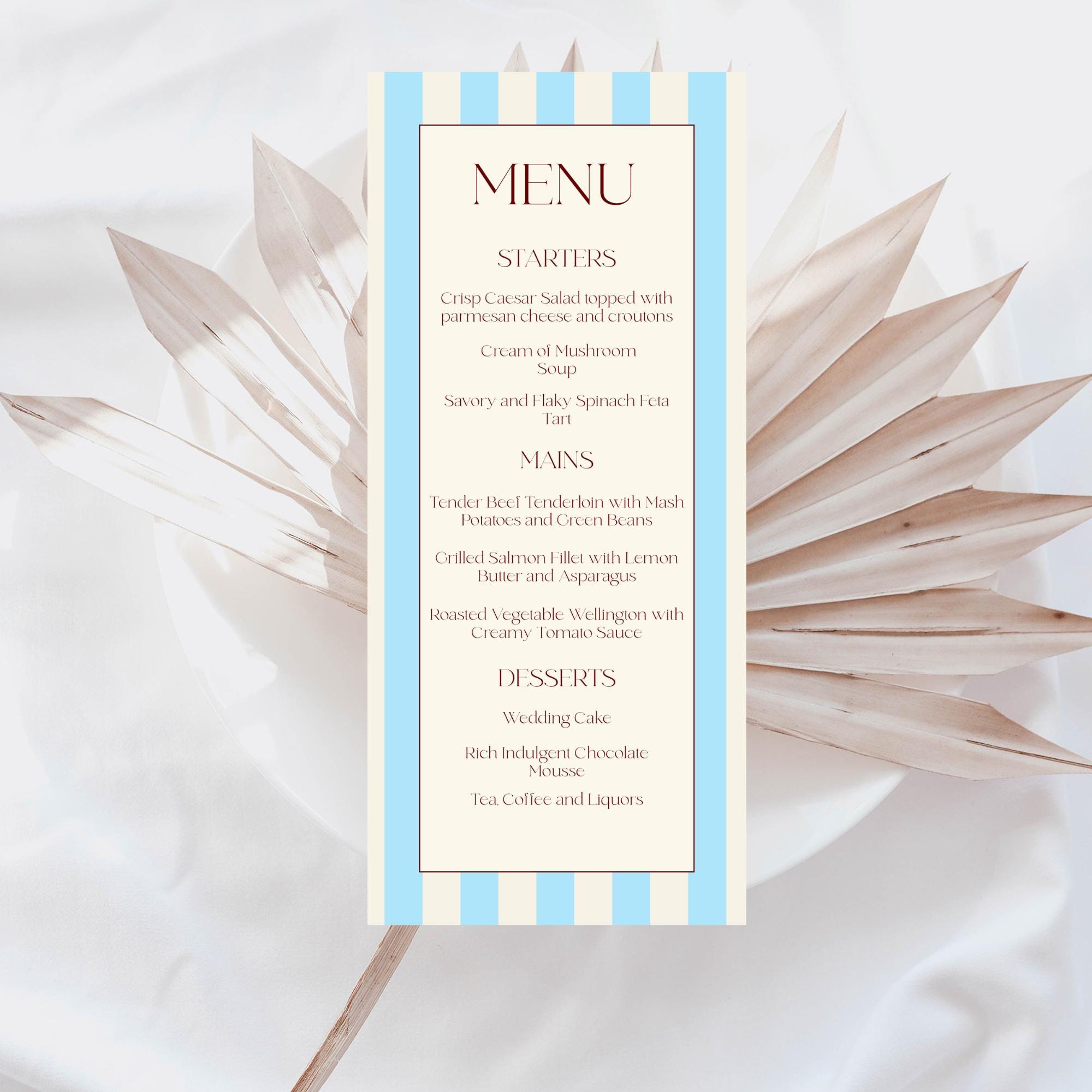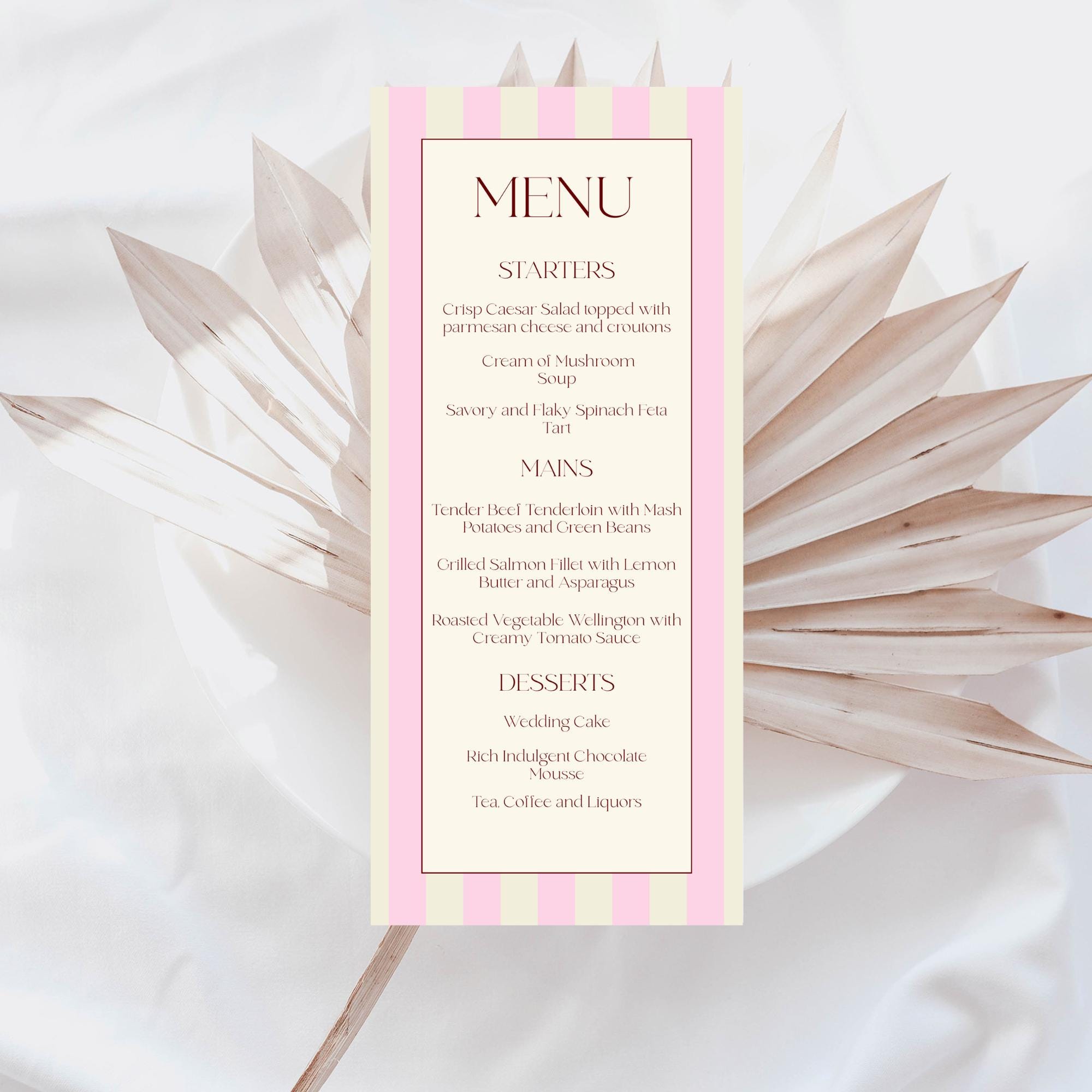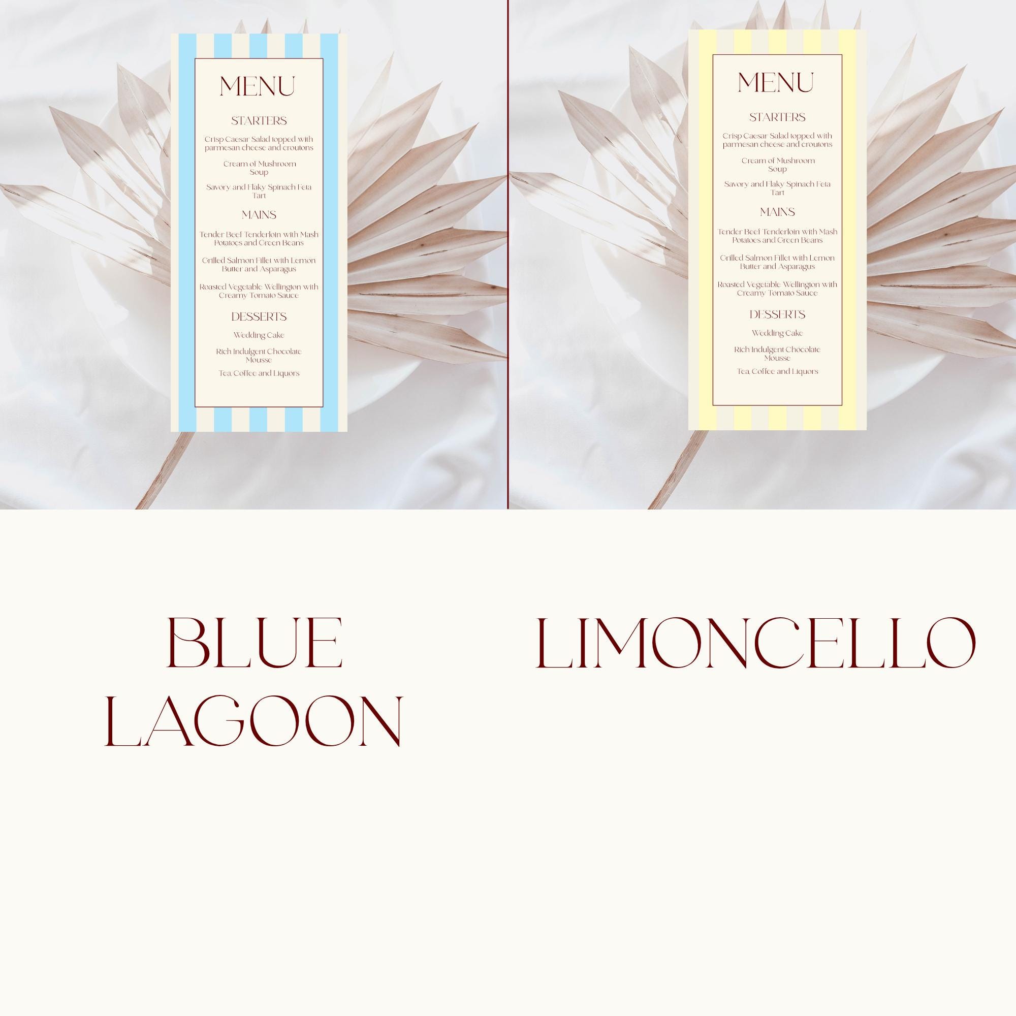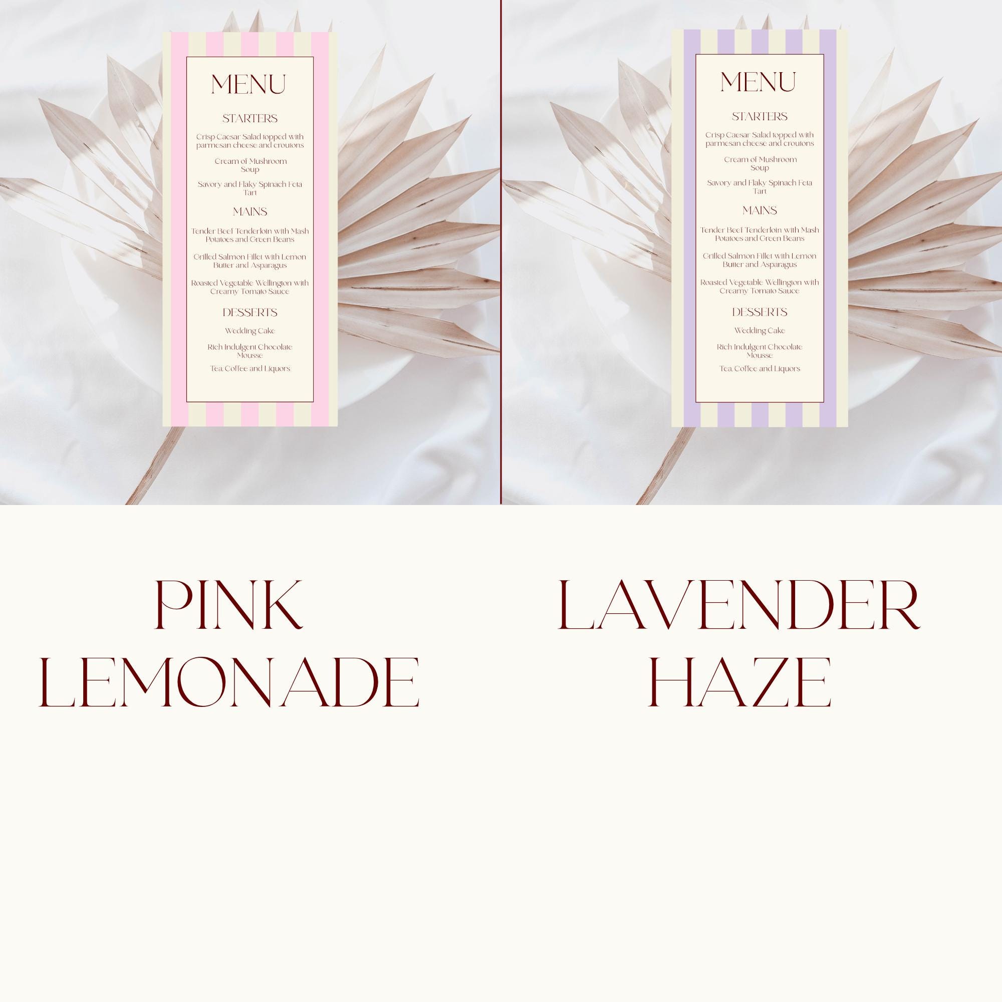 Modern Florence Striped Wedding Menu Template. An Instant download digital file for you to edit in your web browser with Templett straight after your purchase. Once personalized you are ready to print.