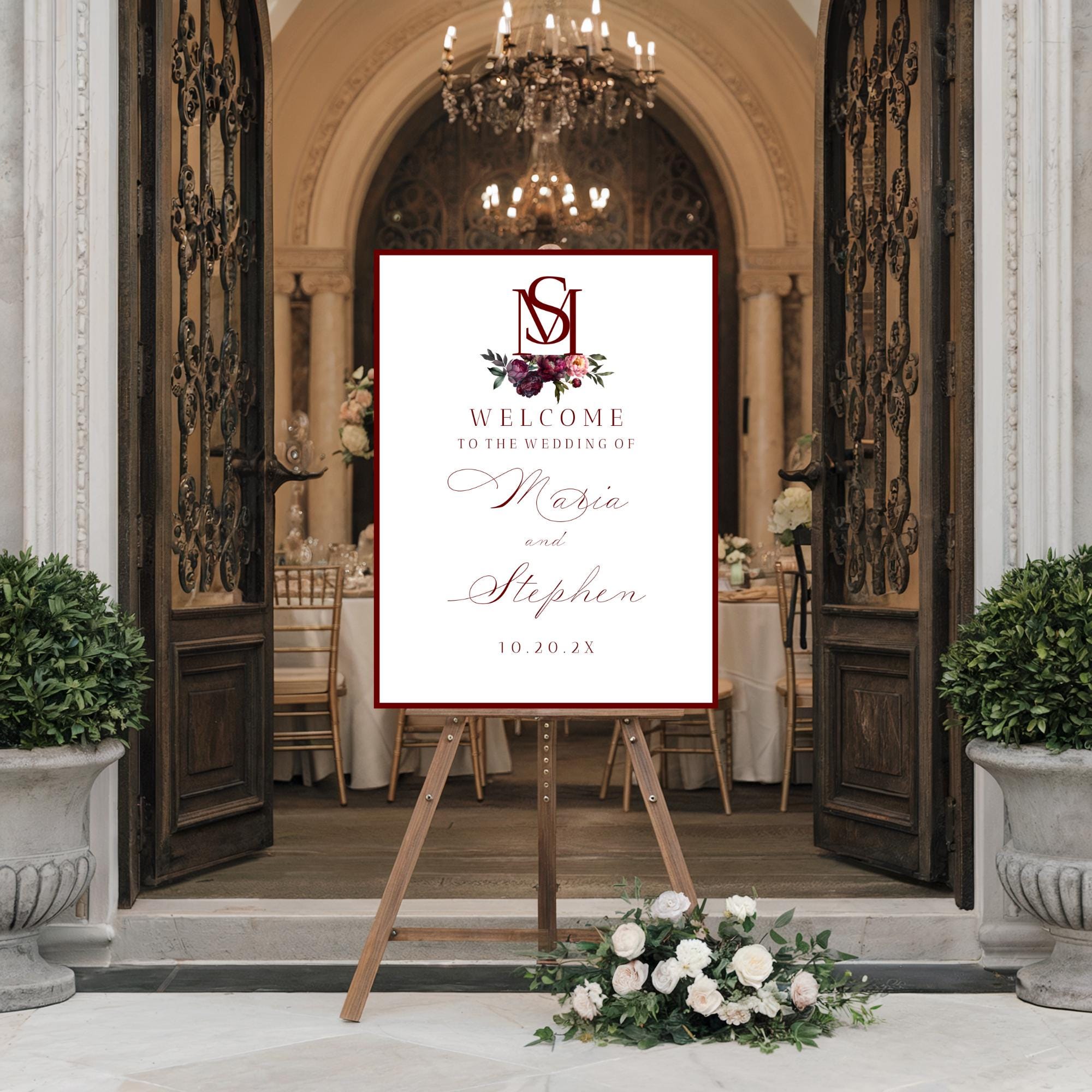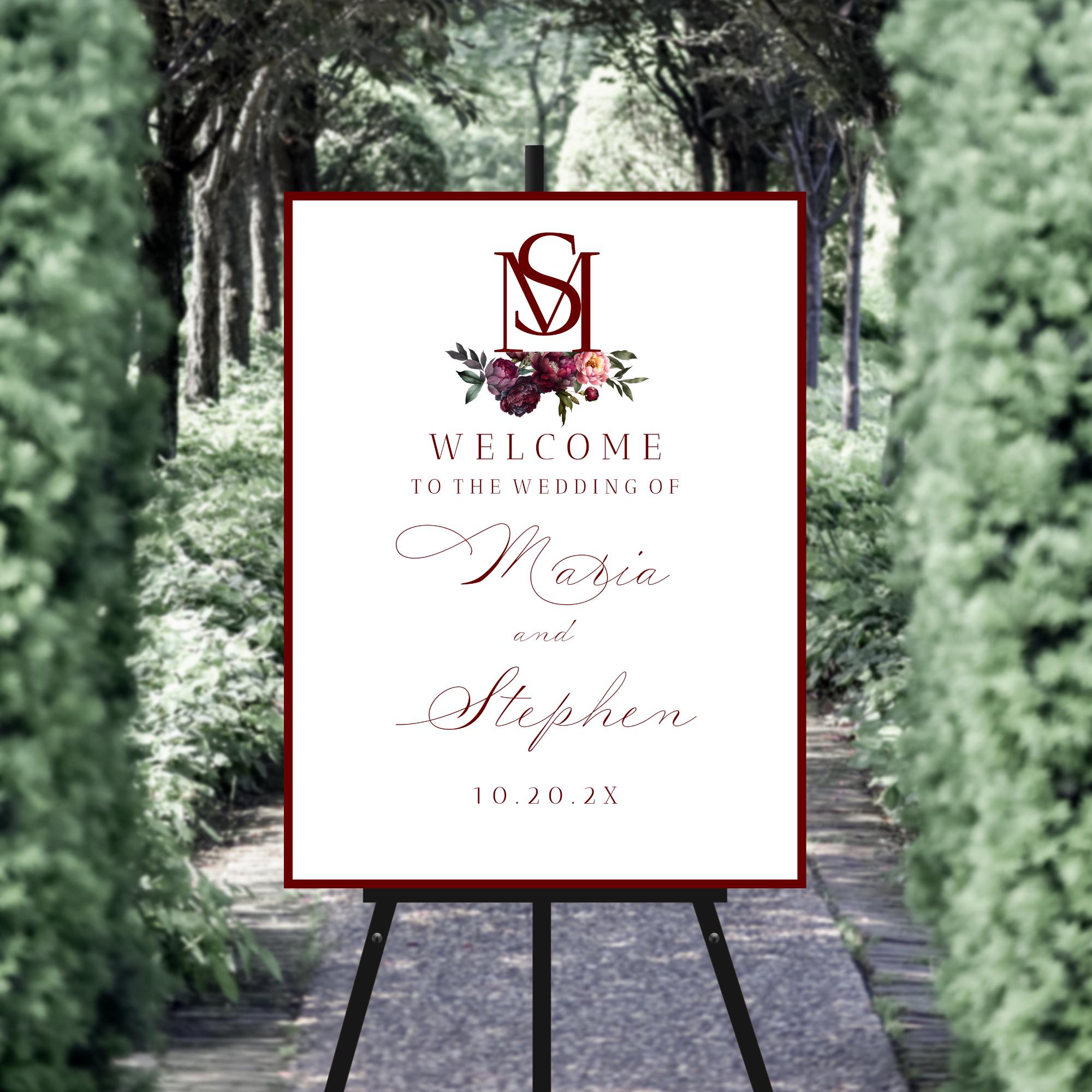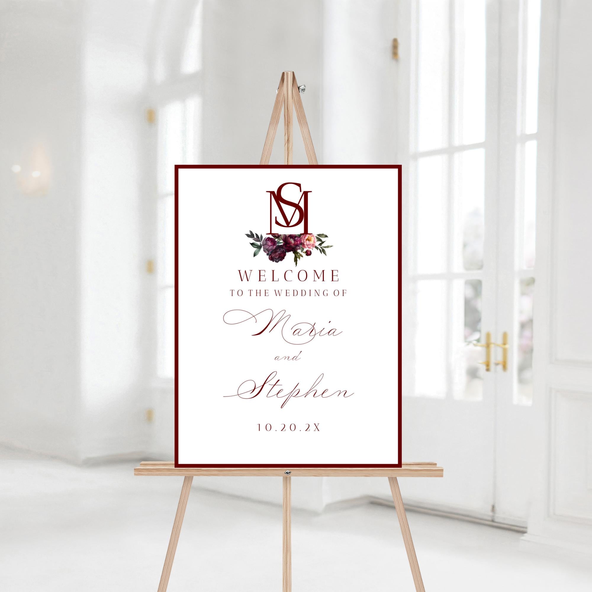 Burgundy Initial Wedding Welcome Sign. An Instant download digital file for you to edit in your web browser with Templett straight after your purchase. Once personalized you are ready to print.