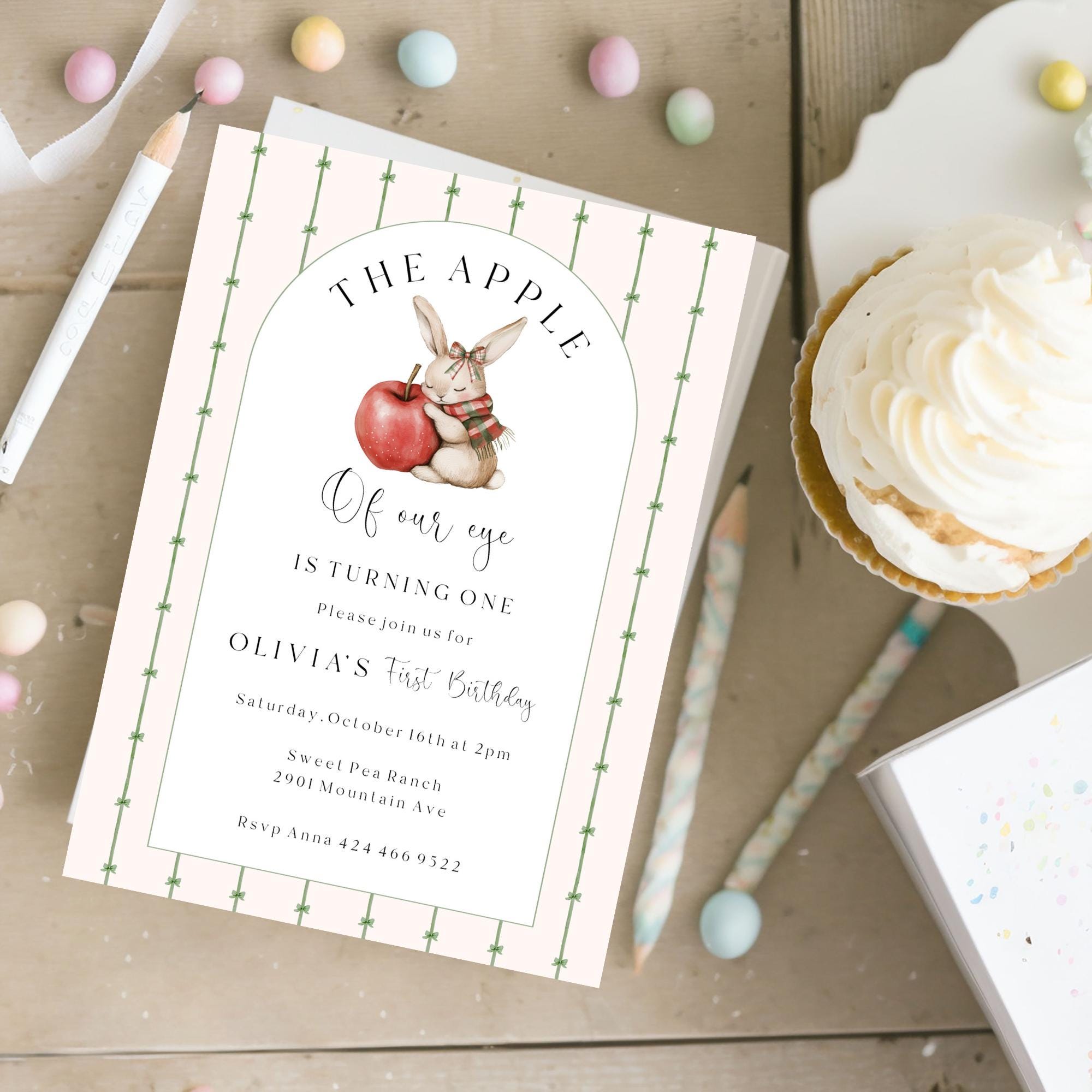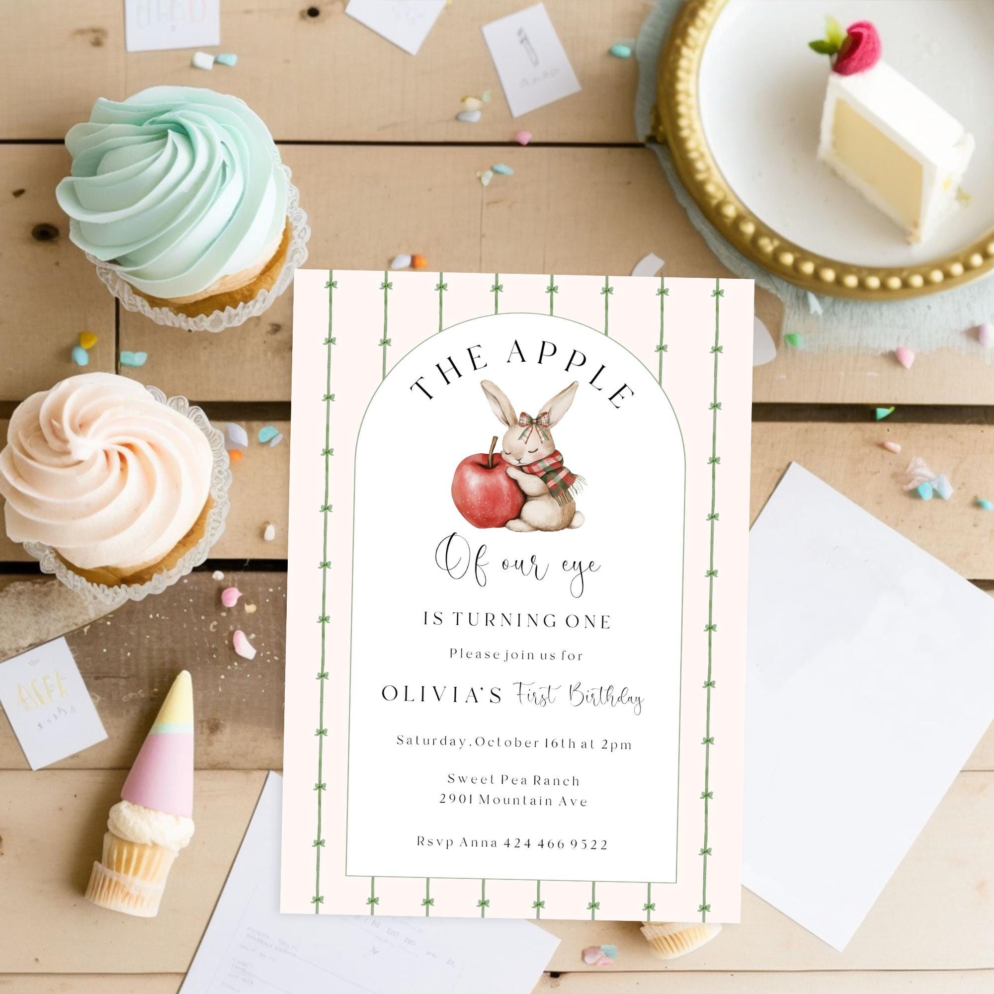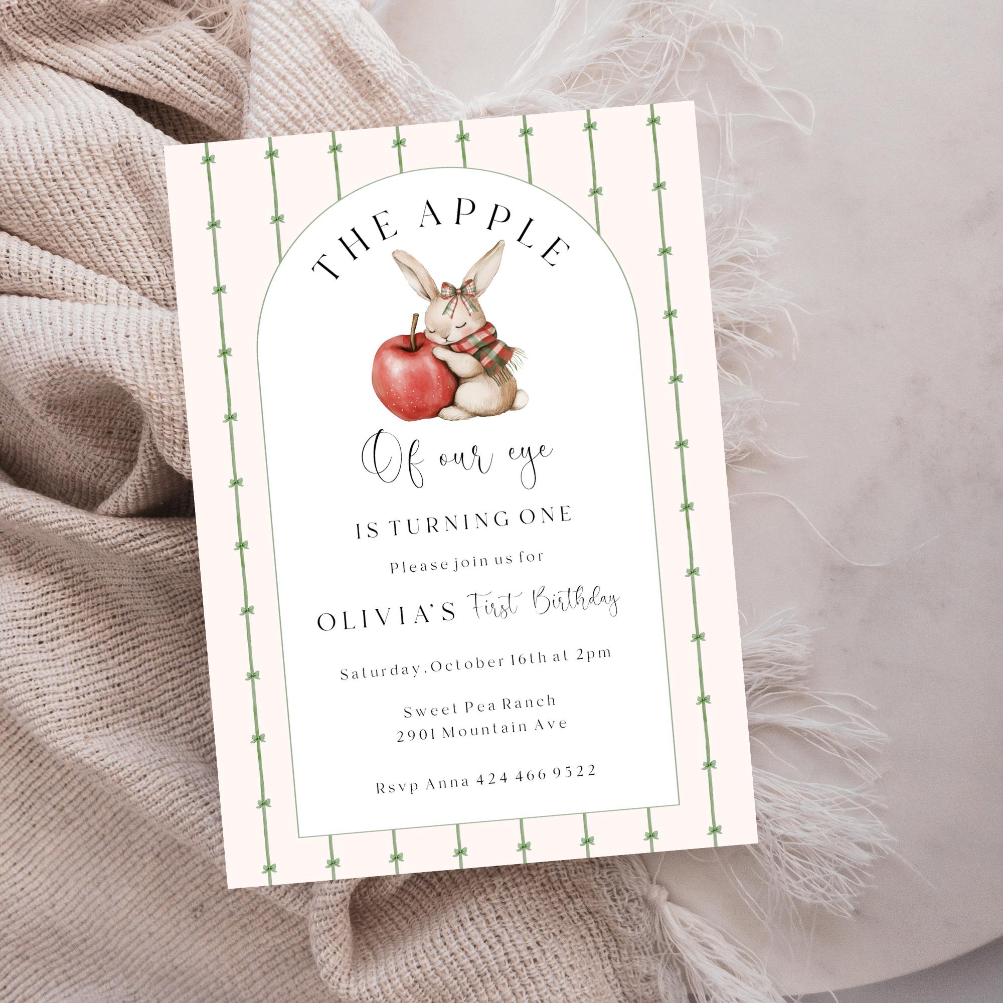 Apple of our eye First Birthday Invitation Template. An Instant download digital file for you to edit in your web browser with Templett straight after your purchase. Once personalized you are ready to print.