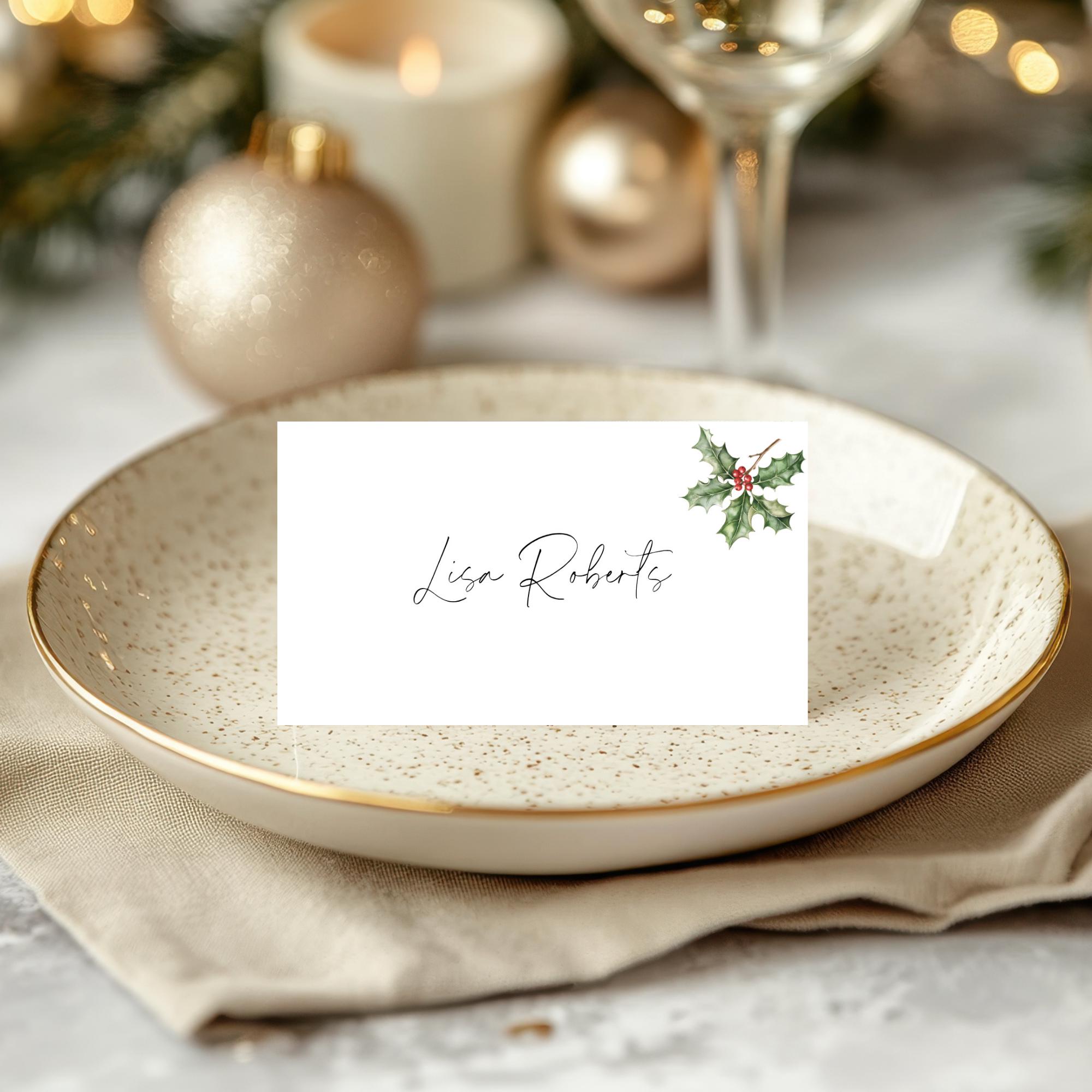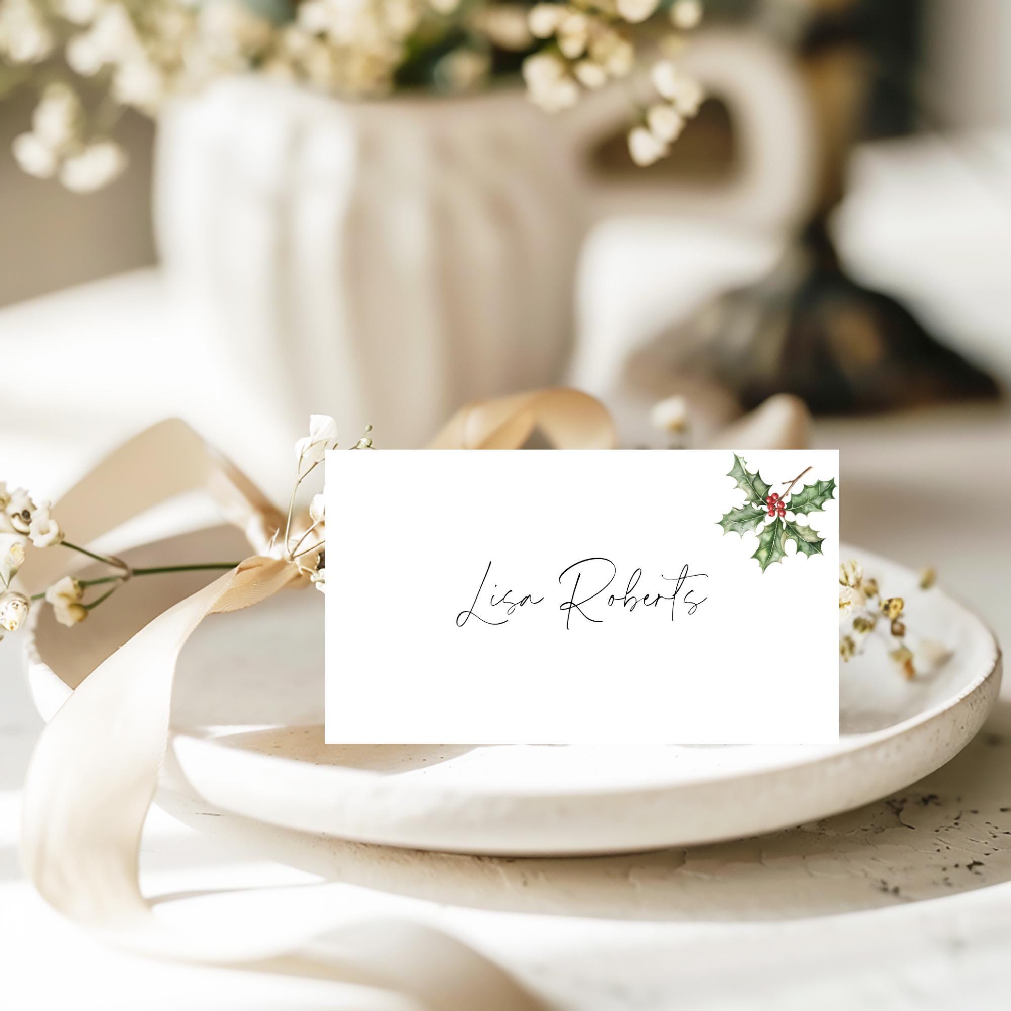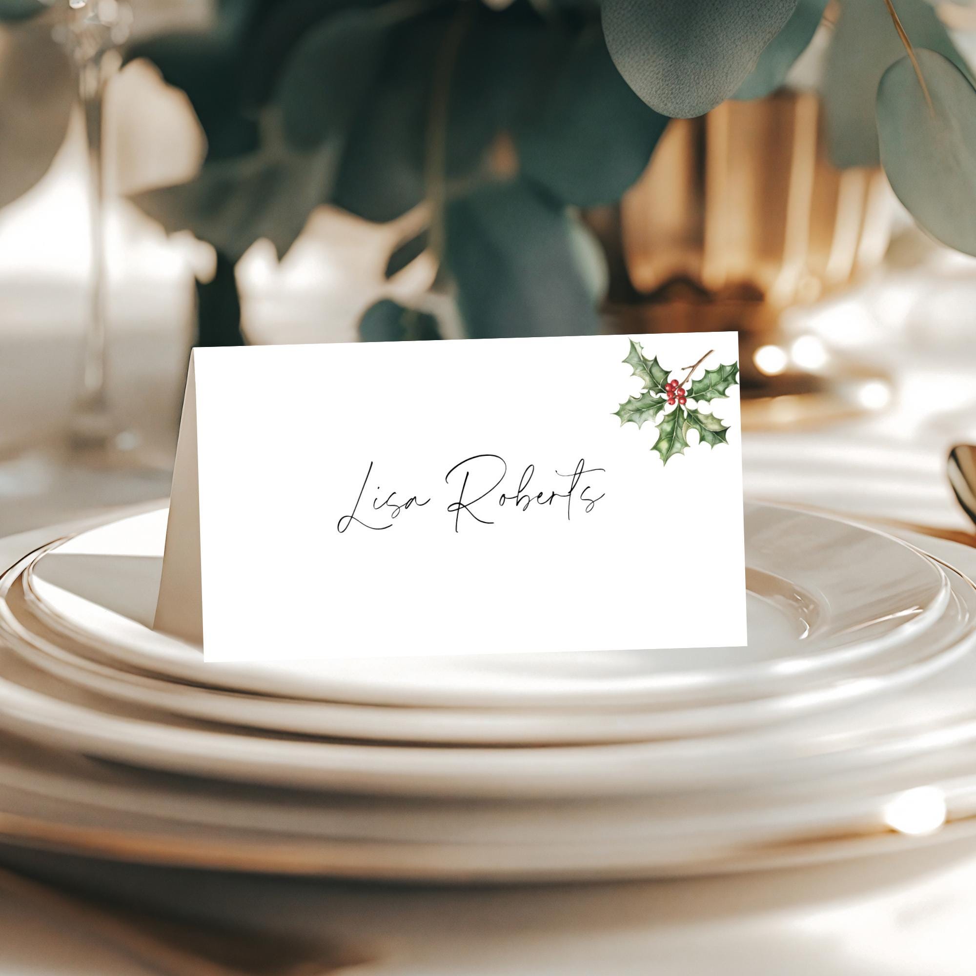 Christmas Holly Wedding Place Card Template. An Instant download digital file for you to edit in your web browser with Templett straight after your purchase. Once personalized you are ready to print.