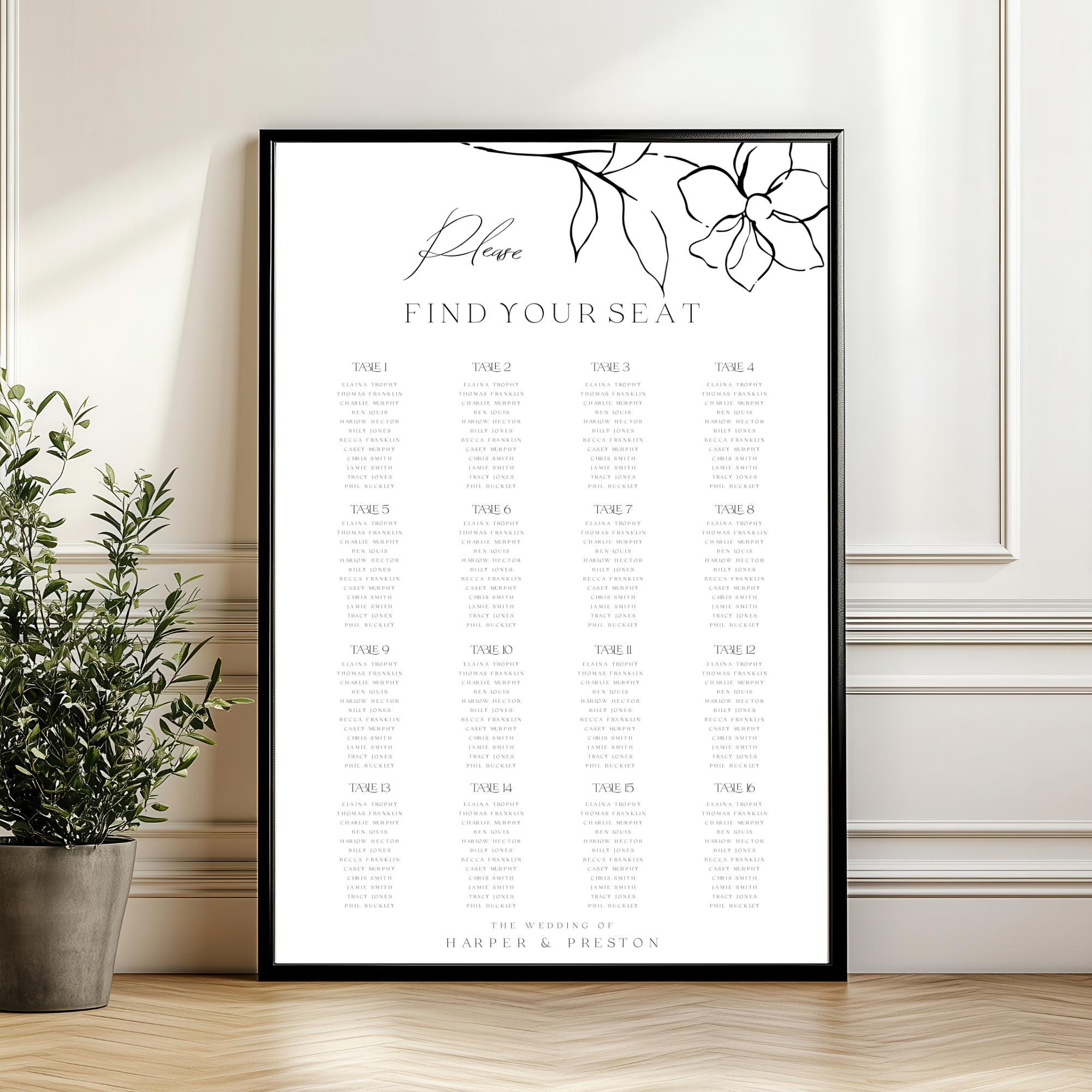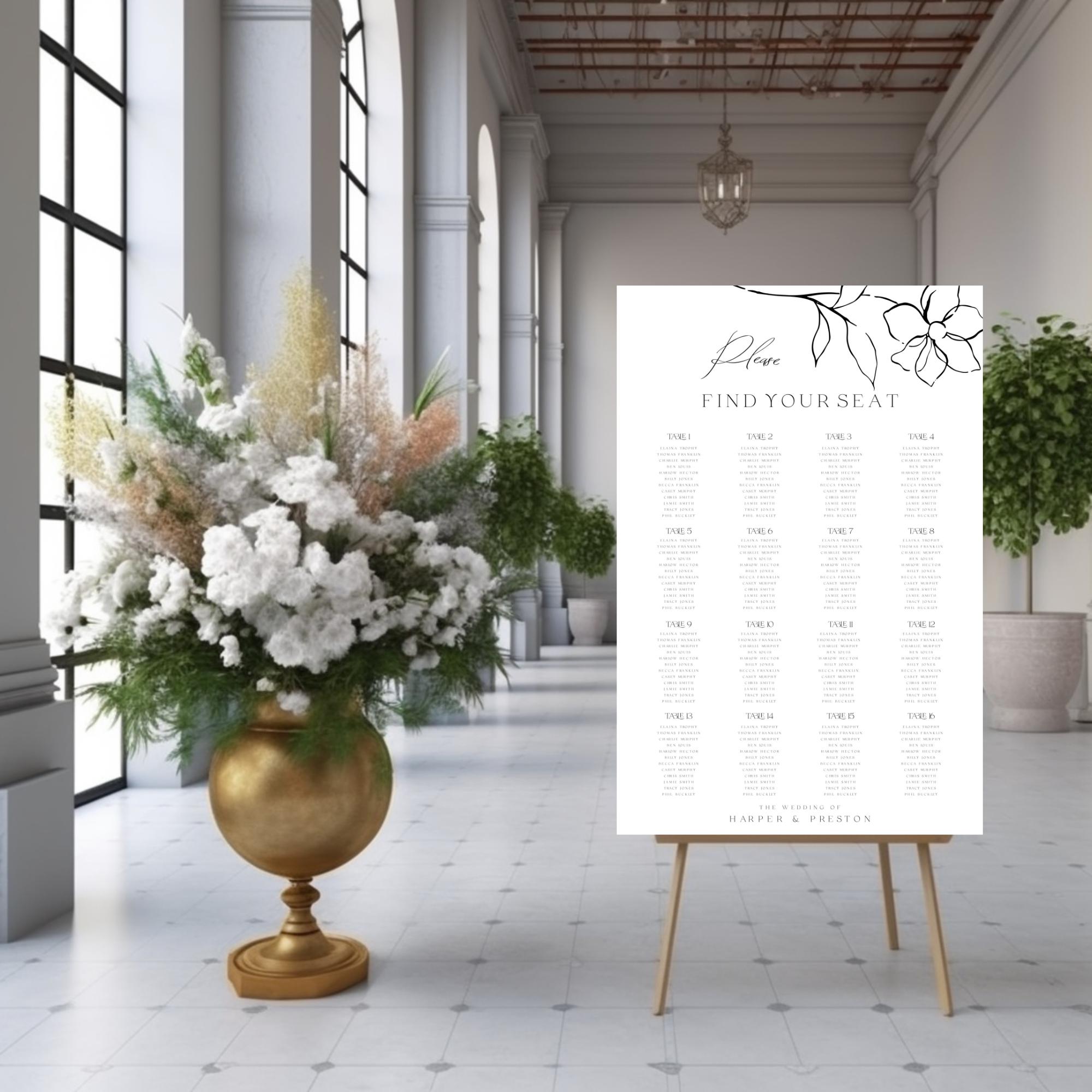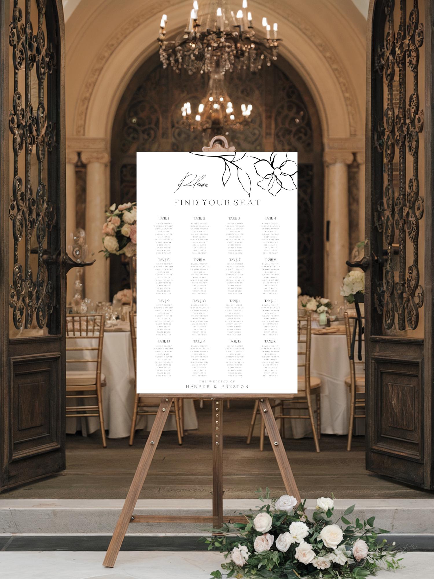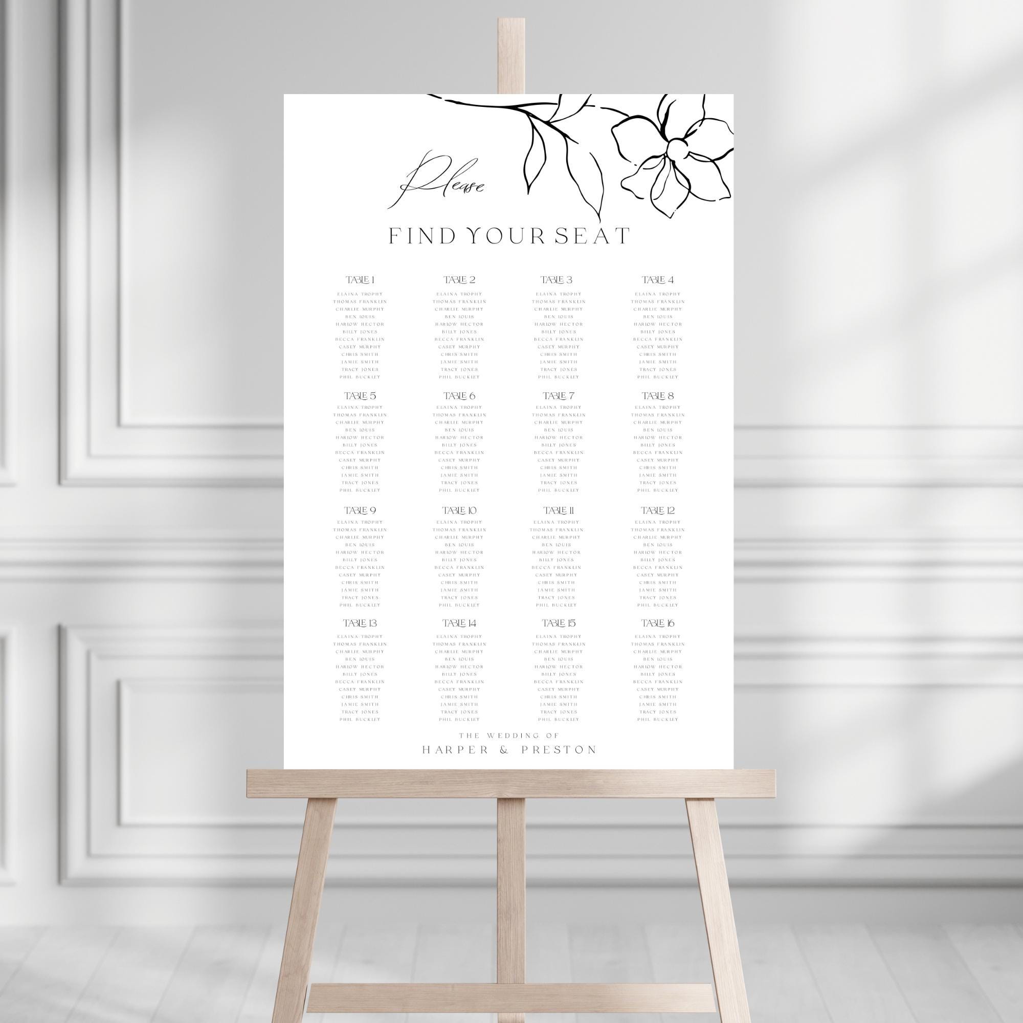 Modern Black and white Wedding Seating Chart Sign Template. An Instant download digital file for you to edit in your web browser with Templett straight after your purchase. Once personalized you are ready to print.