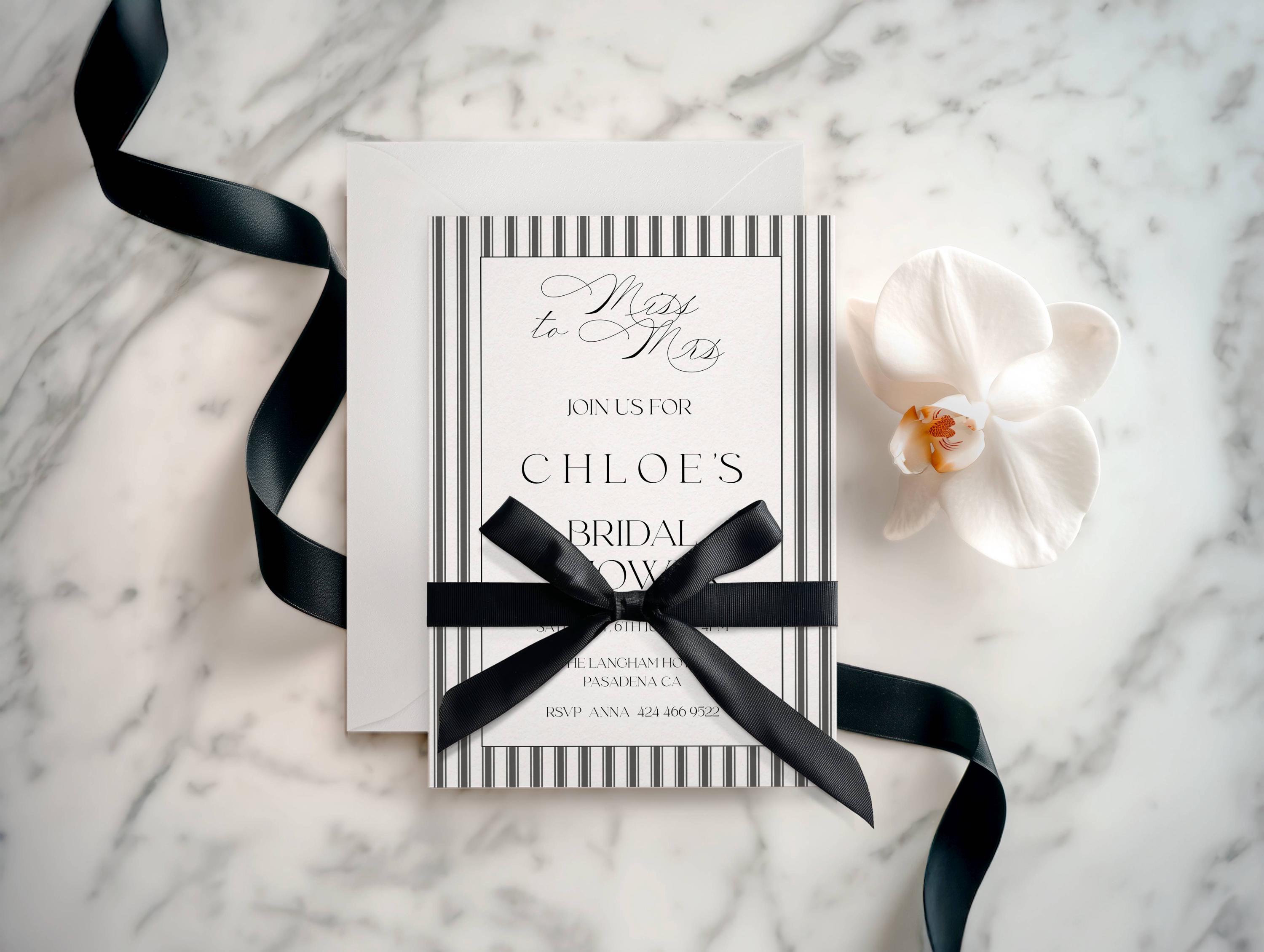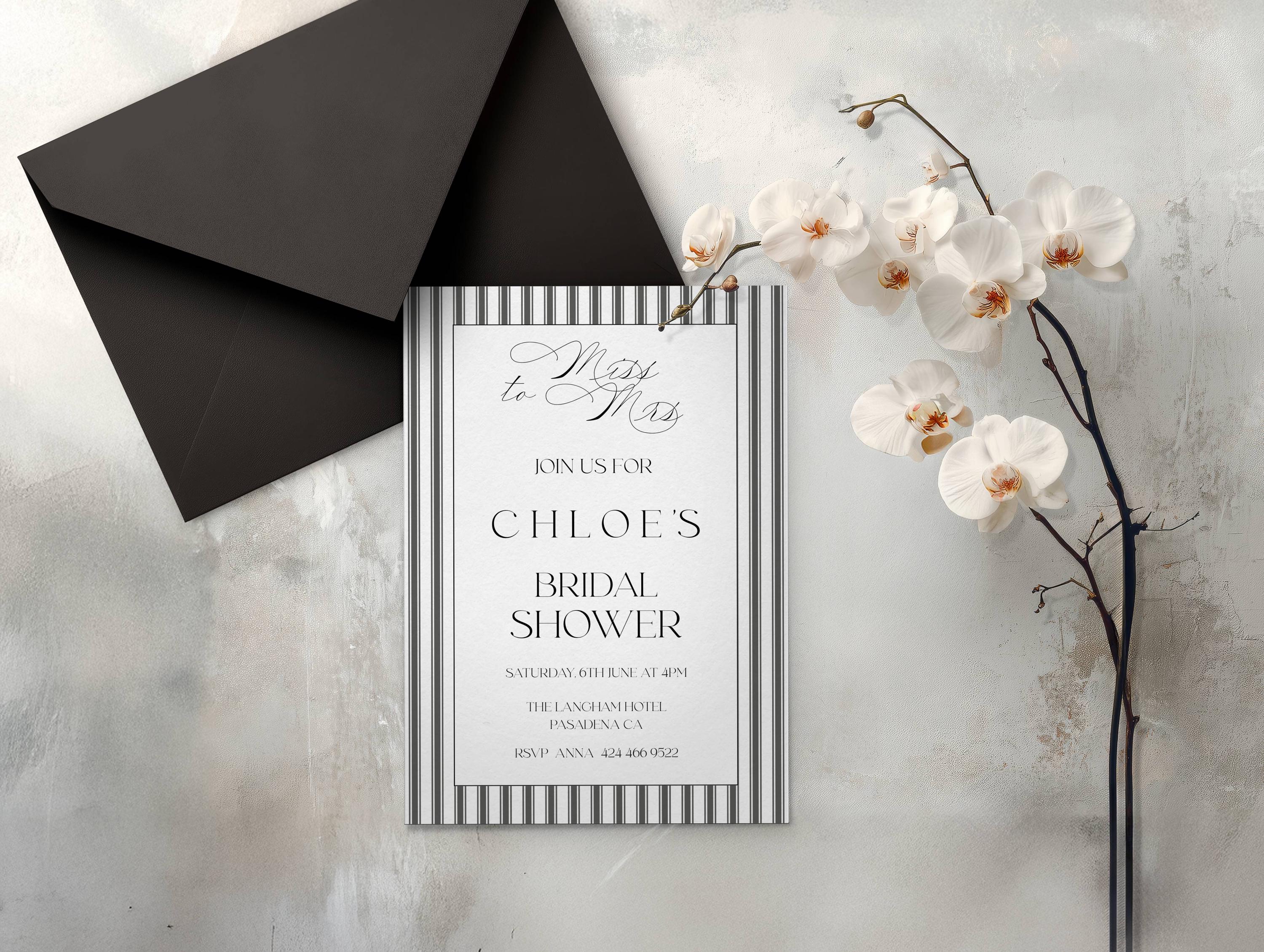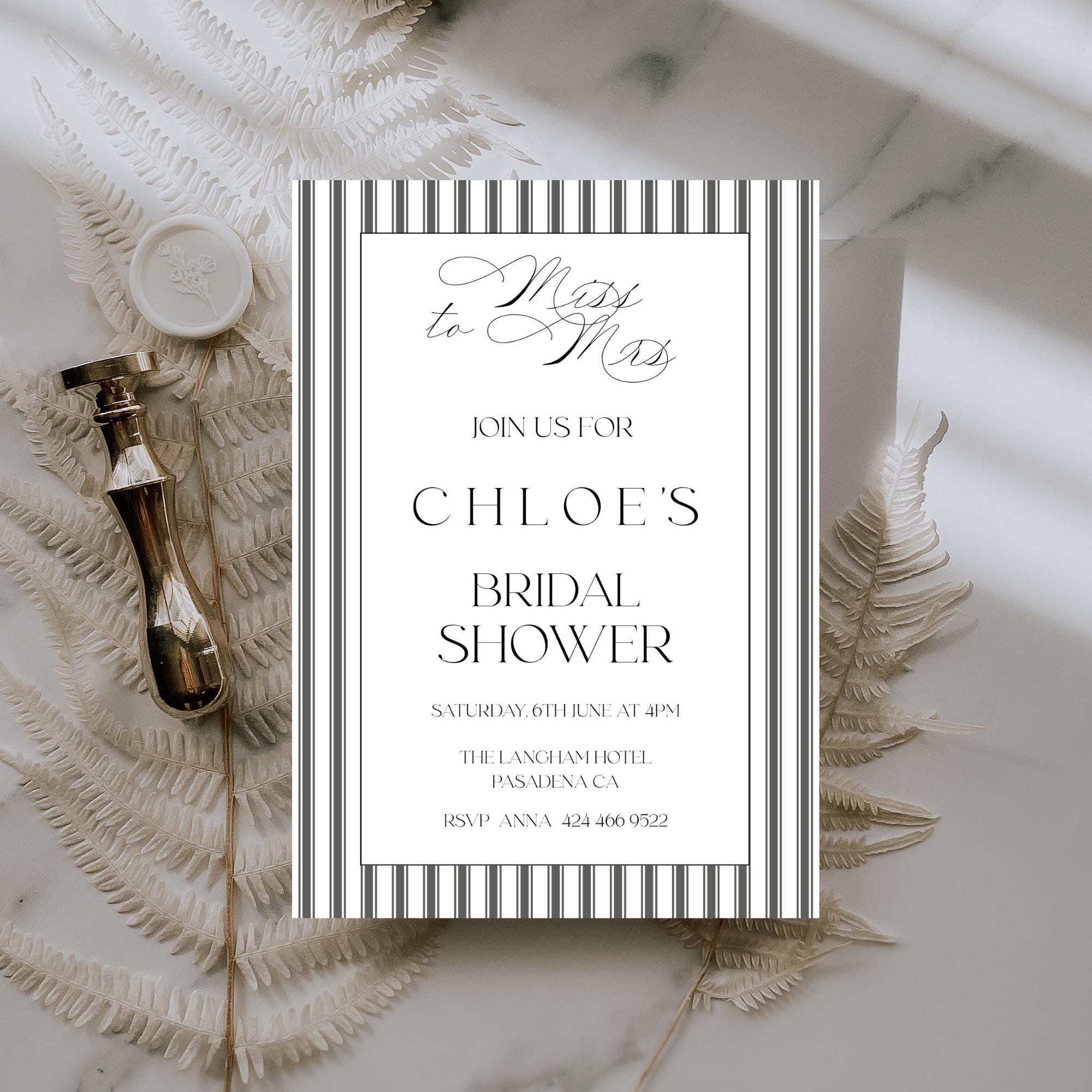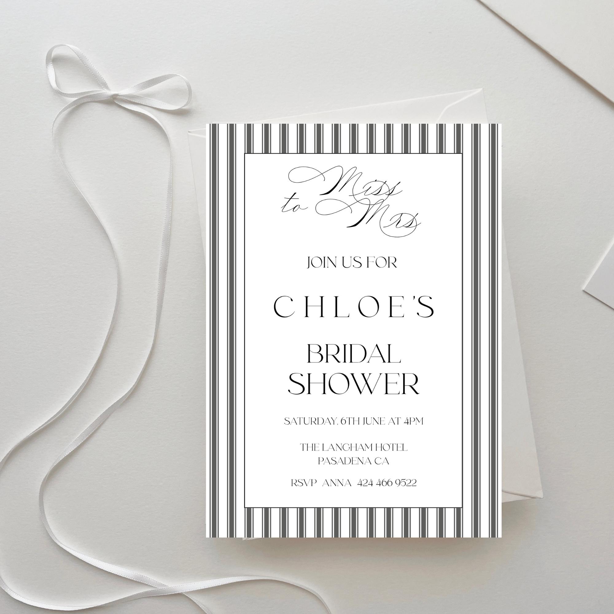 Elegant Striped Bridal Shower Invitation Template. An Instant download digital file for you to edit in your web browser with Templett straight after your purchase. Once personalized you are ready to print.