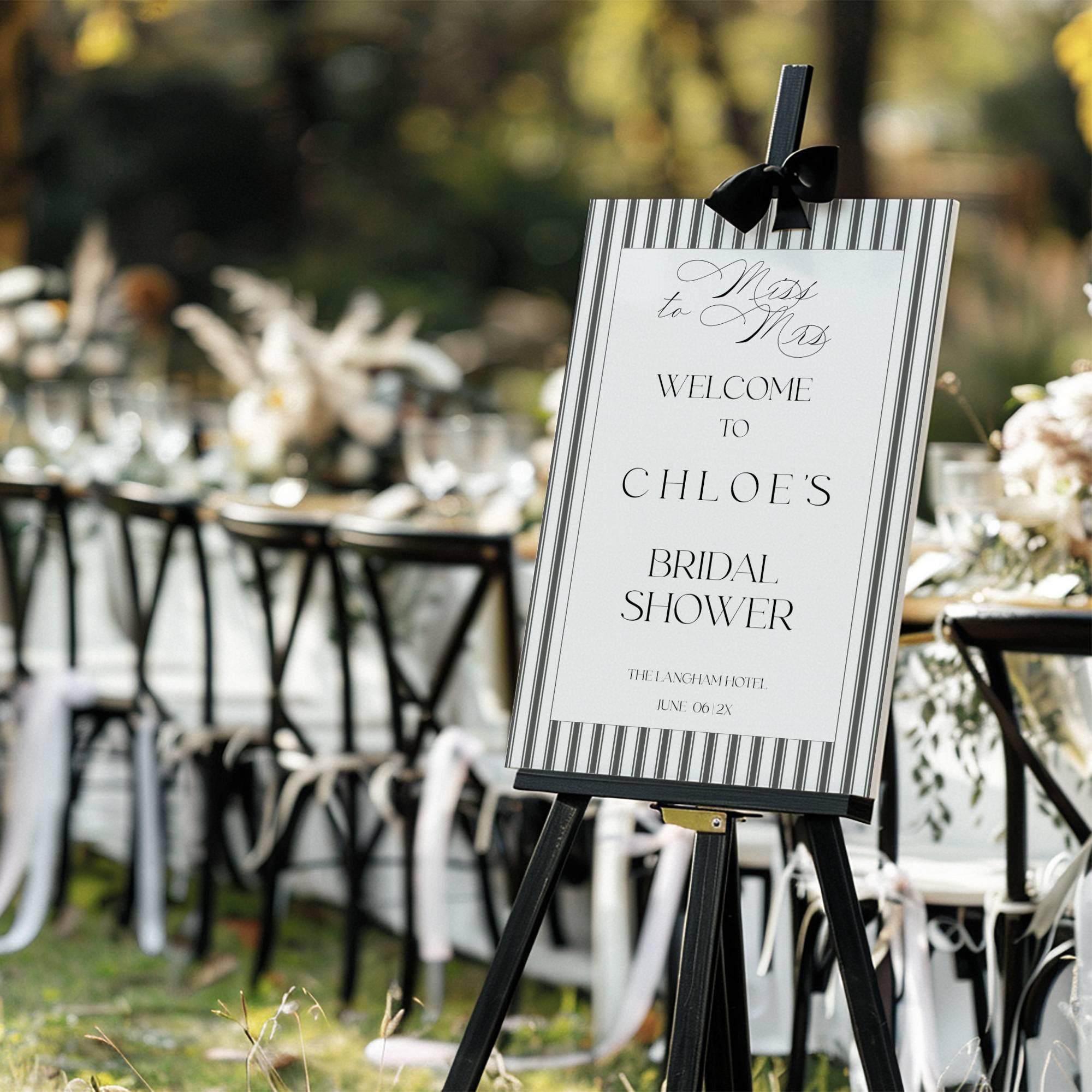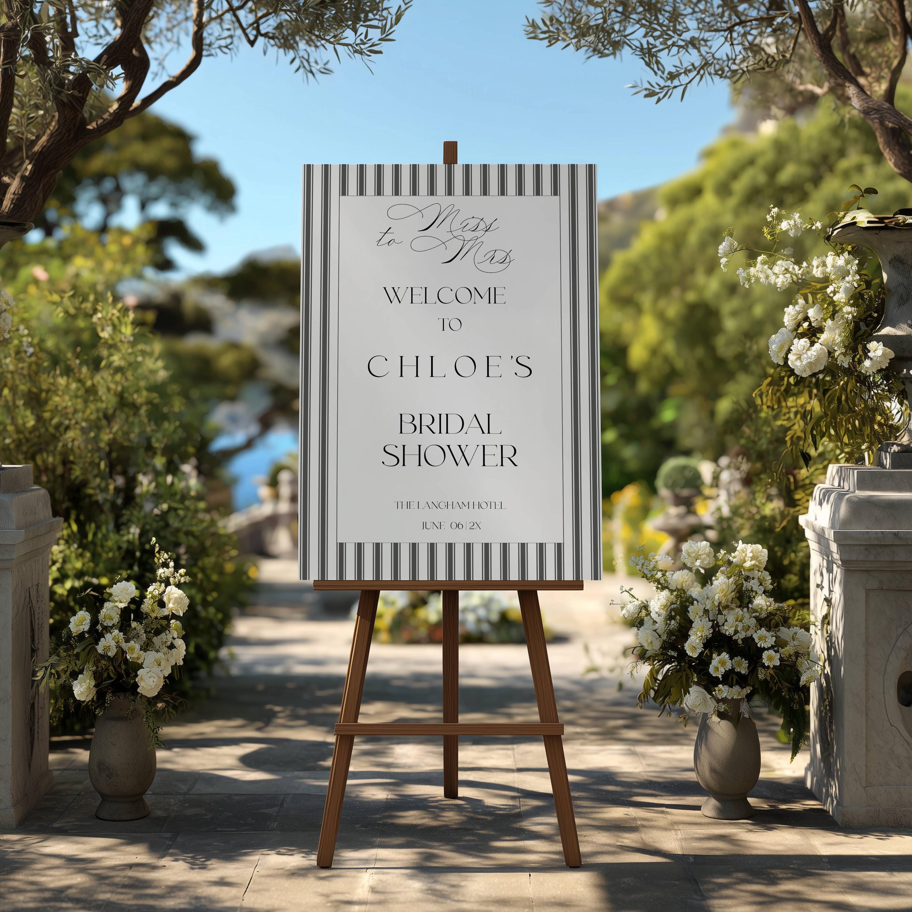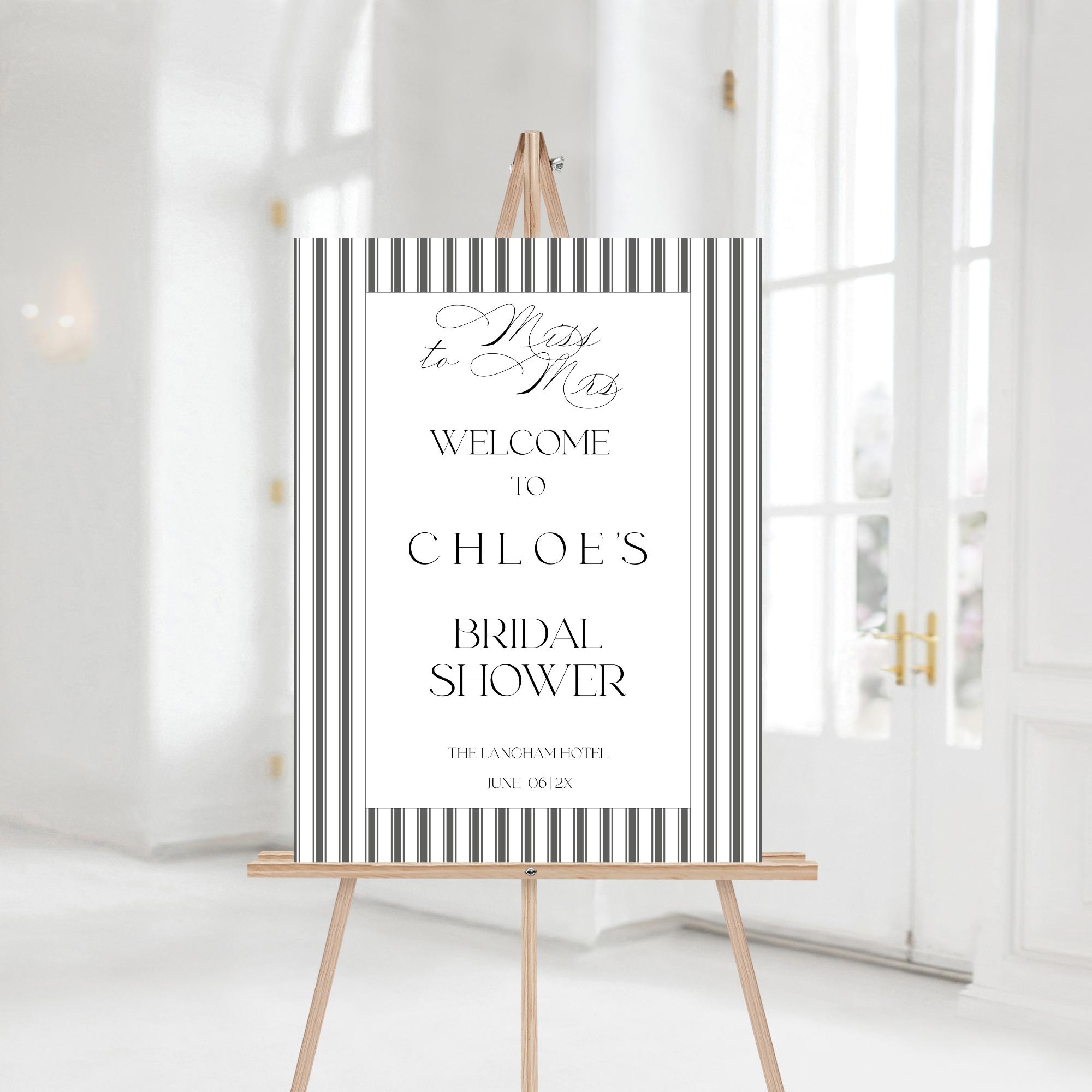 Elegant Striped Bridal Shower Welcome Sign Template. An Instant download digital file for you to edit in your web browser with Templett straight after your purchase. Once personalized you are ready to print.