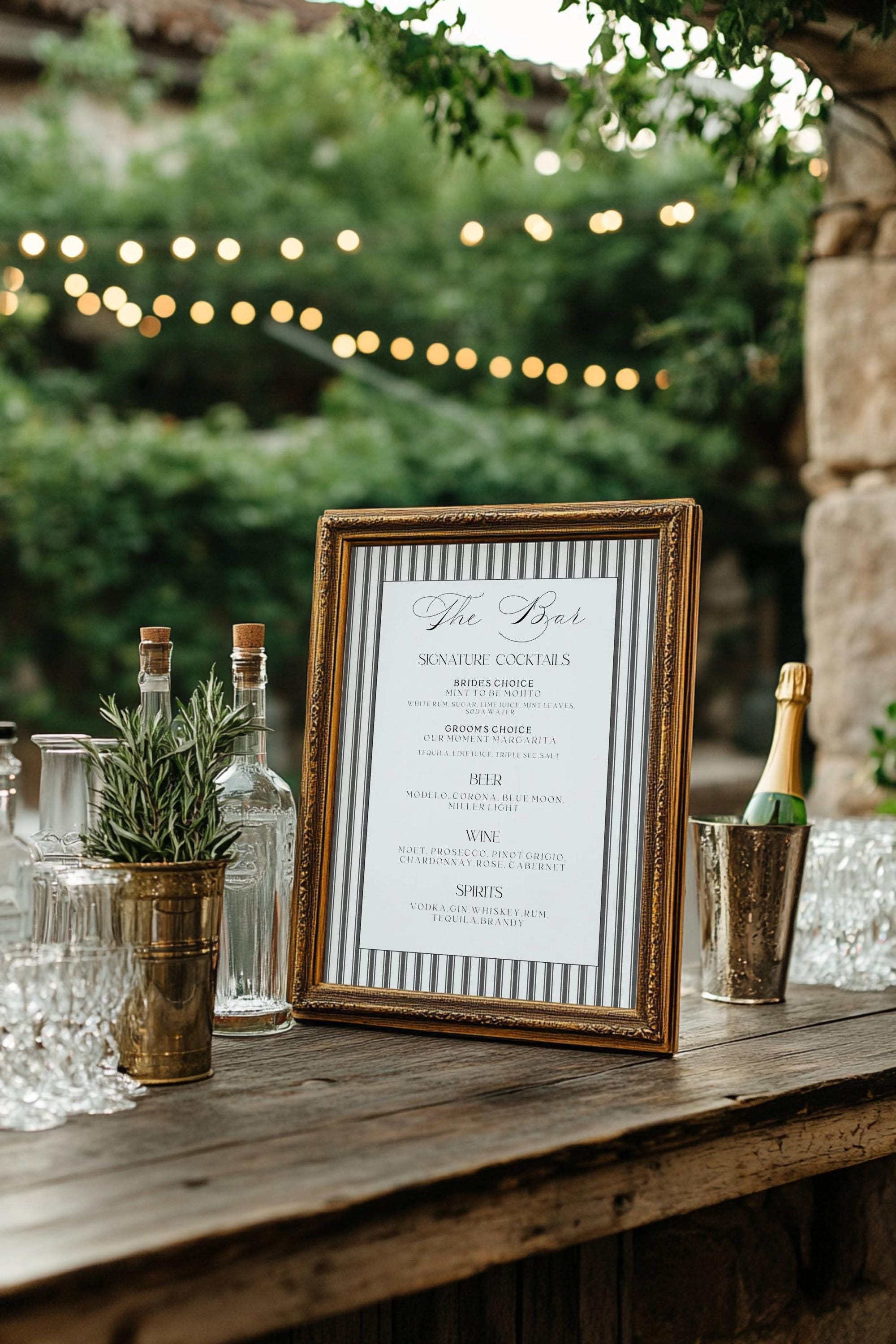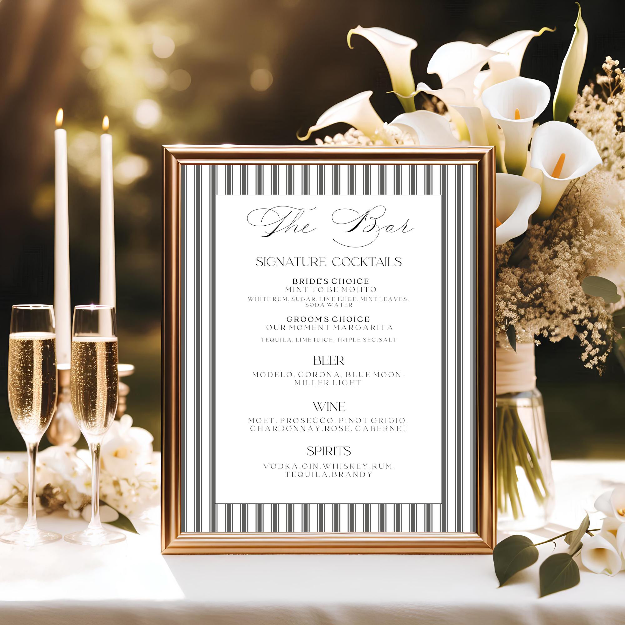 Elegant Pinstripe Wedding Bar Sign Template. An Instant download digital file for you to edit in your web browser with Templett straight after your purchase. Once personalized you are ready to print.