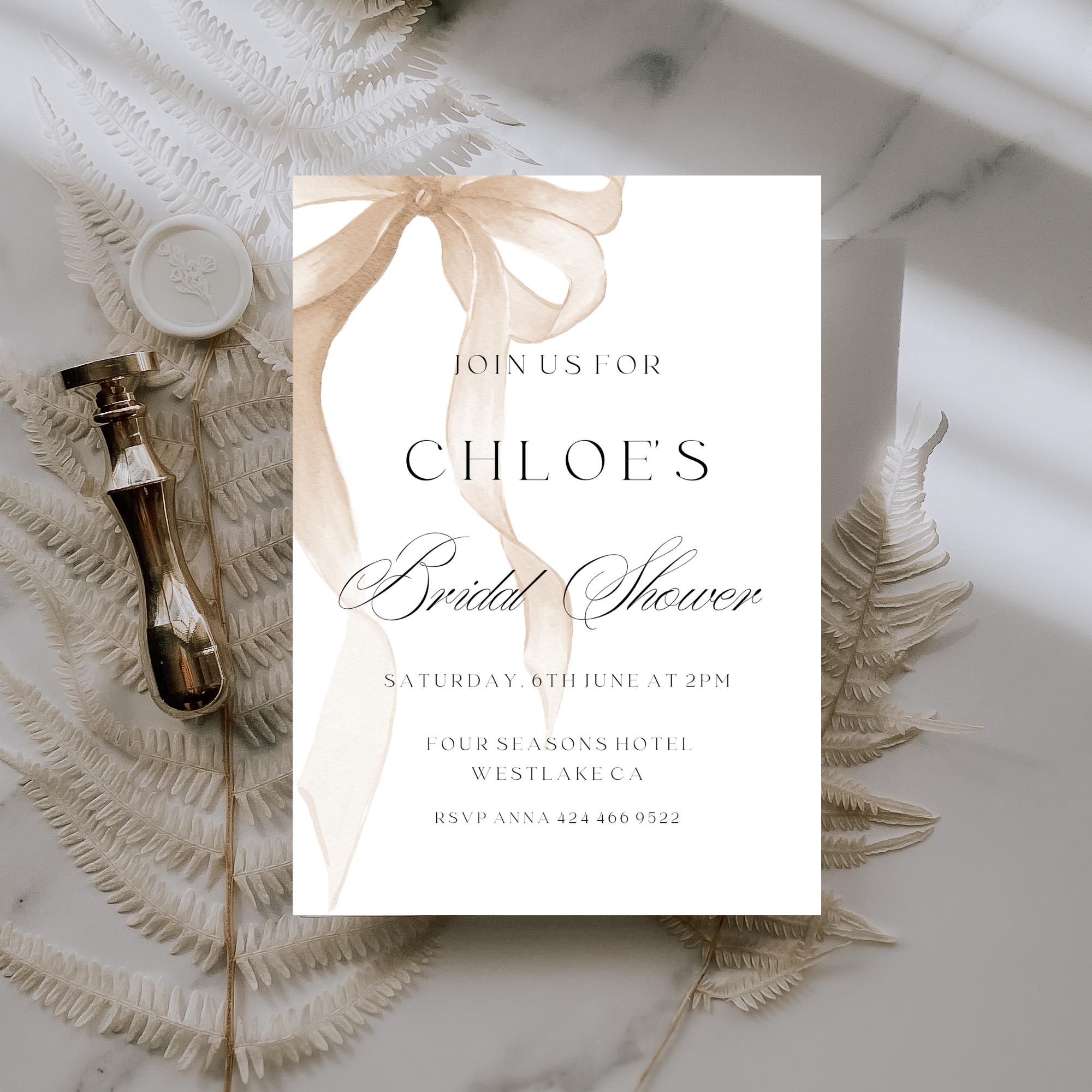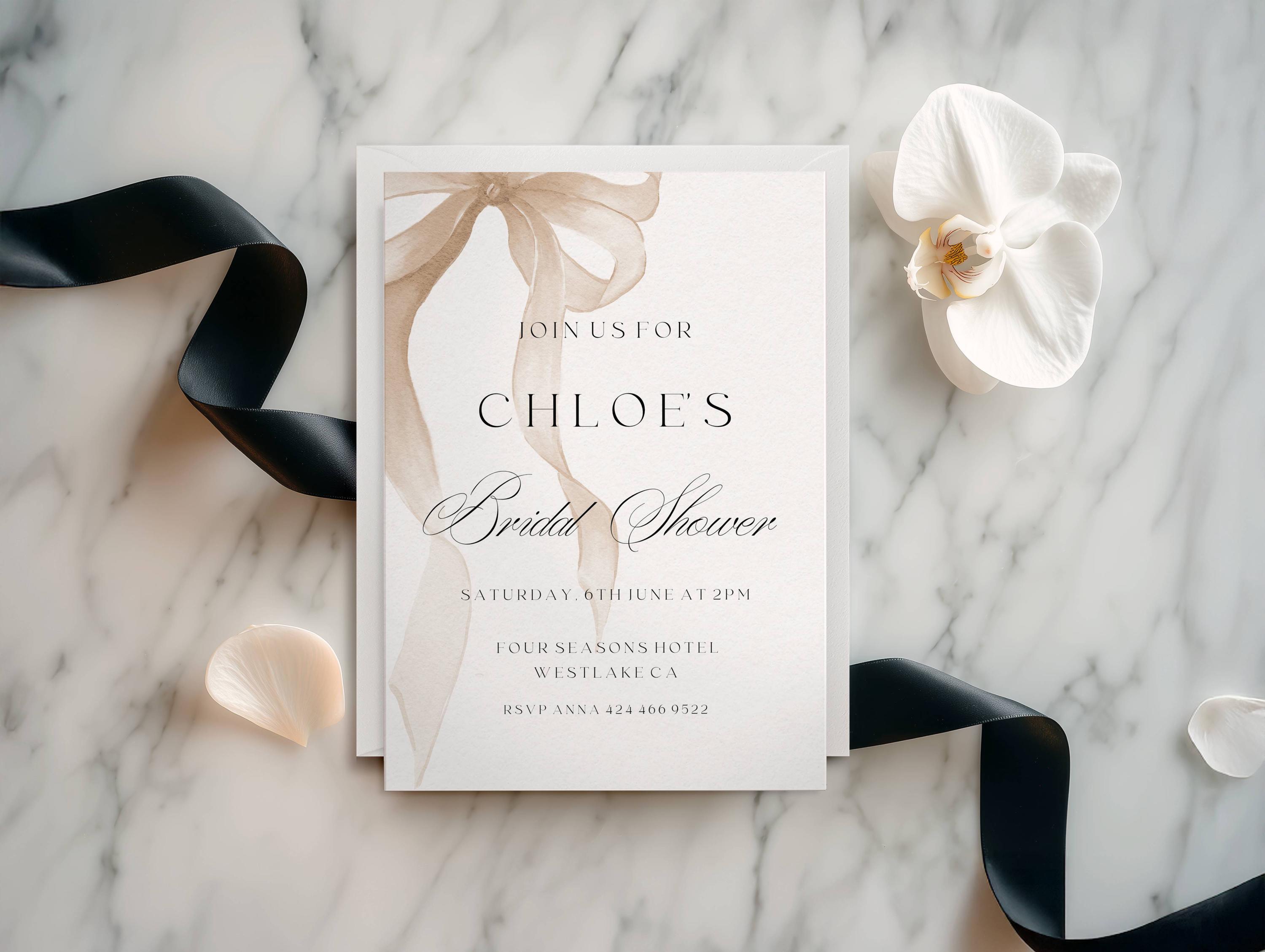 Elegant Beige Bow bridal Shower Invitation Template. An Instant download digital file for you to edit in your web browser with Templett straight after your purchase. Once personalized you are ready to print.
