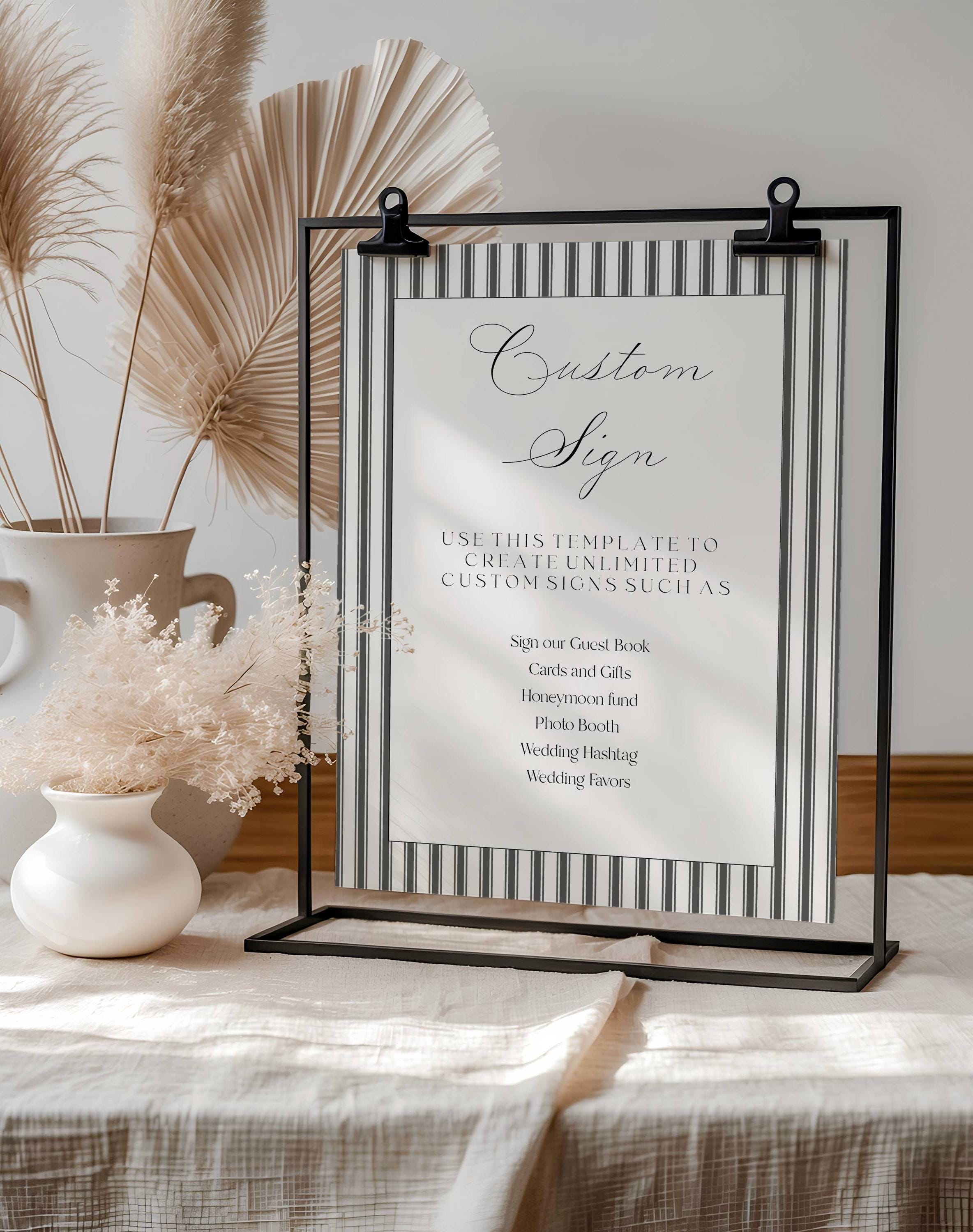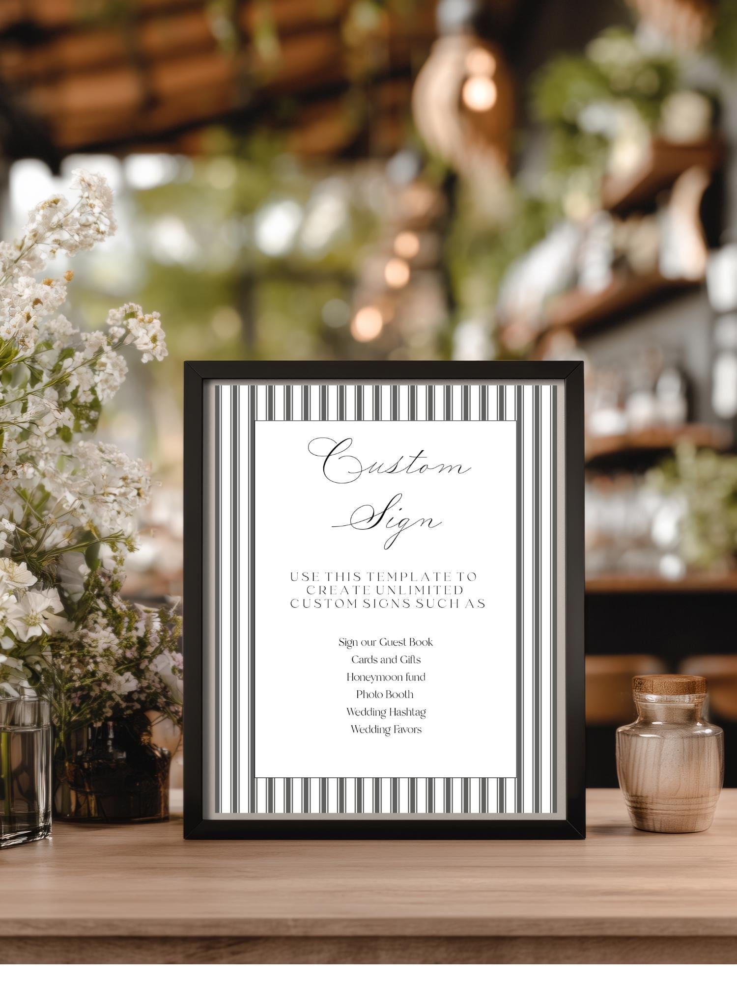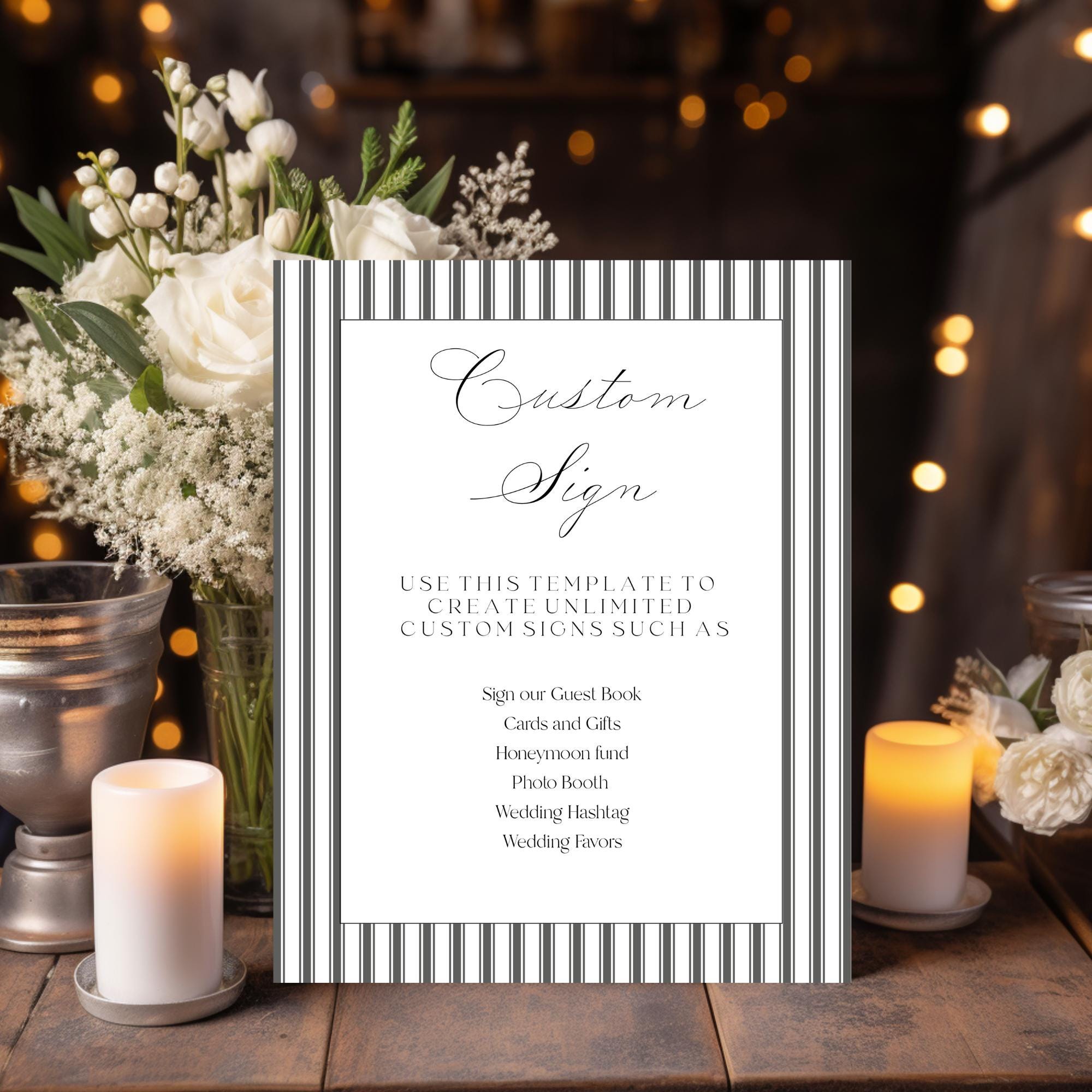 Elegant Pinstripe Wedding Custom Sign Template. An Instant download digital file for you to edit in your web browser with Templett straight after your purchase. Once personalized you are ready to print.