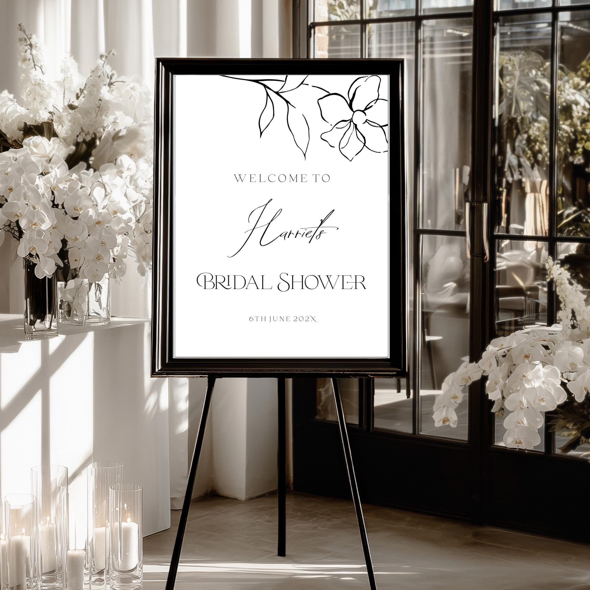 Modern Black and white Bridal Shower Welcome Sign Template. An Instant download digital file for you to edit in your web browser with Templett straight after your purchase. Once personalized you are ready to print.