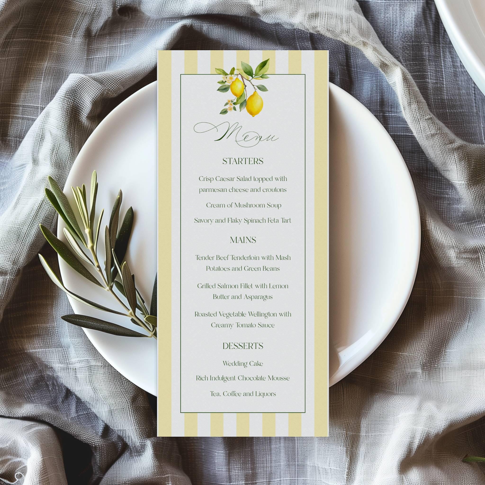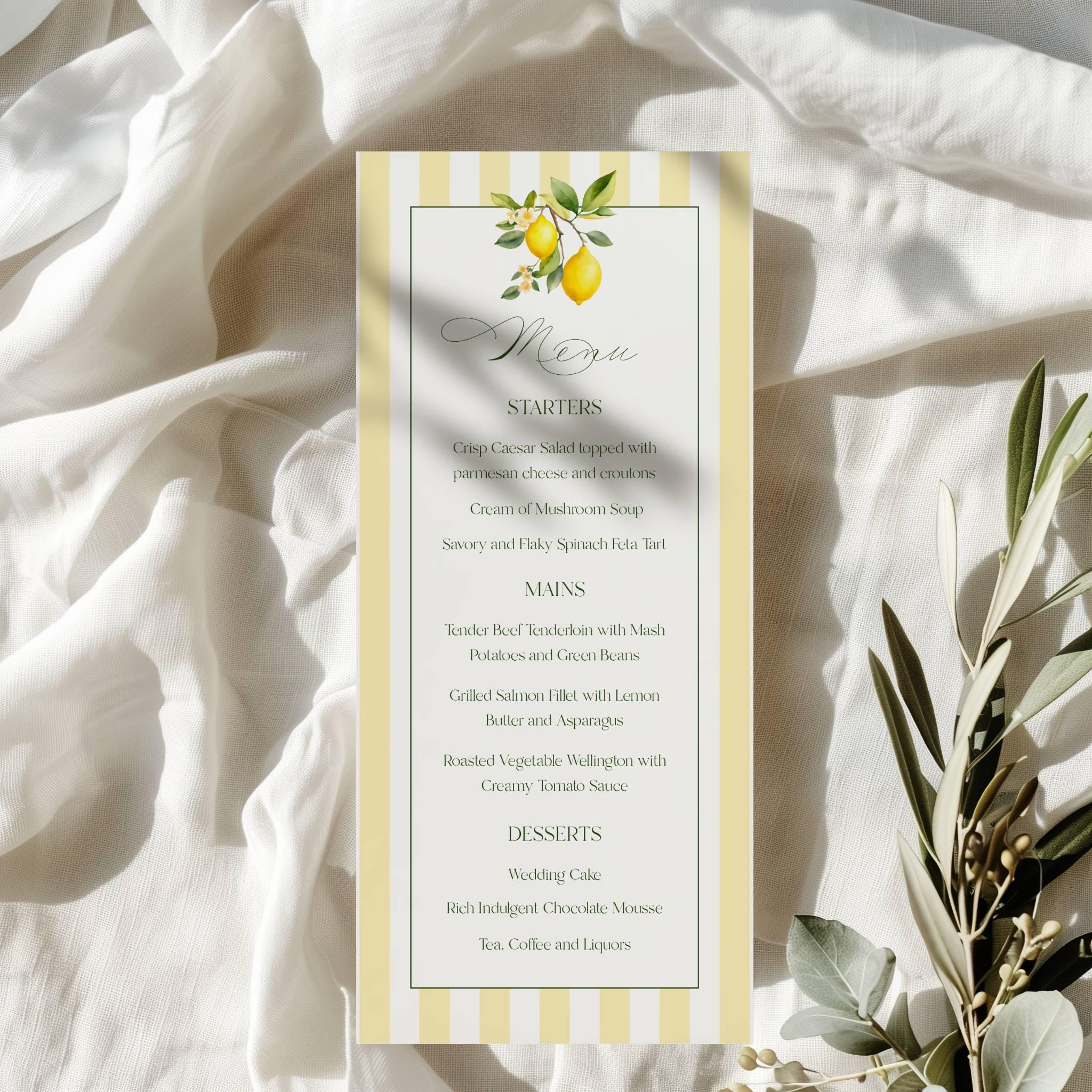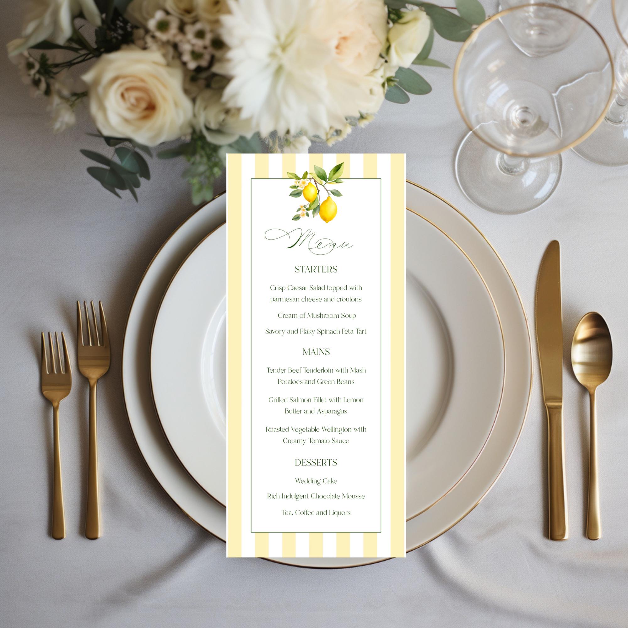 Lemons Menu Card Template. An Instant download digital file for you to edit in your web browser with Templett straight after your purchase. Once personalized you are ready to print.