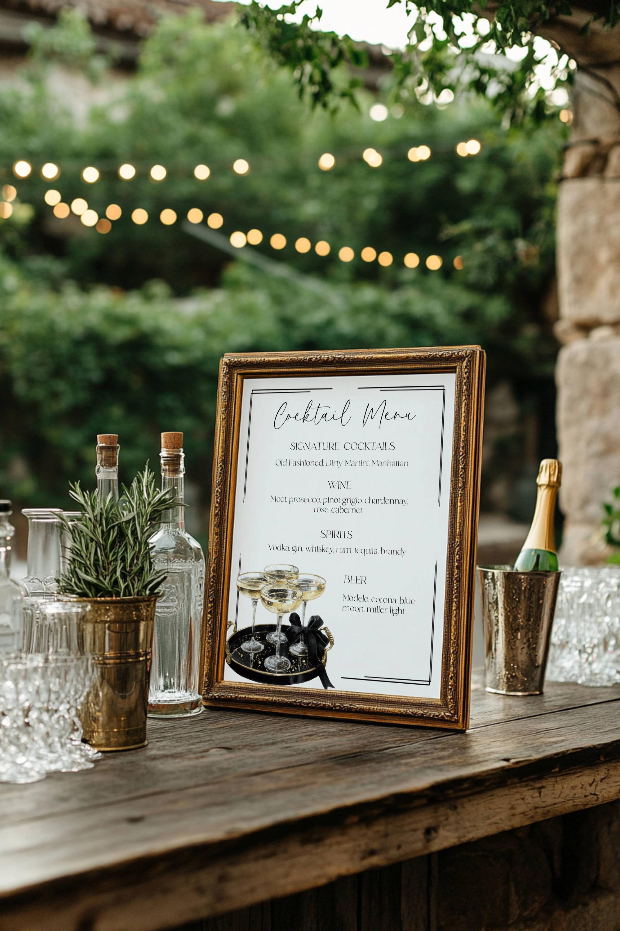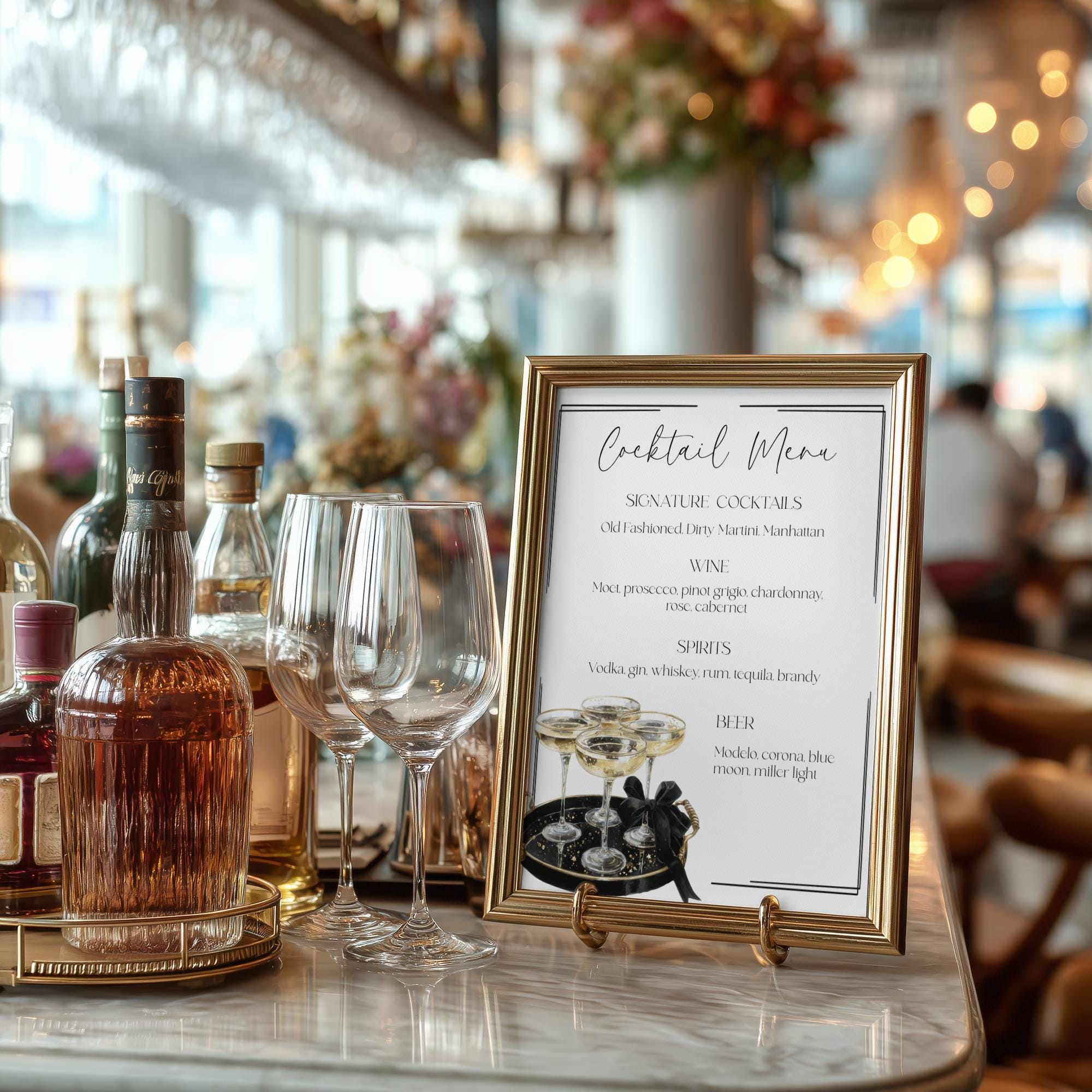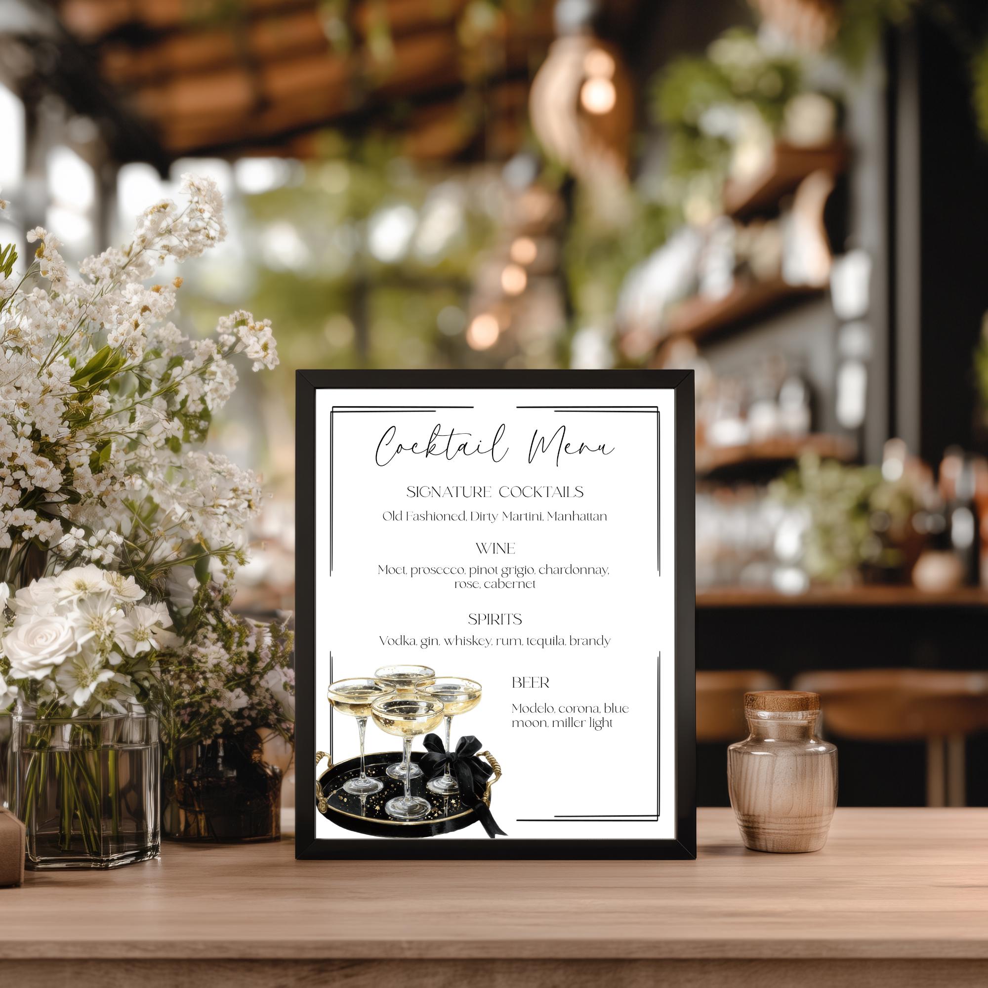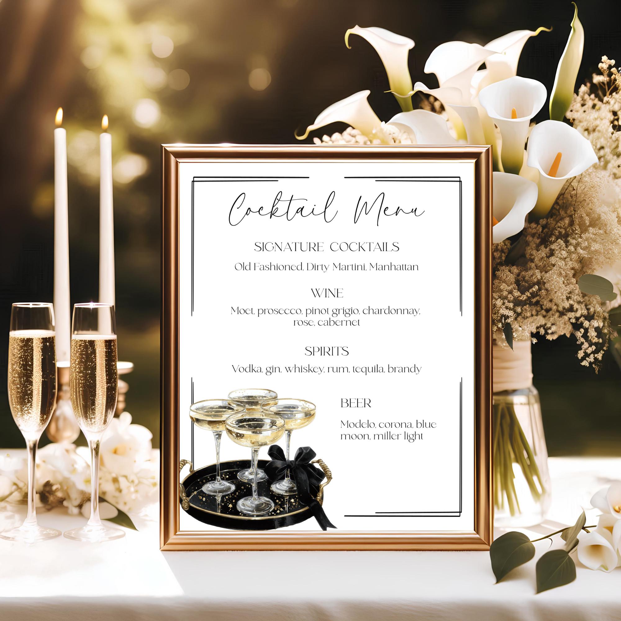 Elegant Champagne Wedding Bar Sign Template. An Instant download digital file for you to edit in your web browser with Templett straight after your purchase. Once personalized you are ready to print.