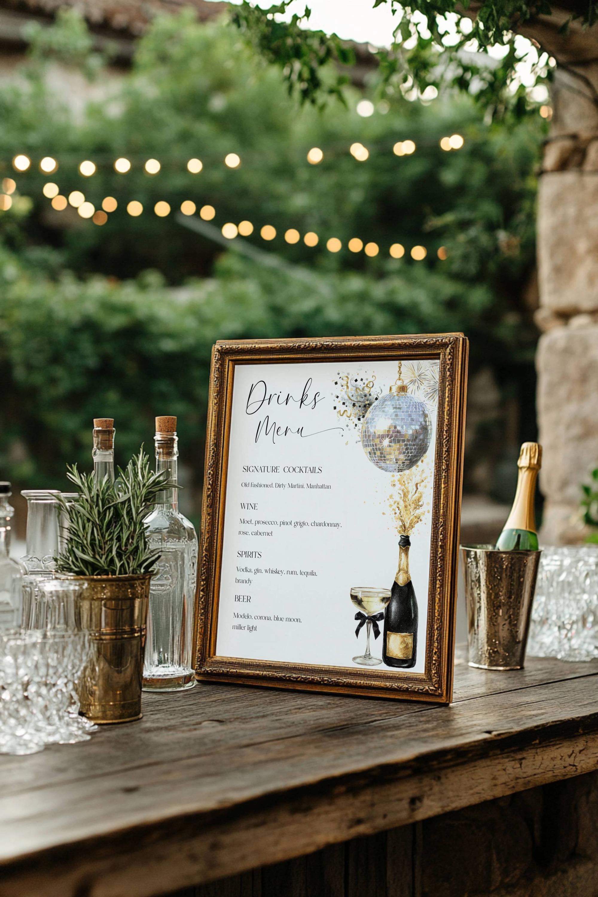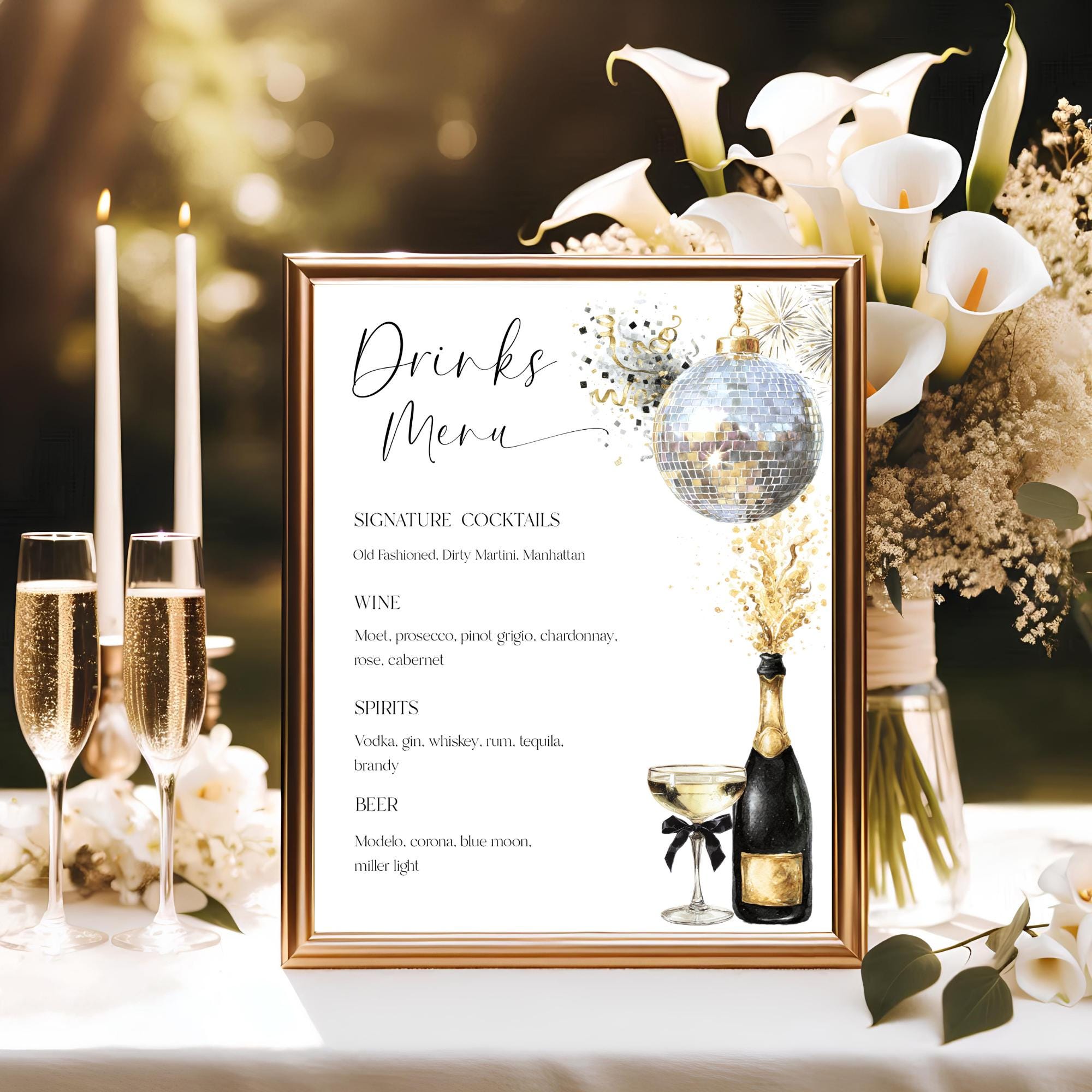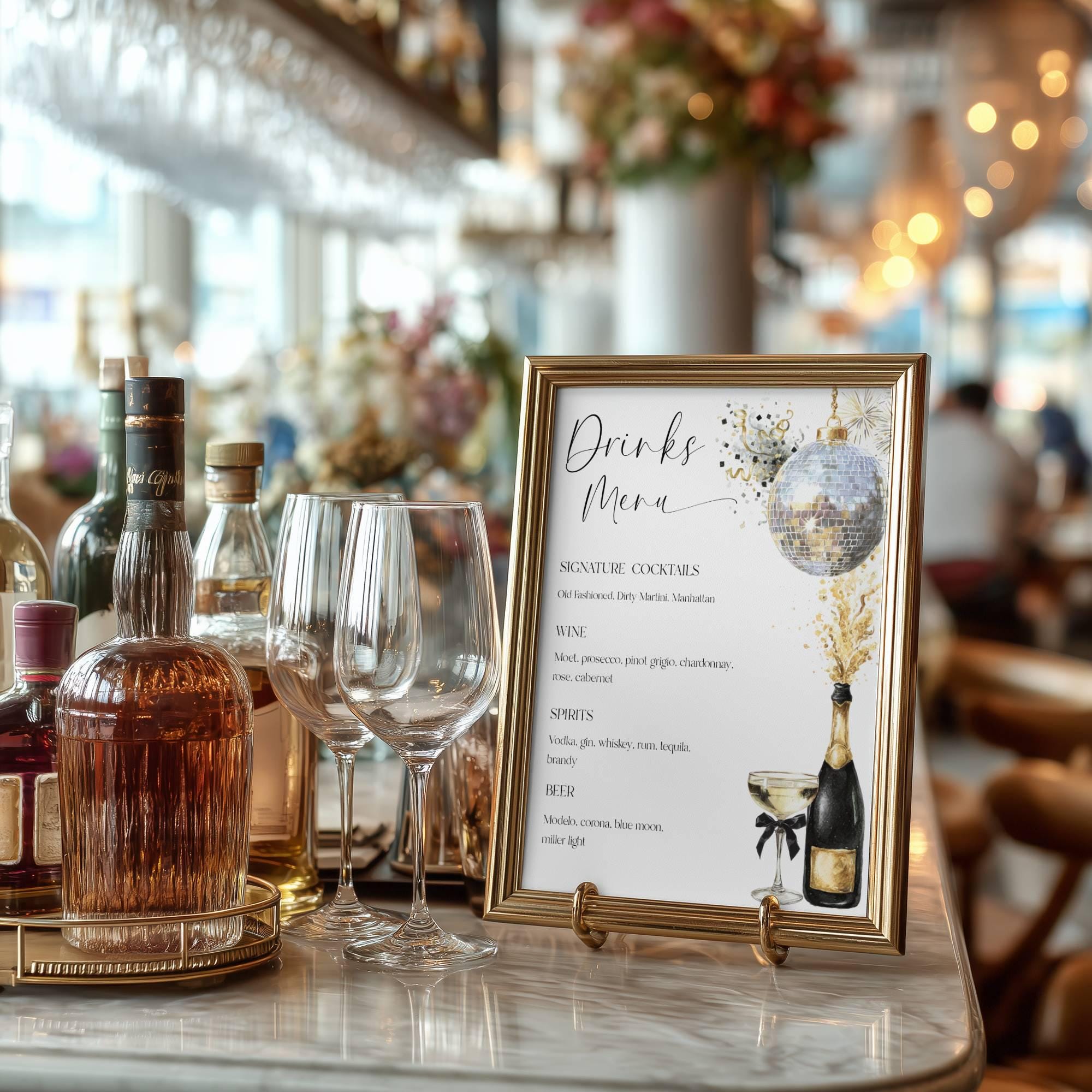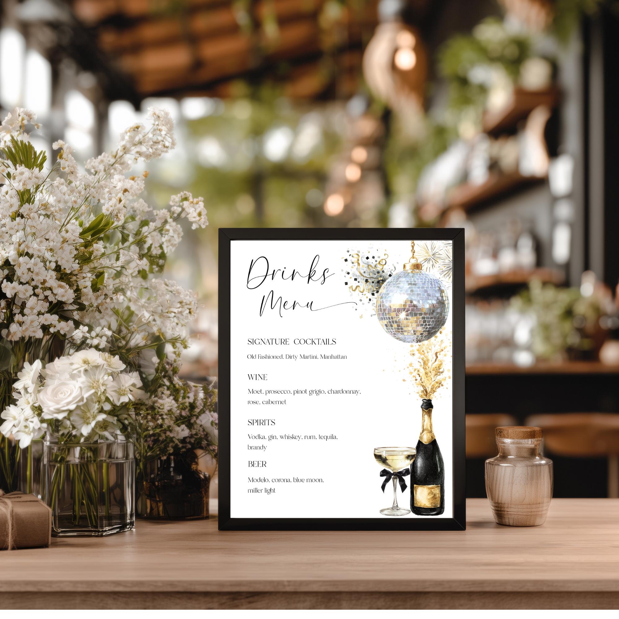 Champagne Celebration Drinks Menu Template. An Instant download digital file for you to edit in your web browser with Templett straight after your purchase. Once personalized you are ready to print.