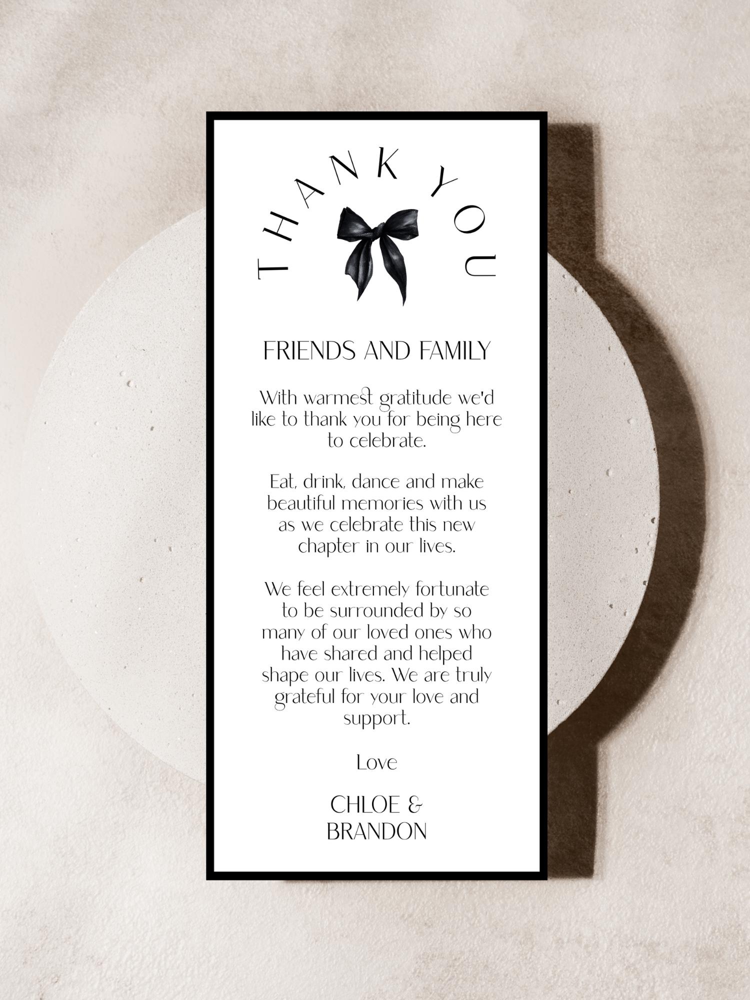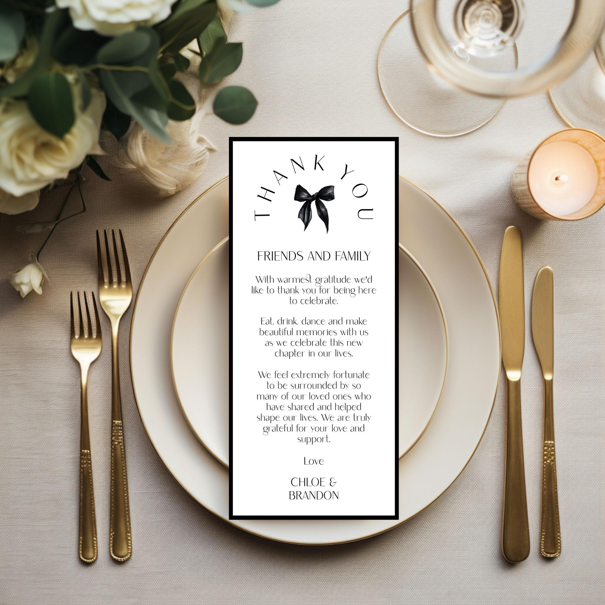 Black Bow Wedding Thank You Card Template. An Instant download digital file for you to edit in your web browser with Templett straight after your purchase. Once personalized you are ready to print.