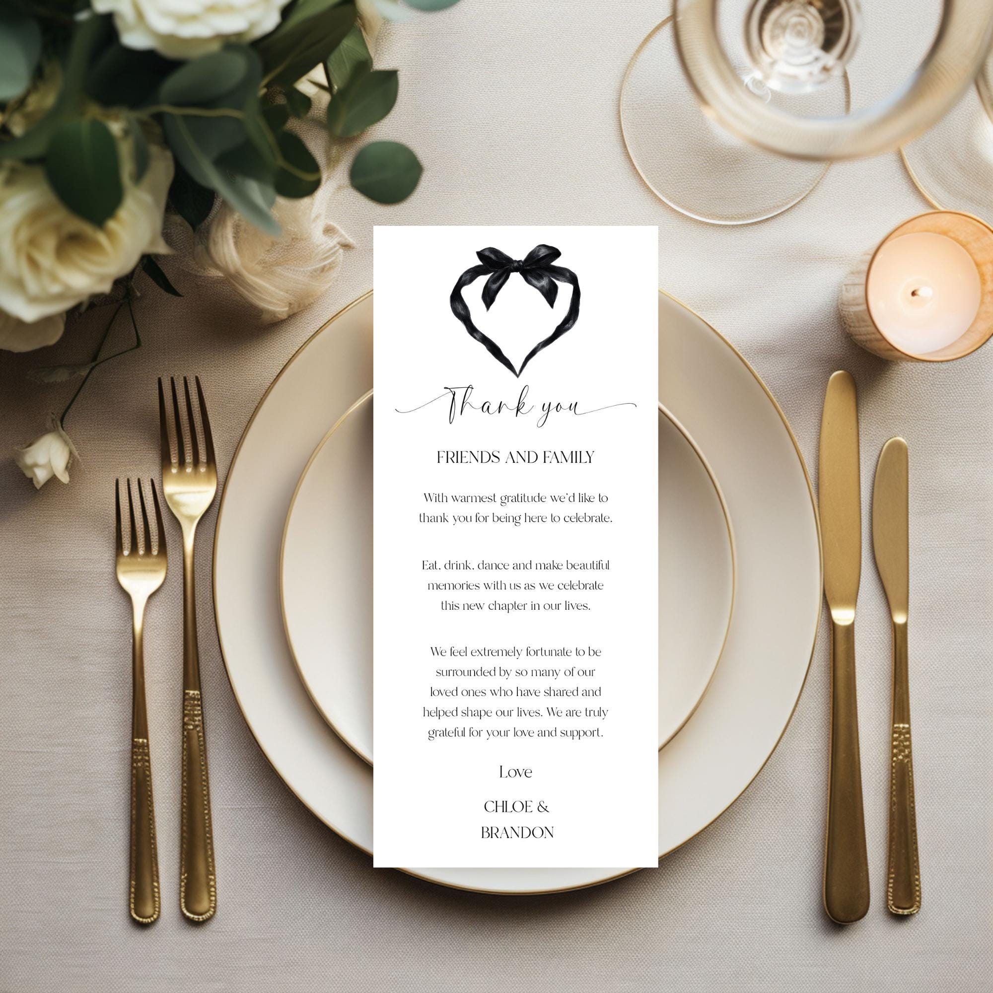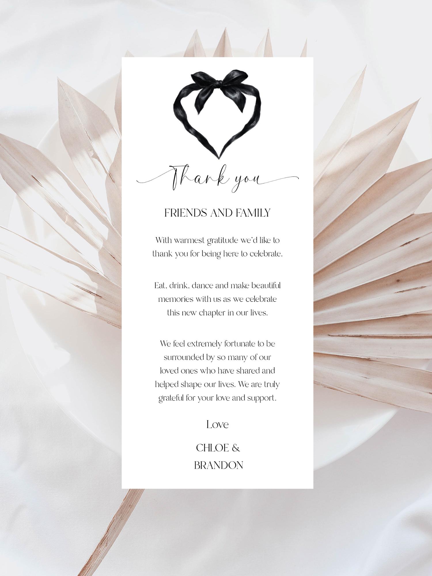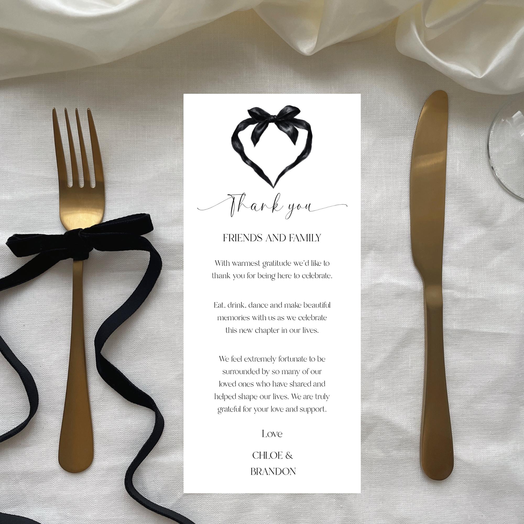 Black Bow Wedding Thank You Place Card Template. An Instant download digital file for you to edit in your web browser with Templett straight after your purchase. Once personalized you are ready to print.