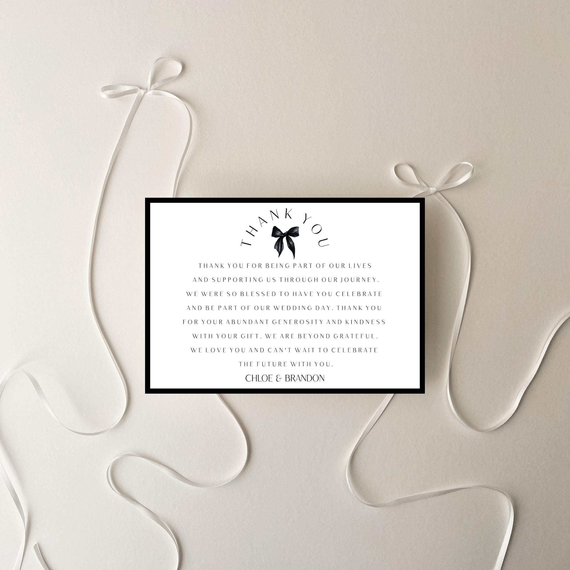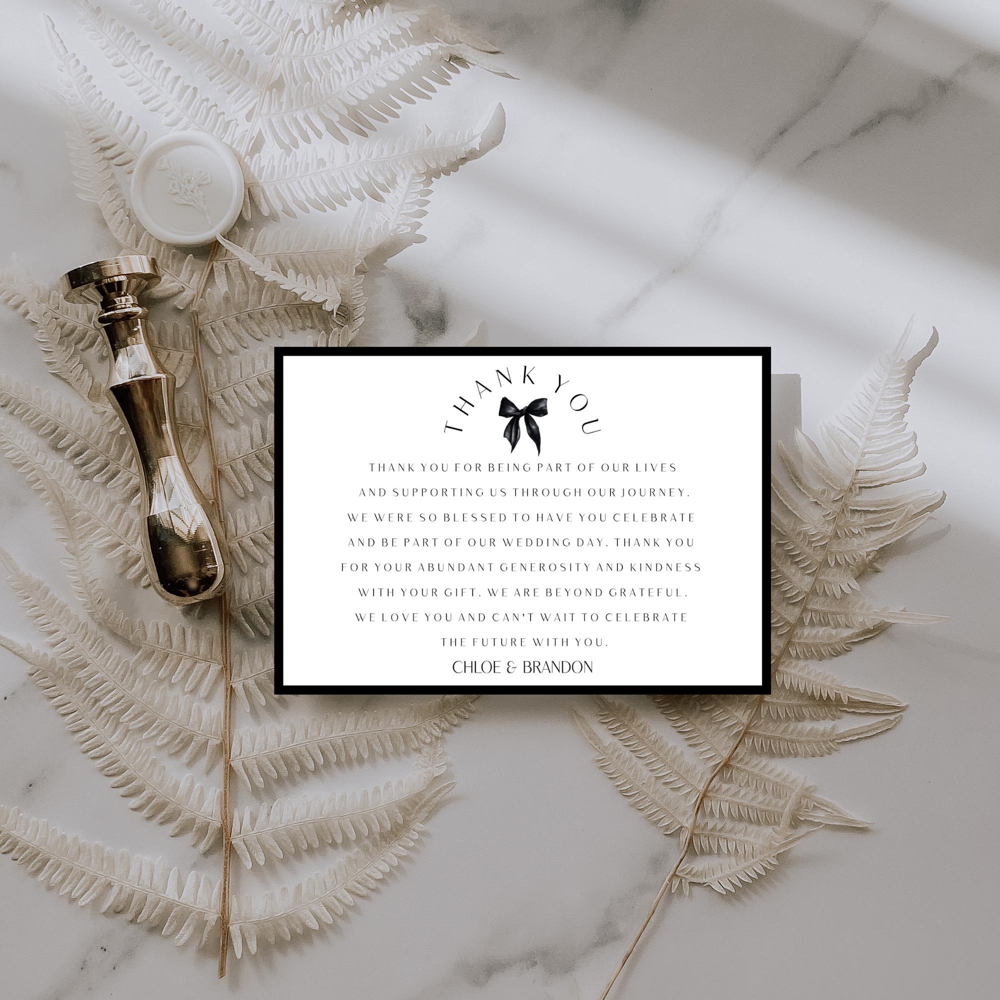 Black Bow Wedding Thank You Card Template. An Instant download digital file for you to edit in your web browser with Templett straight after your purchase. Once personalized you are ready to print.