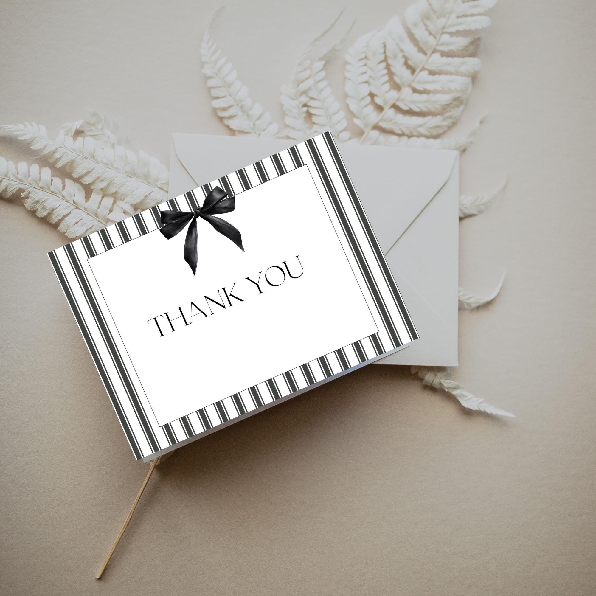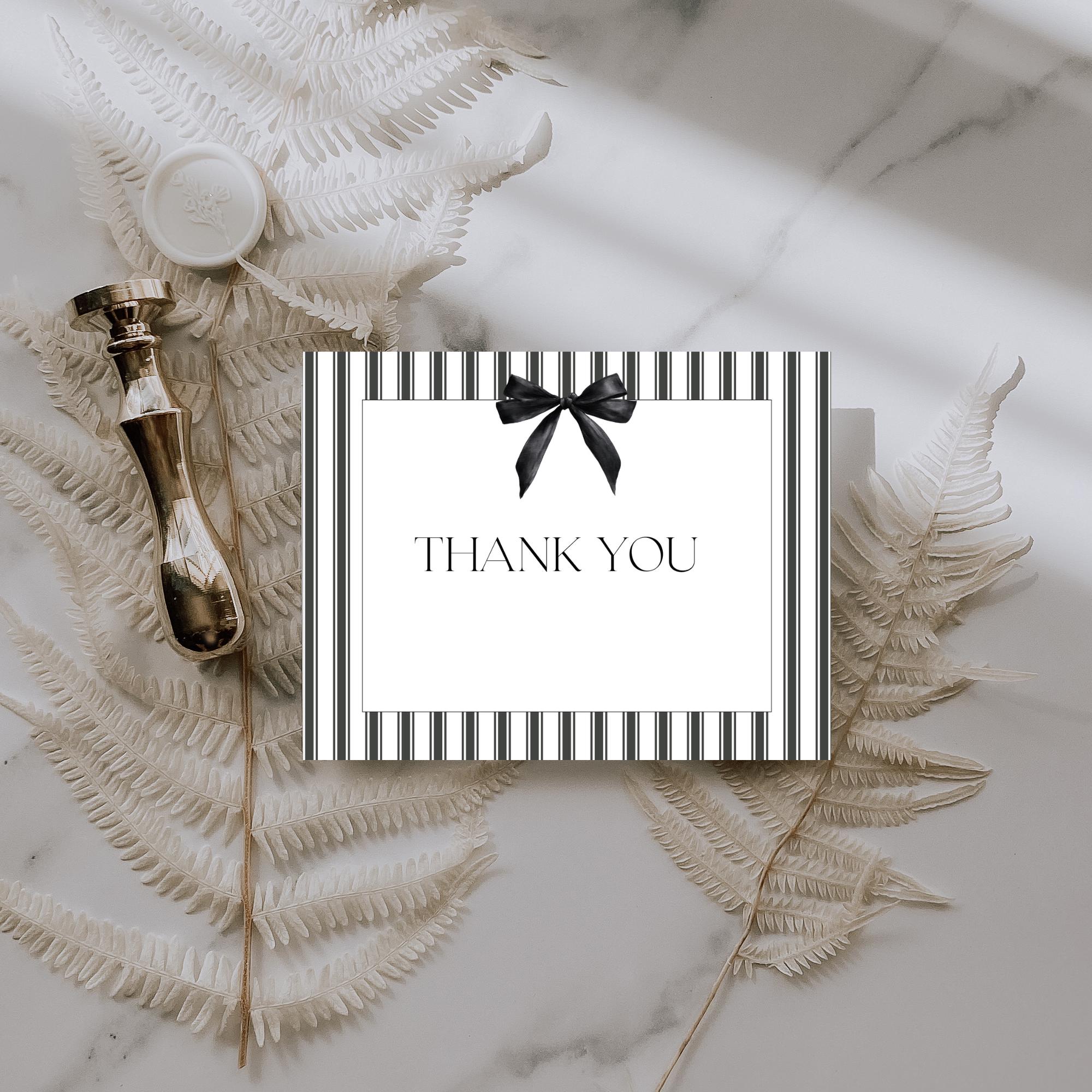 Modern Black Bow Thank You Card Template. An Instant download digital file for you to edit in your web browser with Templett straight after your purchase. Once personalized you are ready to print.