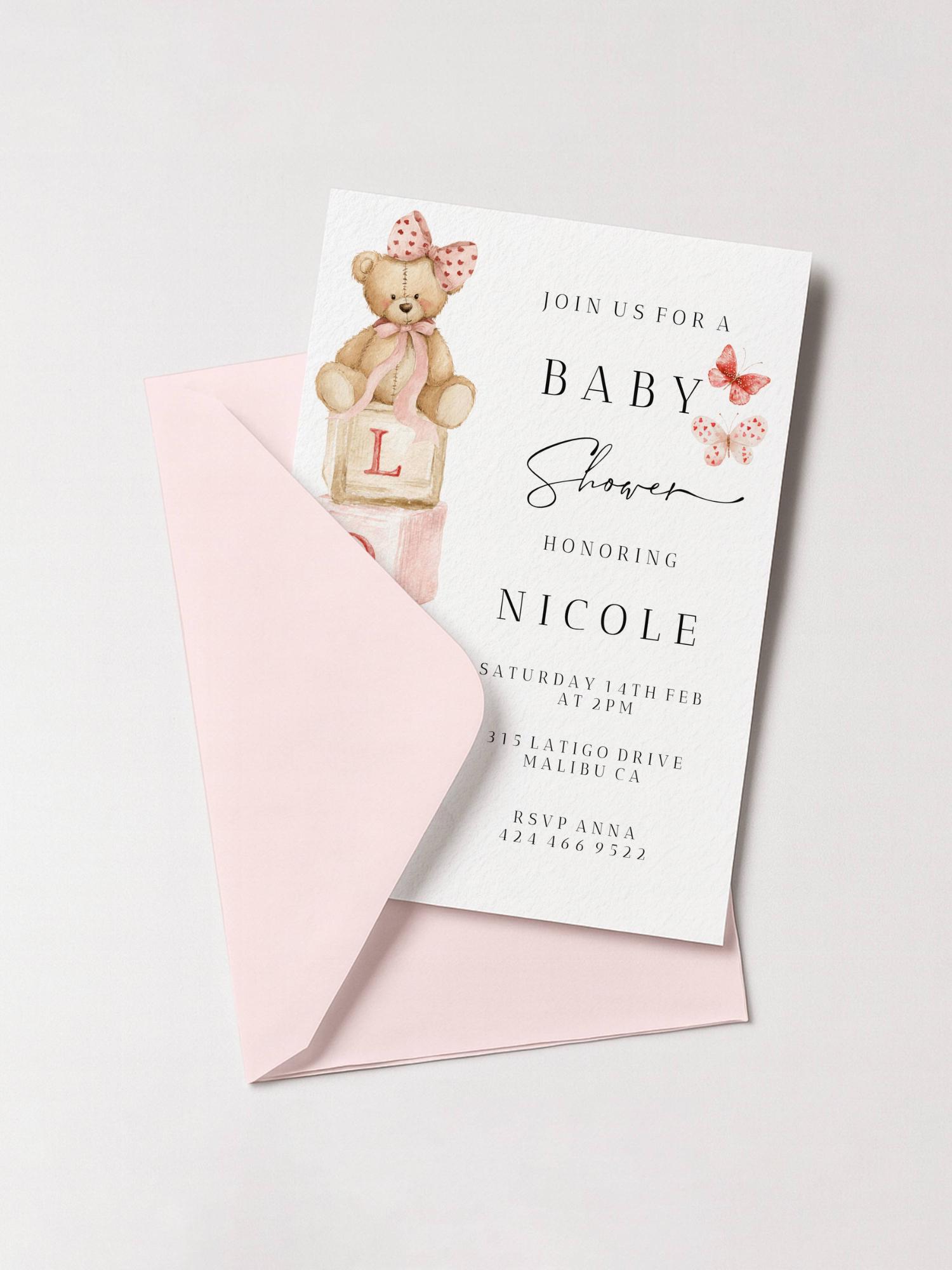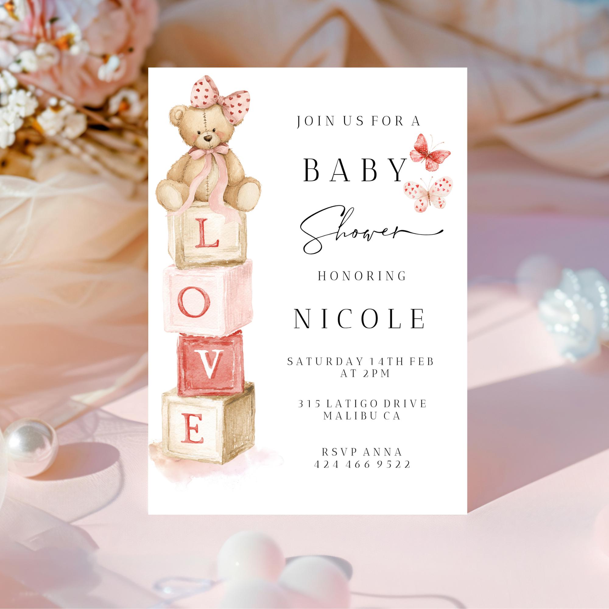 Modern LOVE Valentines Baby Shower Invitation Set Template. An Instant download digital file for you to edit in your web browser with Templett straight after your purchase. Once personalized you are ready to print.
