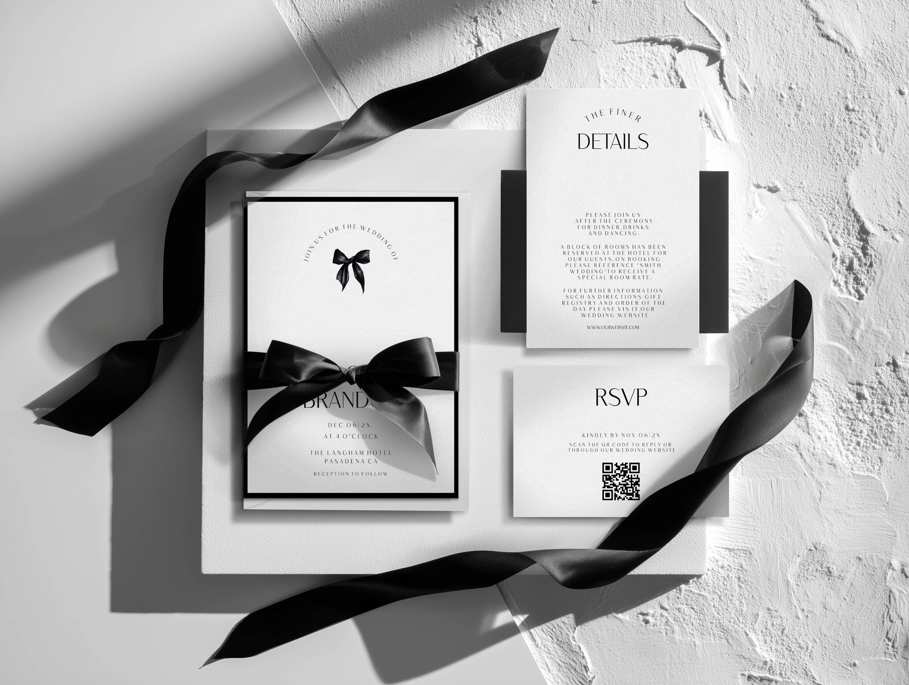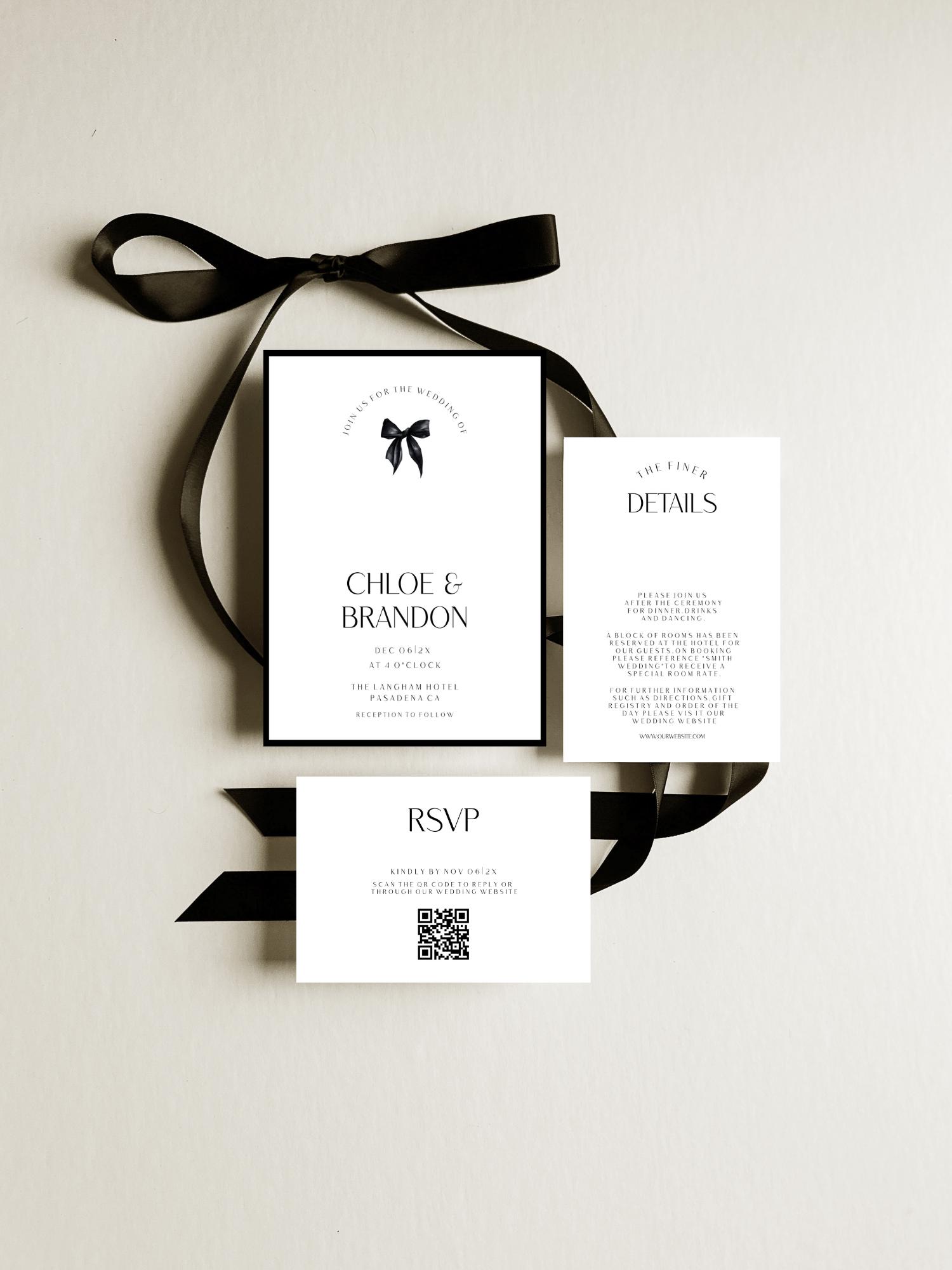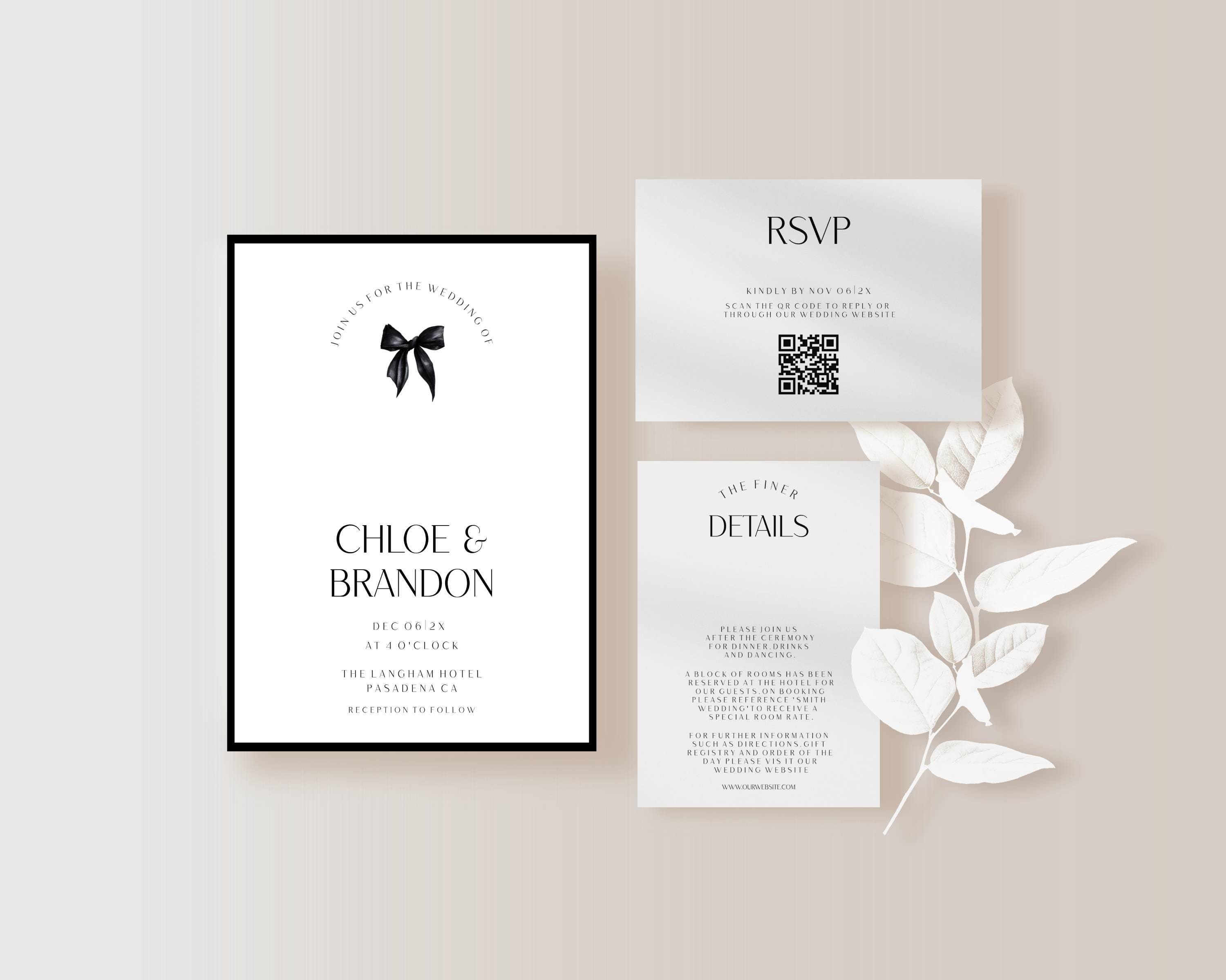 Minimalist Black Bow Wedding Invitation Suite: Template. An Instant download digital file for you to edit in your web browser with Templett straight after your purchase. Once personalized you are ready to print.